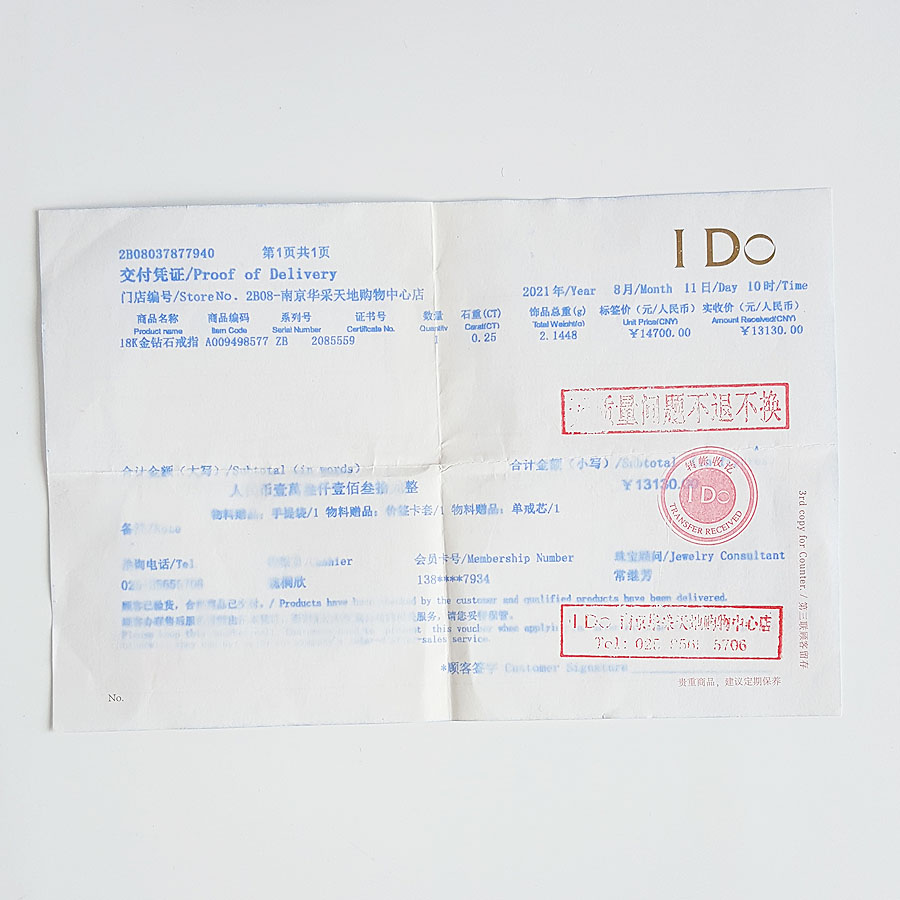 【天然正品】I DOAU750白金时尚简约四爪款0.25克拉钻石戒指10.5号(戒圈可改)女士现售价:2880!240725NJS05