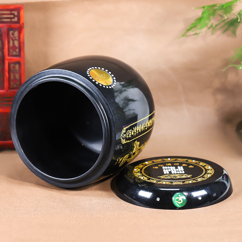 天然玉石骨灰坛黑色彩绘阿弥陀佛骨灰桶骨灰坛22.5*23cm