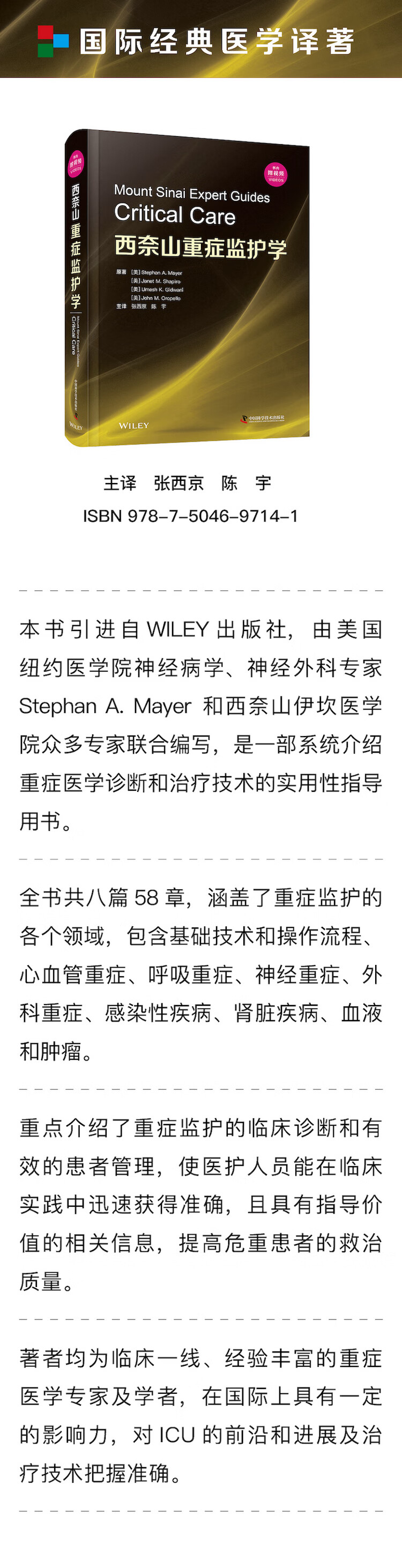 本书引进自 WILEY 出版社,由美国纽约医学院神经病学和神经外科专家 Stephan A. Mayer 和西奈山伊坎医学院肺科、重症监护科、心脏病科、肝病科、重症外科等著名专家联合编写,是一部系统介绍重症医学诊断和治疗技术的实用性指导用书。全书共八篇 58 章,涵盖了重症监护的各个领域,包含基础技术和操作流程、心血管重症、呼吸重症、神经重症、外科重症、感染性疾病、肾脏疾病、血液和肿瘤。重点介绍了重症监护的临床诊断和有效的患者管理,使医护人员能在临床实践中迅速获得准确且具有指导价值的相关信息,提高危重患者的救治质量。本书内容丰富,紧扣临床,条理分明,便于速查和系统学习,可作为重症医学相关专业学生及临床工作者的参考用书。