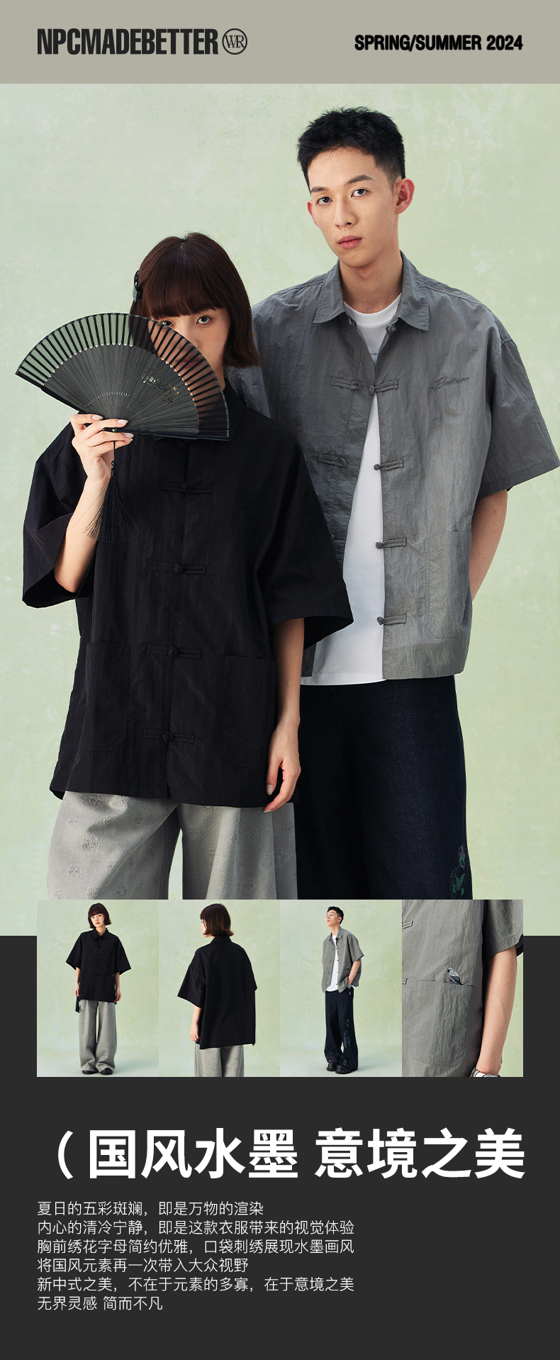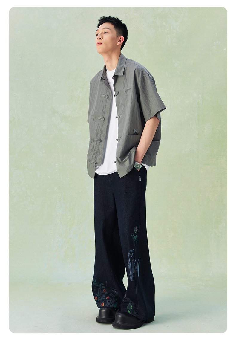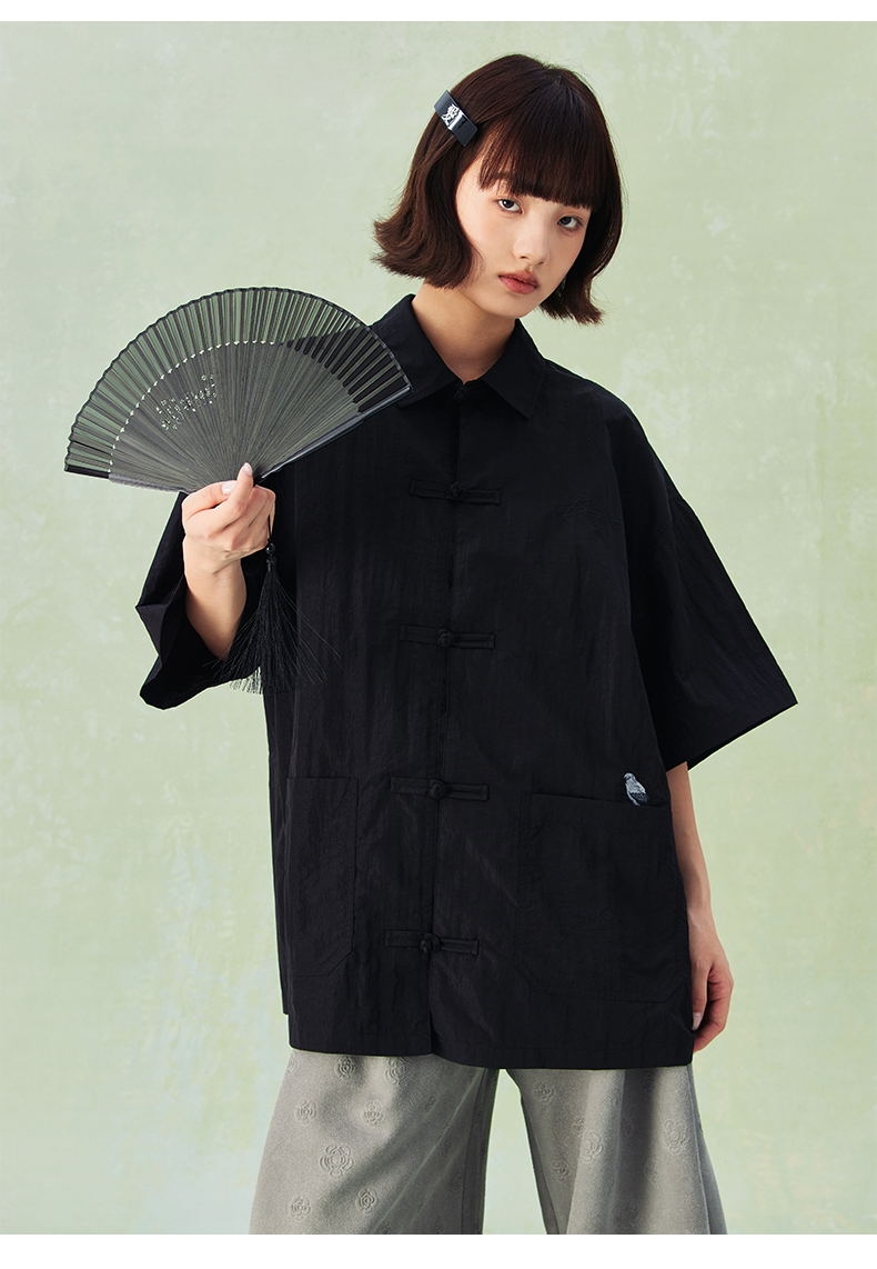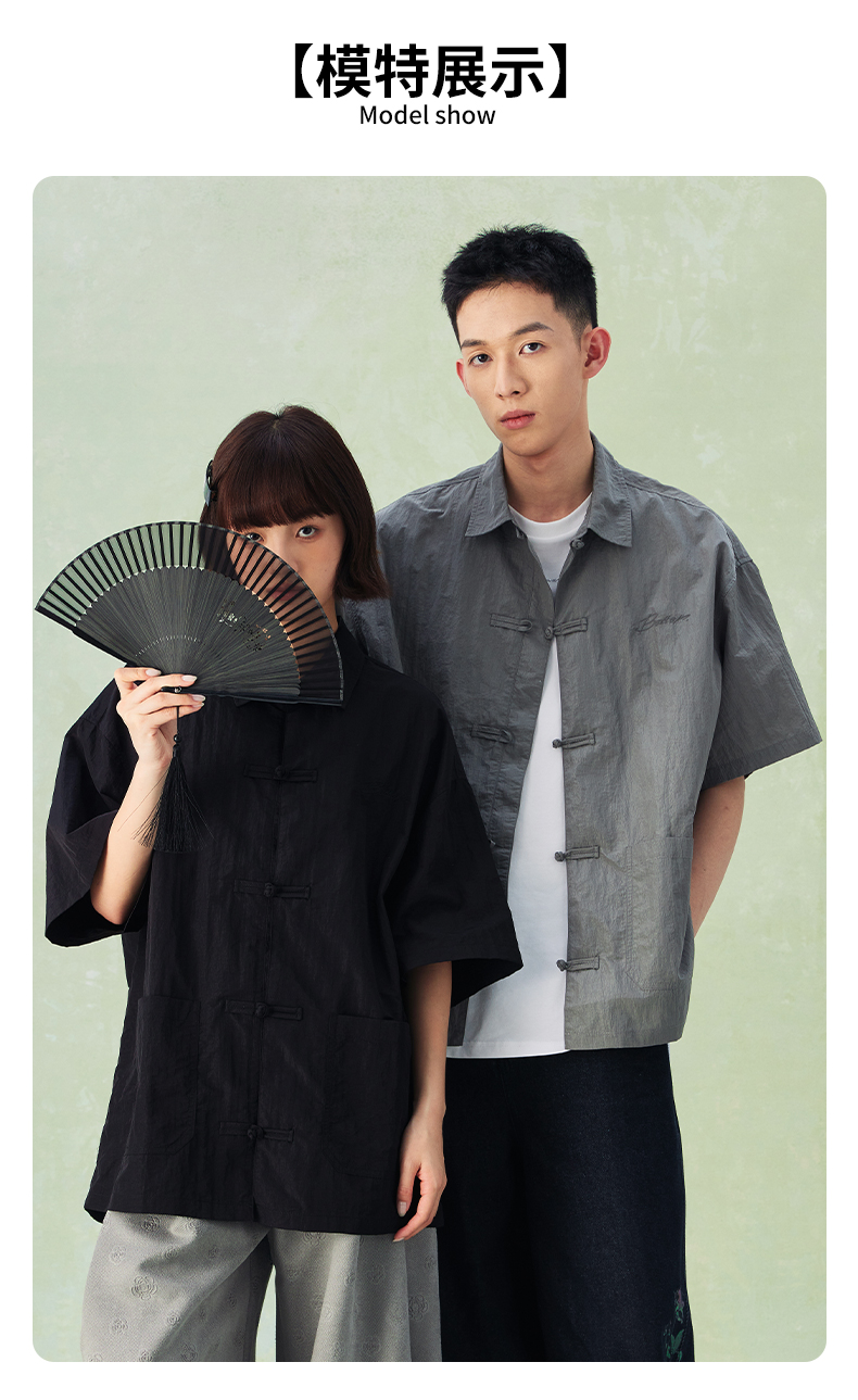 NPC潮牌口袋刺绣翻领中式盘扣短袖衬衫男中国风慵懒男NP44SH10