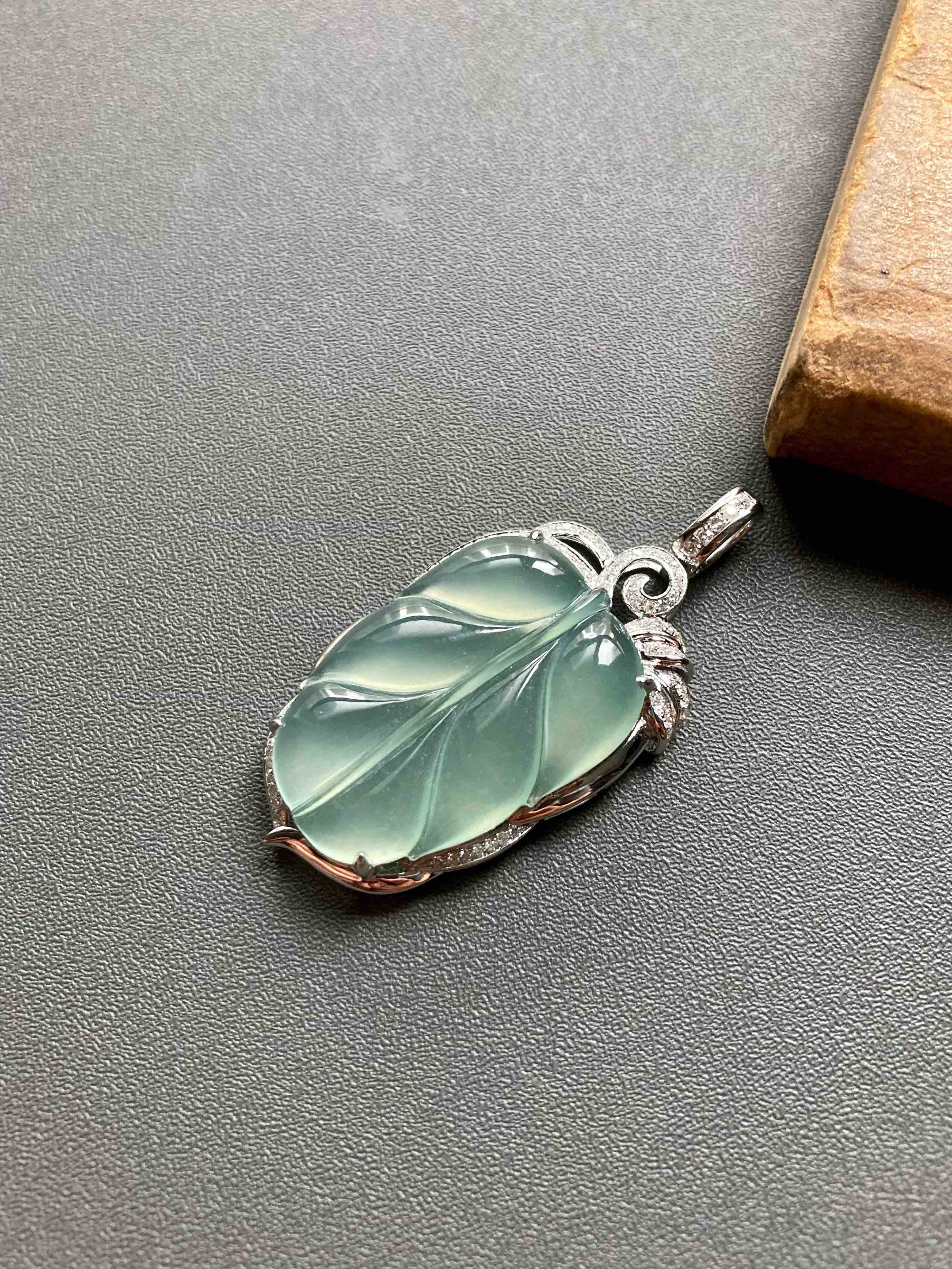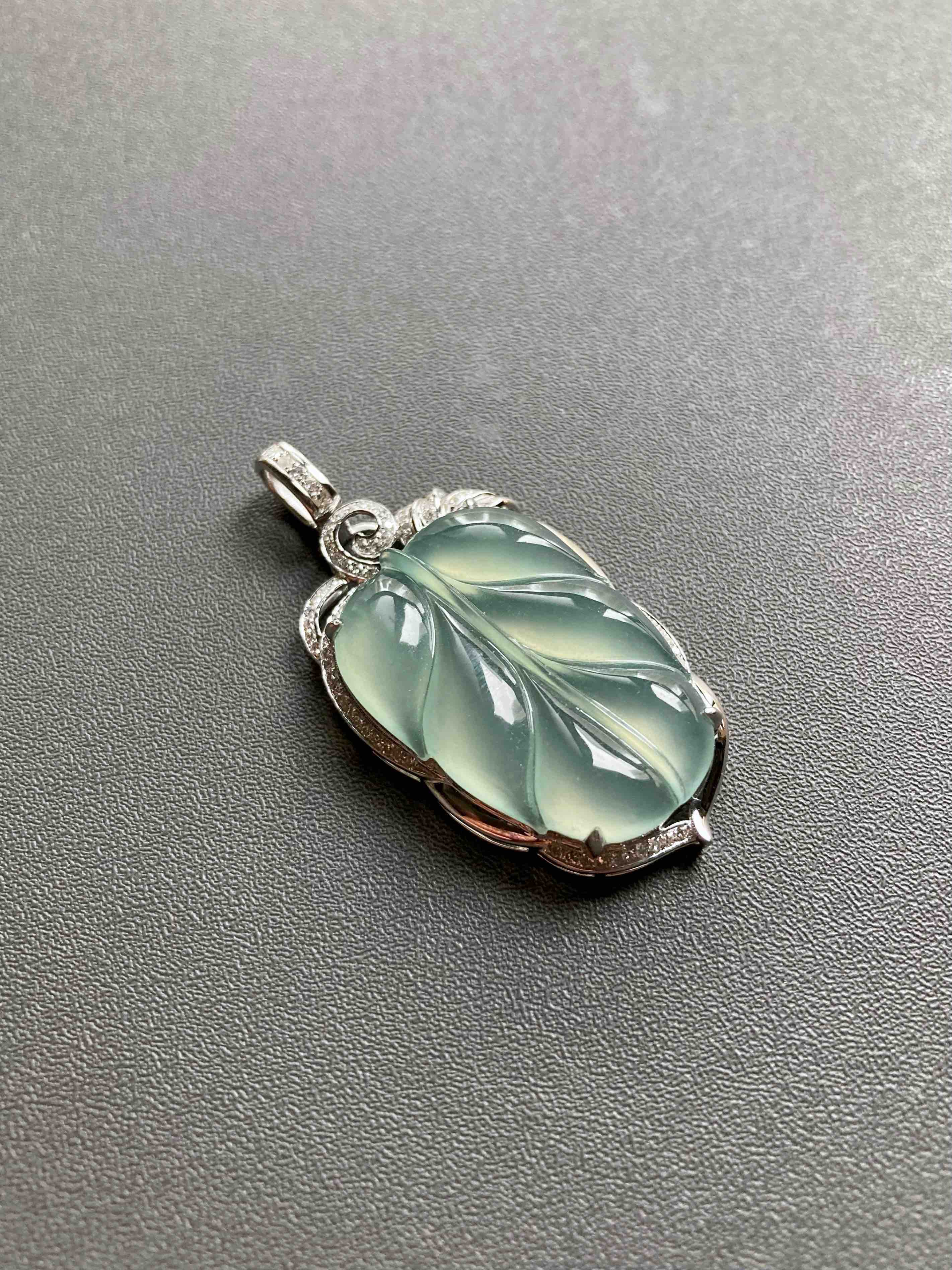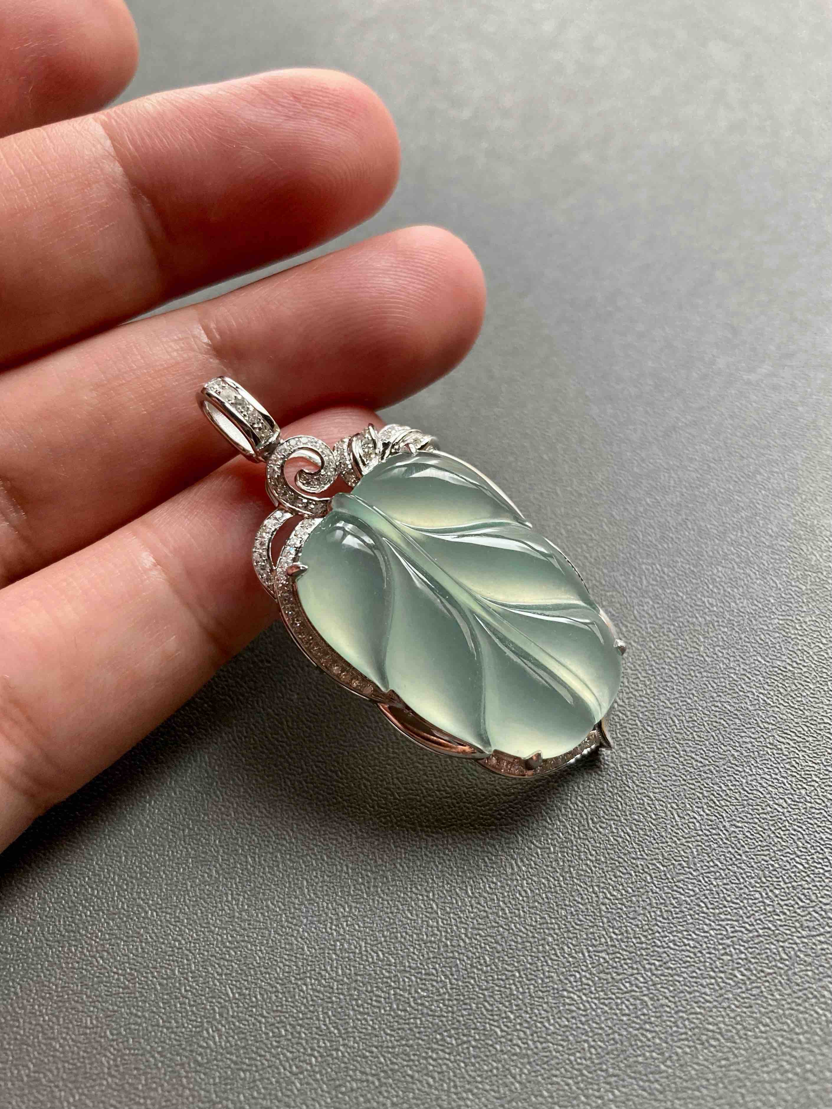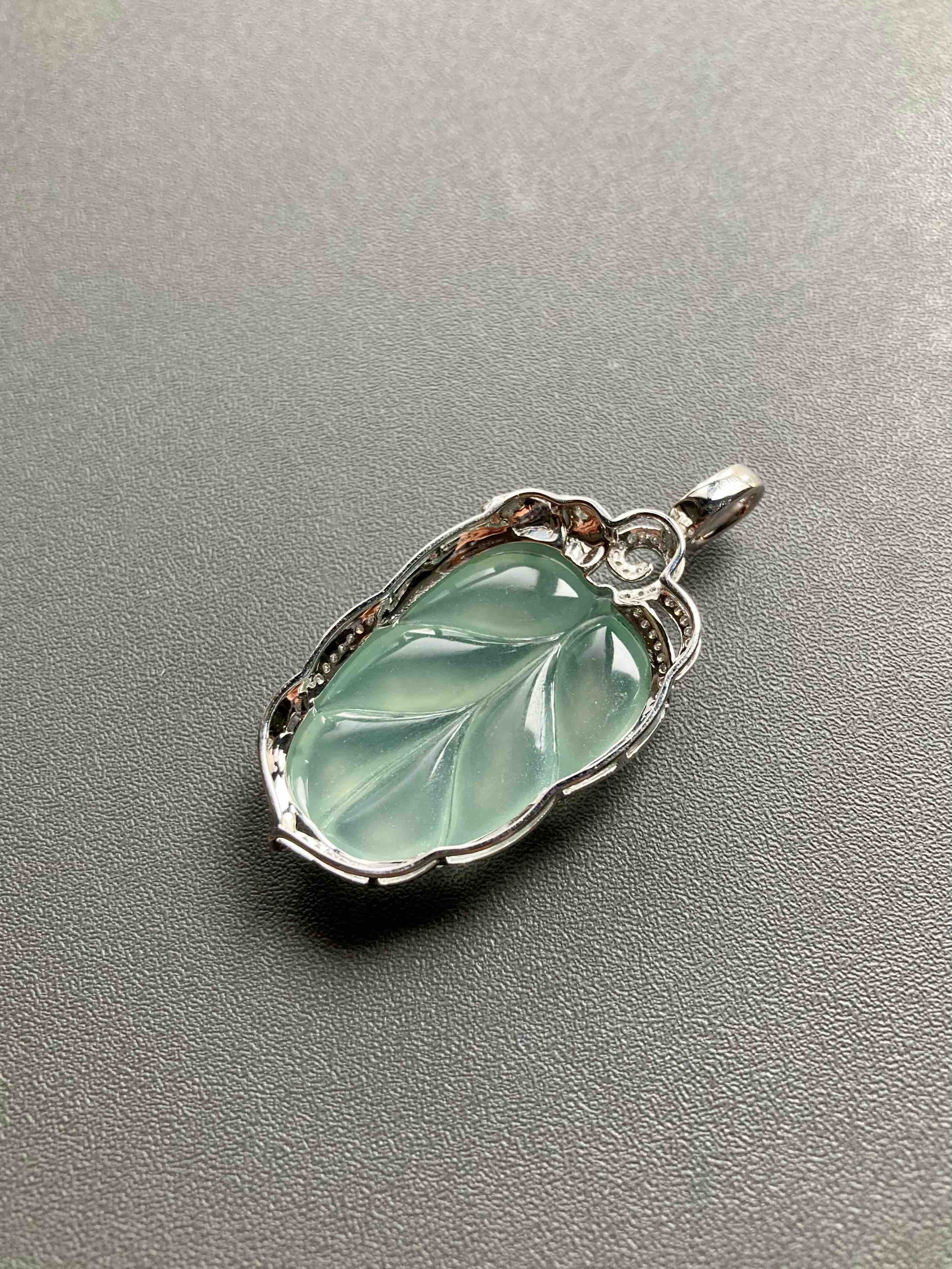 高冰种淡晴水翡翠叶子18k白金钻石镶嵌