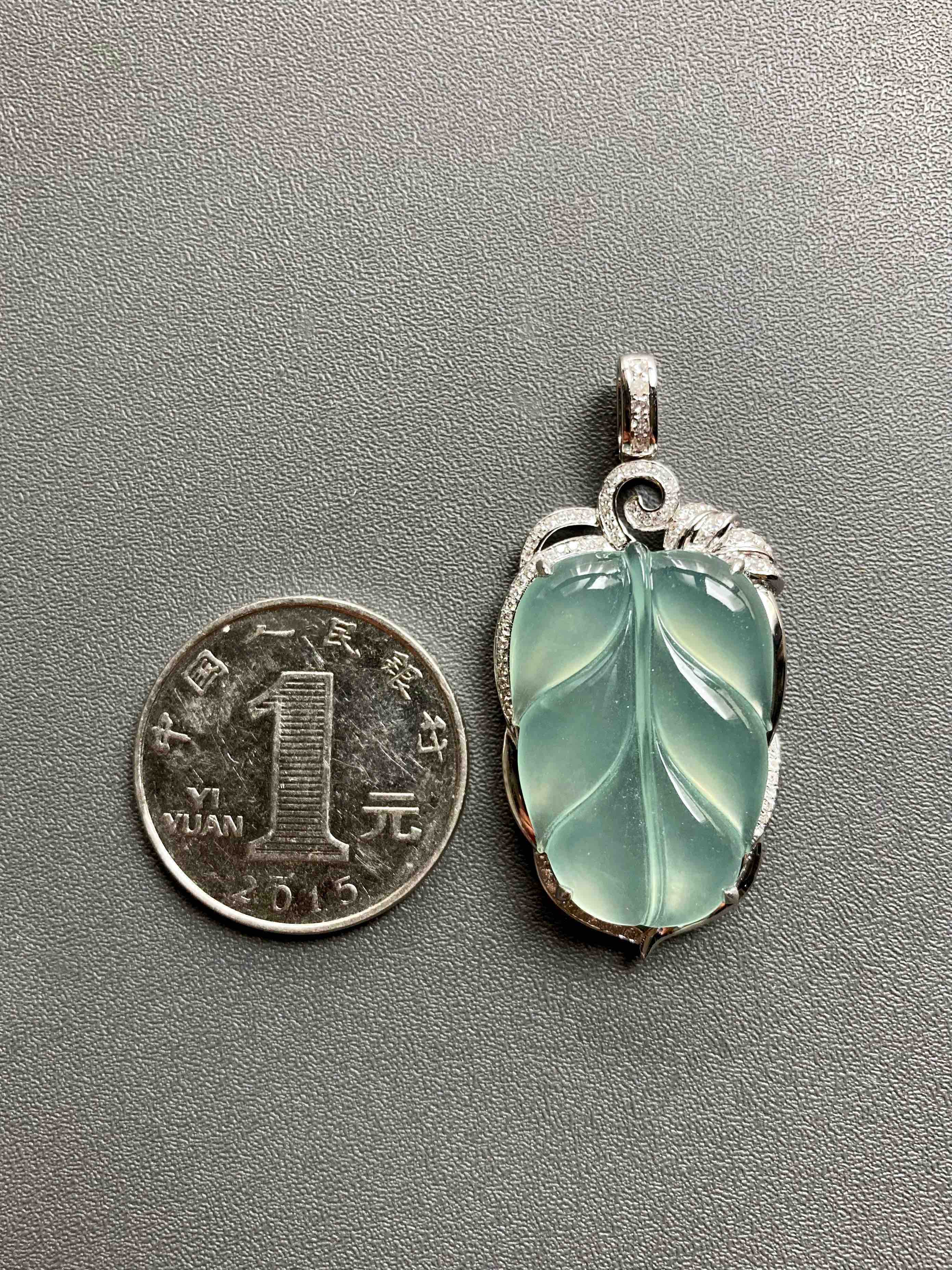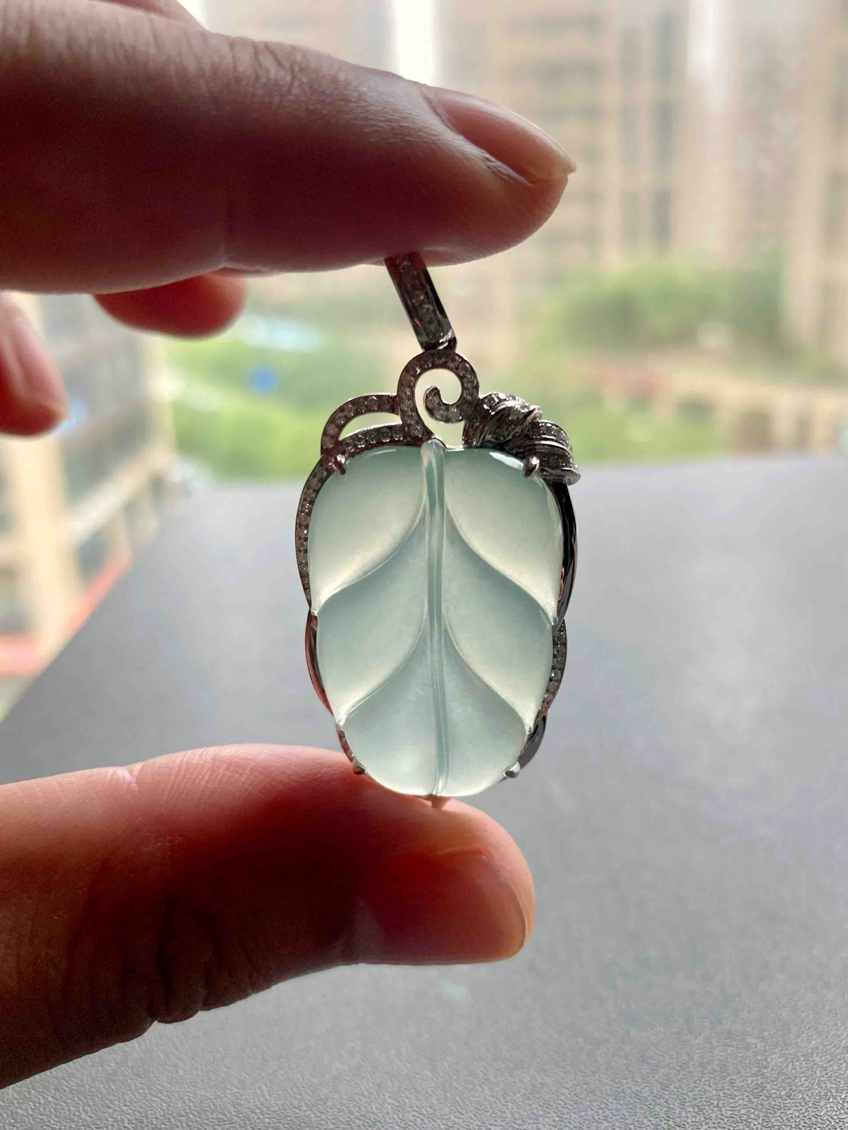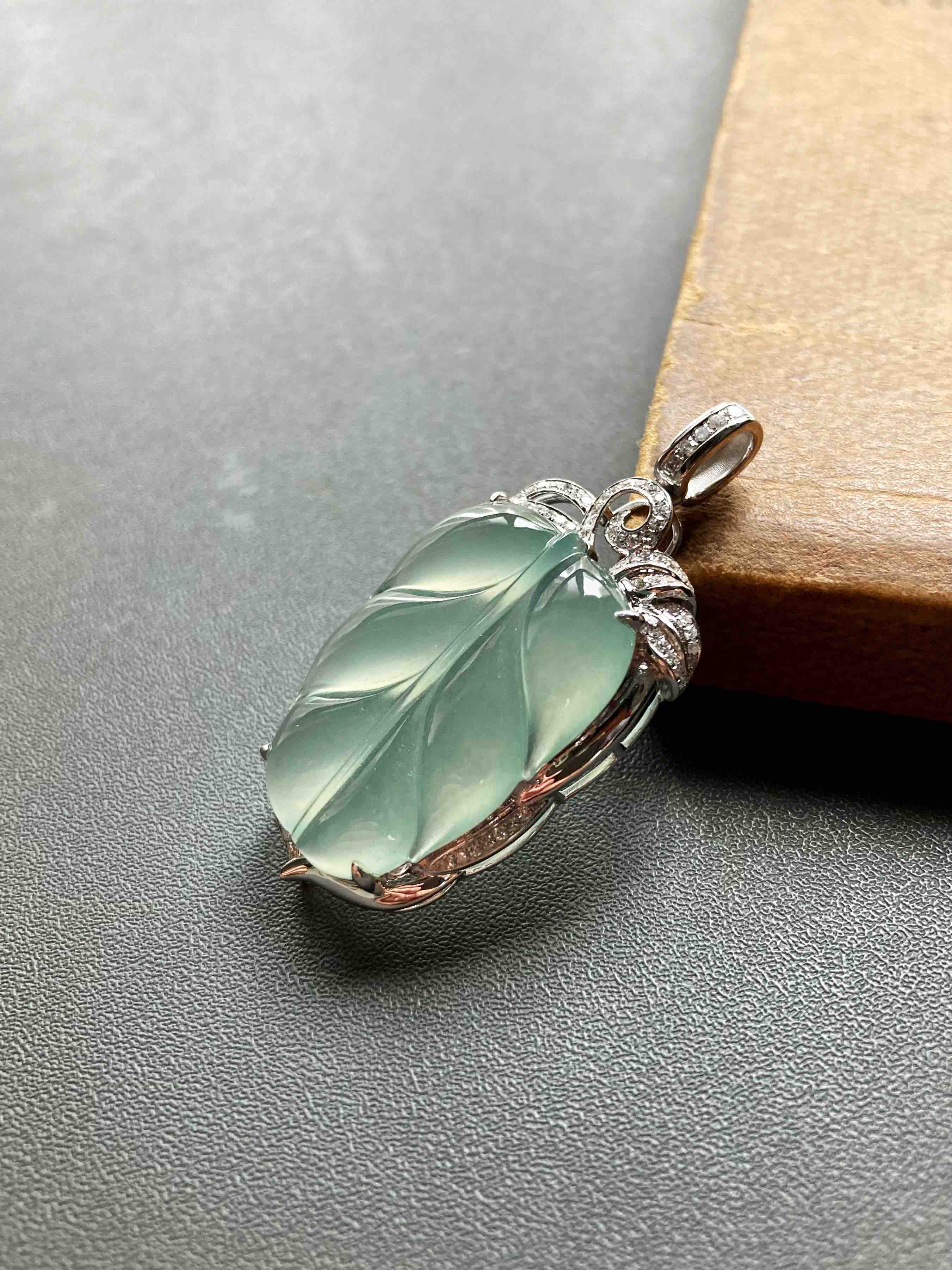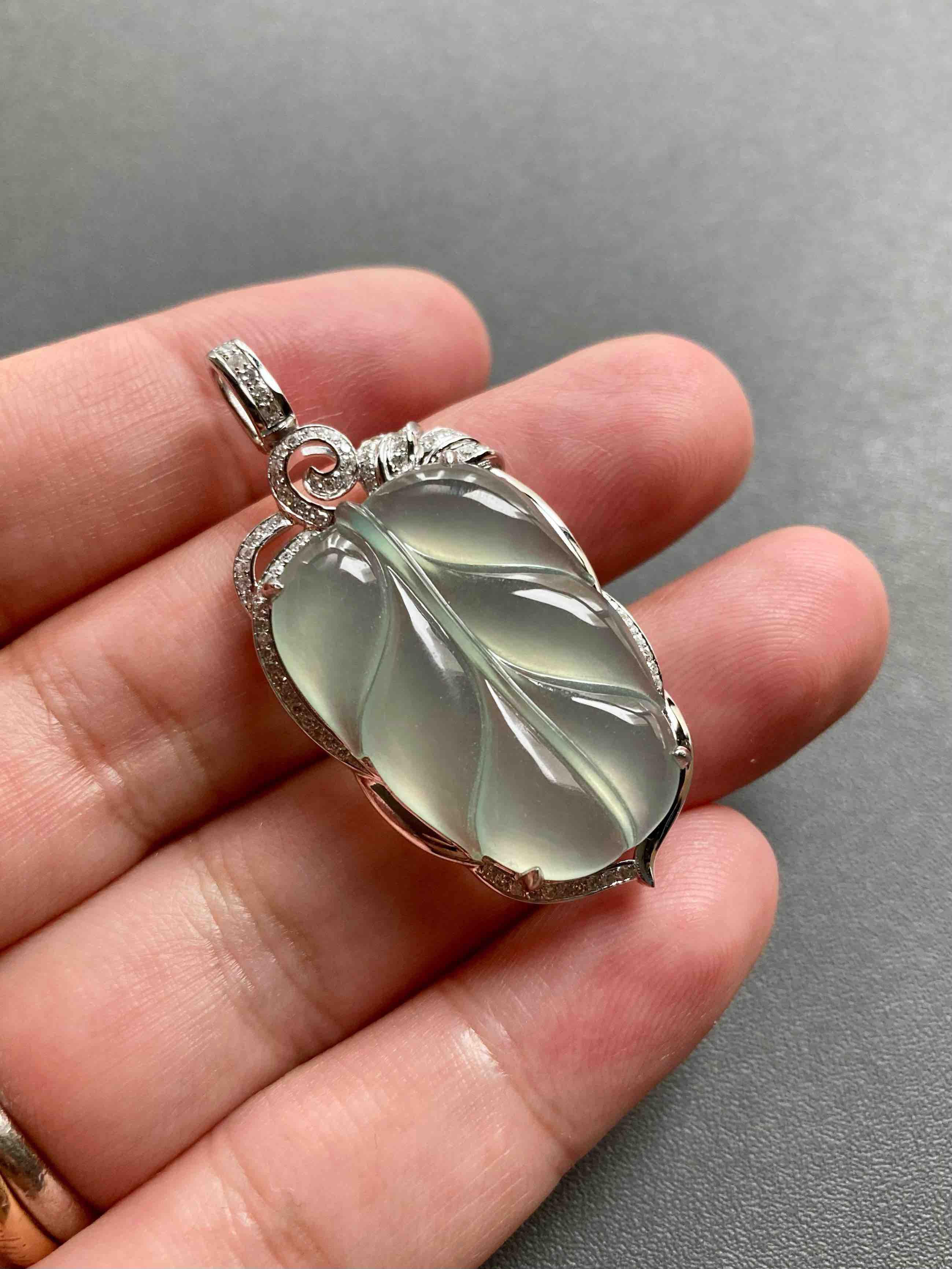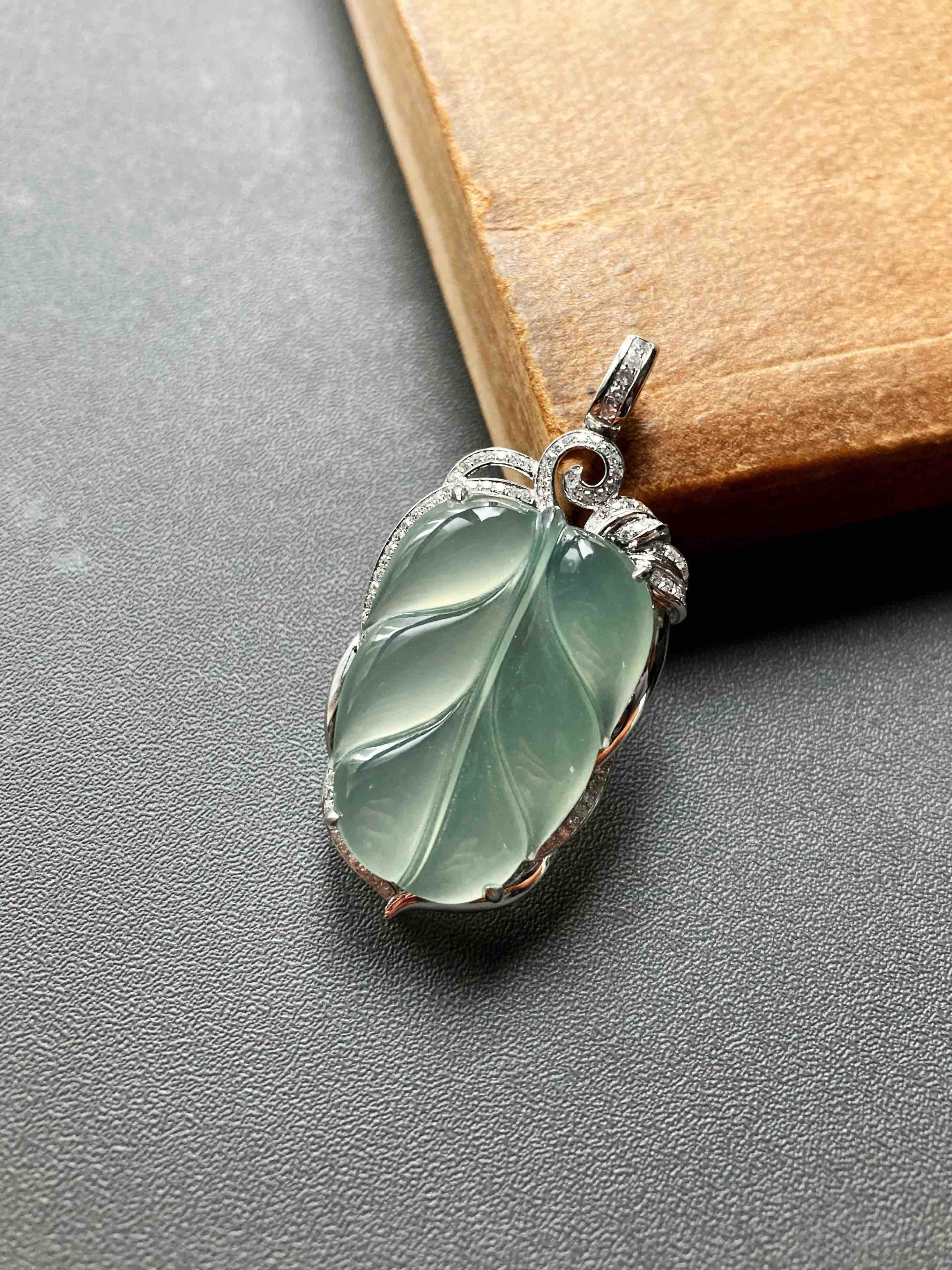高冰种淡晴水翡翠叶子18k白金钻石镶嵌