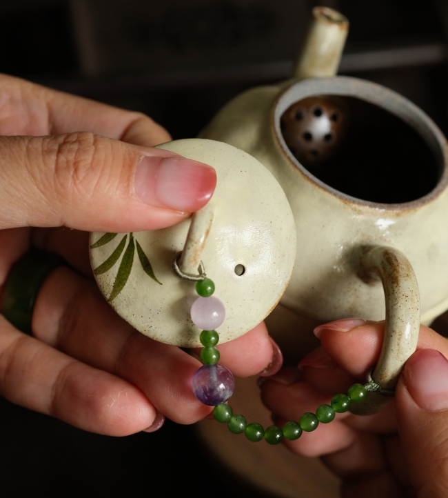 日式粉引手绘翠竹陶瓷茶壶110ml赠送壶绳与壶托独家设计8.5*8.5cm