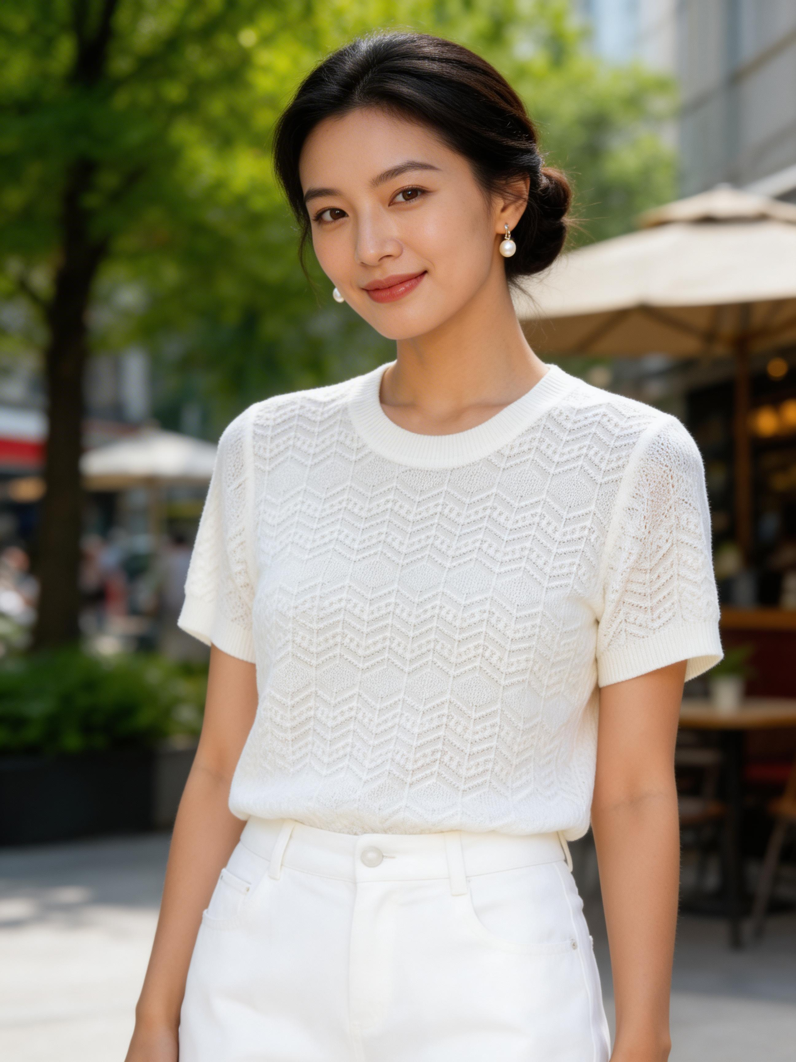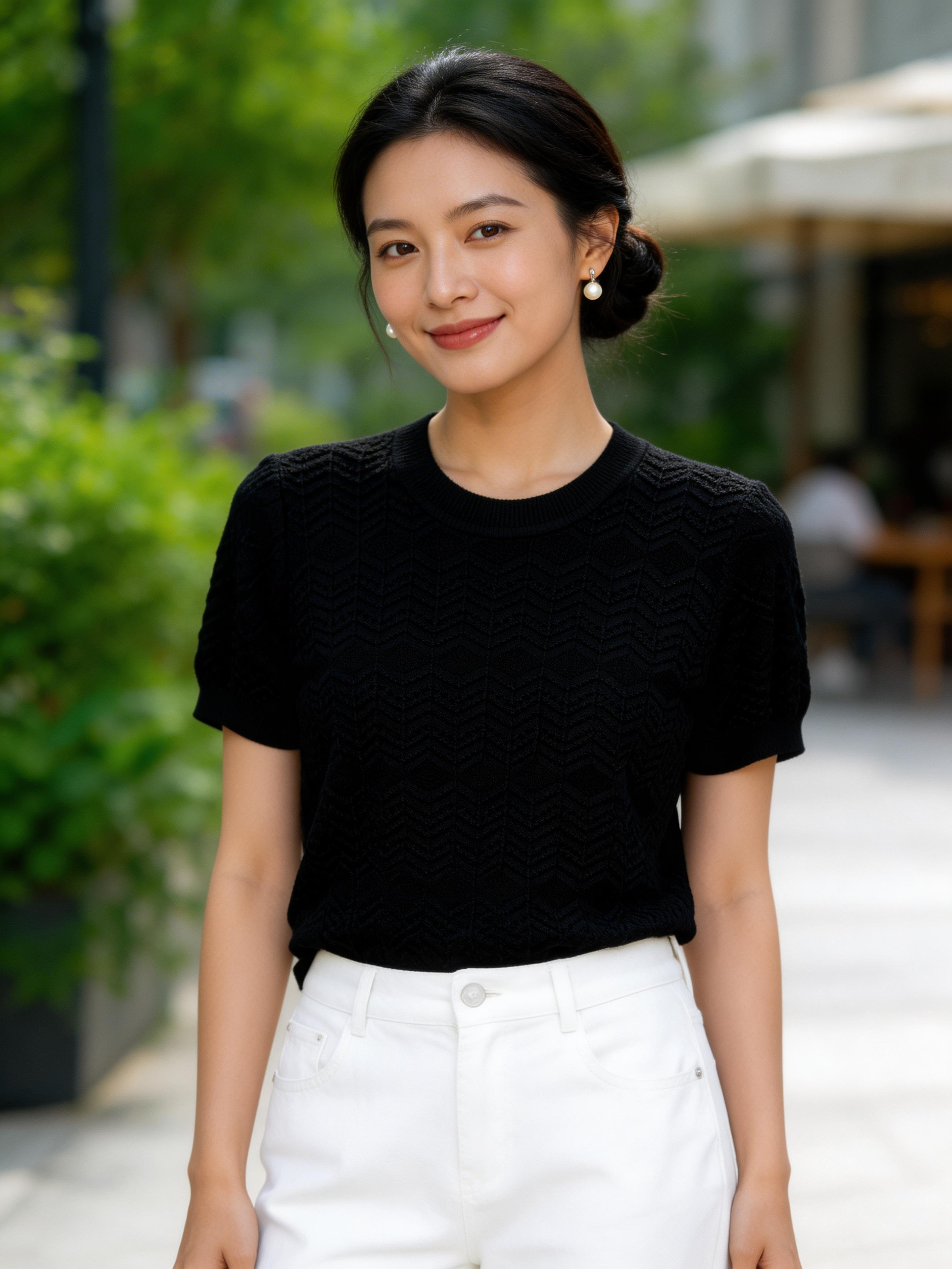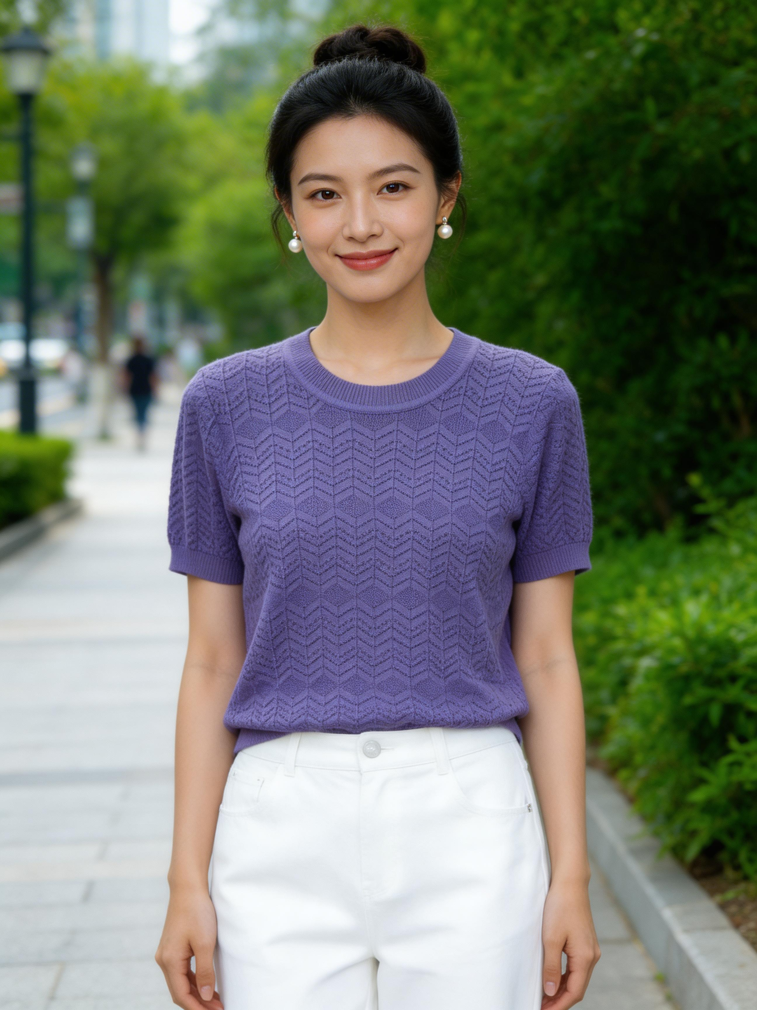 SC2E05_凝脂色/暮山紫/漆黑色_针织衫_夏季_圆领短袖枝叶提花肌理感修身_高级女装_BERNIEELEN 伯妮斯茵