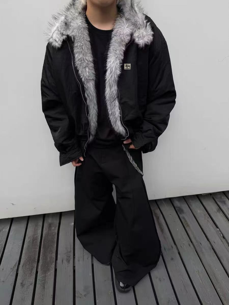 狼王座山雕哈灵顿棉服 今年冬天一定要入手的座山雕 整体的毛边颜色都是有点那种灰白渐变的颜色 面料是那种比较偏光滑一点的质感 像面包服一样那种感觉 看在它内在整个背部 前面和它领口这块 全部都是这种毛茸茸的 还有下摆都是松紧的收边 冬季锁温保暖这一块直接安排上 双头ykk拉链设计 拉上扣住暖暖和和的 外面这个毛领也非常帅气 保暖防风的同时还特别出片 胸前定制logo贴标 凸显品牌身份 好看到爆炸