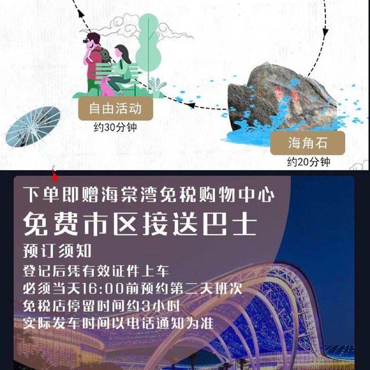 赠送海棠湾免税店班车,如需可以出行前一天16.00前联系旅行社商家提供个人姓名身份证及返程航班号进行预订.