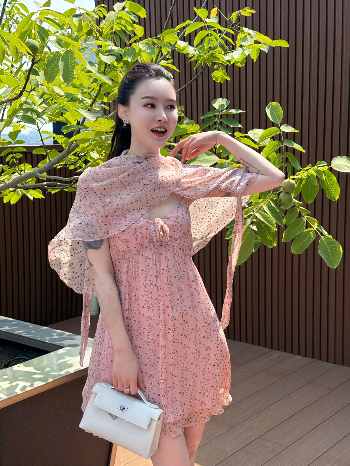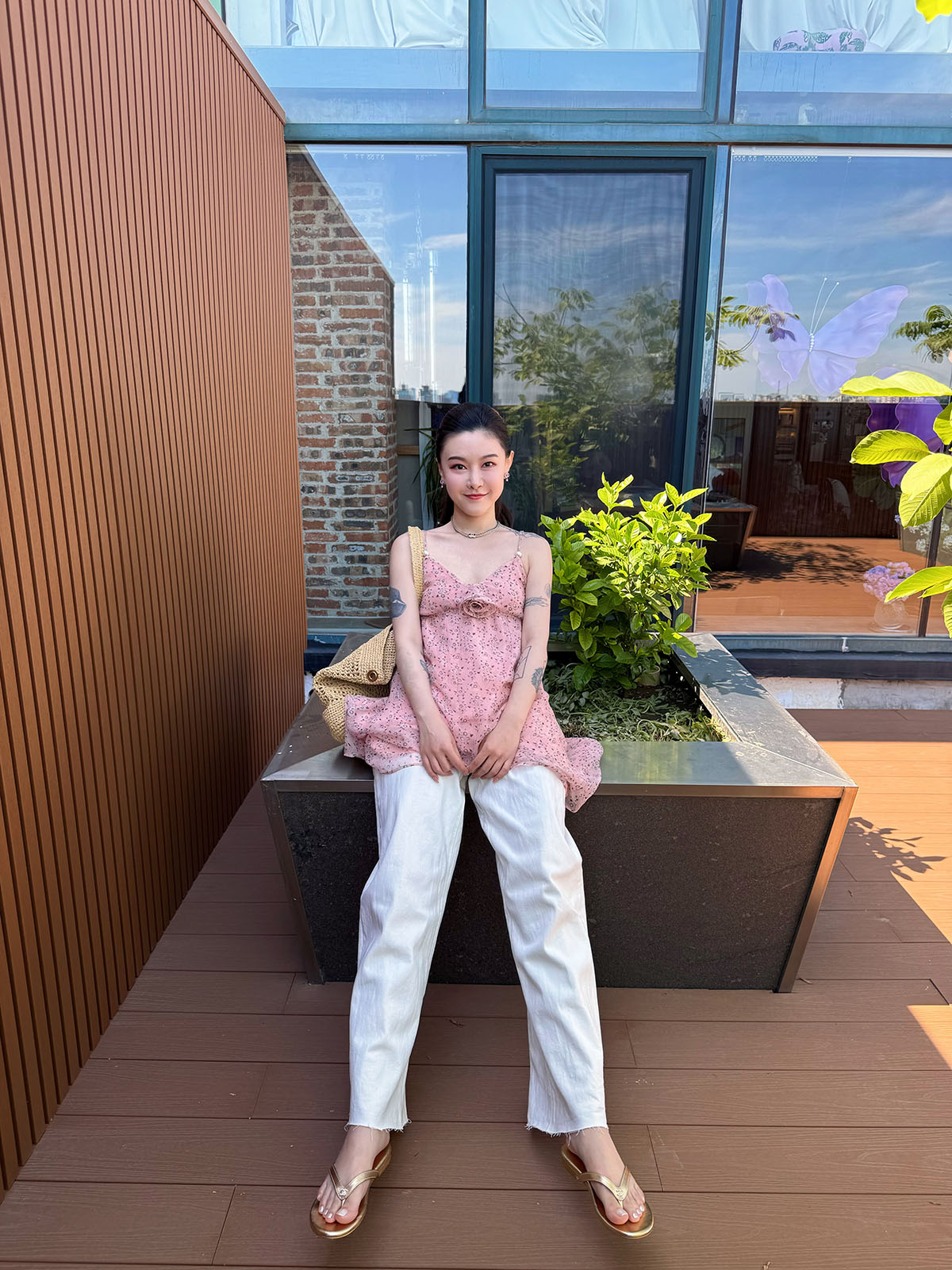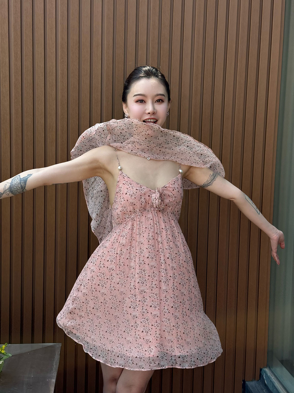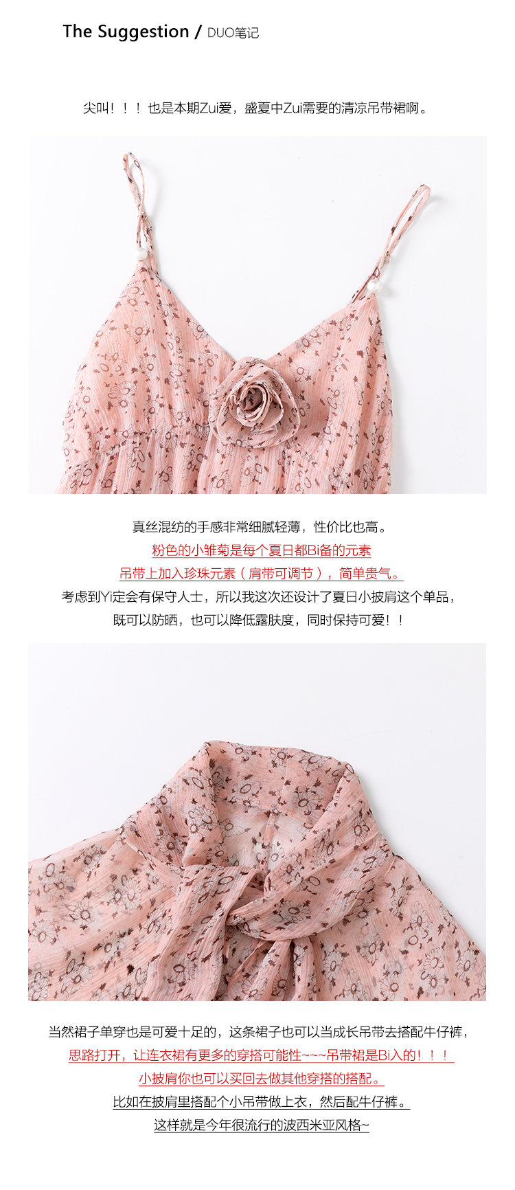 DUO智仙粉标少女雏菊淡粉色真丝混纺印花吊带连衣裙和夏日小披肩