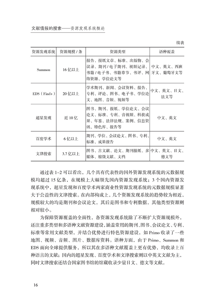 资源发现系统作为新一代图书馆服务系统,将学术搜索引擎与联合目录系统融合起来,形成图书馆元数据、系统与服务在云端的整合,从而实现信息搜索和信息获取的一站式服务,它以;简单、快速、易用、有效的用户体验赢得了全球图书馆的青睐。《文献情报的搜索资源发现系统概论》是国家社会科学基金重点项目基于知识组织的图书馆资源发现服务体系研究的成果,主要研究与分析图书馆资源发现系统发展历程、形成实质和主体框架,包括开放融合环境下文献元数据的集成整合、基于语义的文献资源知识组织、基于名称规范文档的科研实体识别与组织、基于知识组织的图书馆资源发现系统与服务设计、面向资源发现服务的图书馆业务流程重构与跨界协同机制,最后对新一代图书馆系统发展进行展望等。