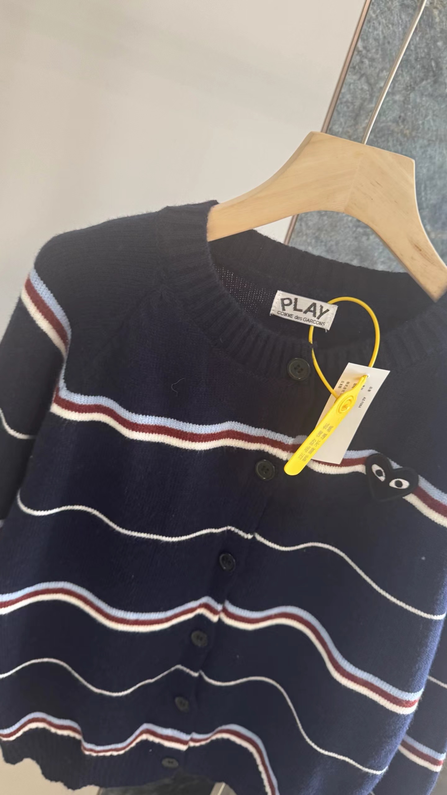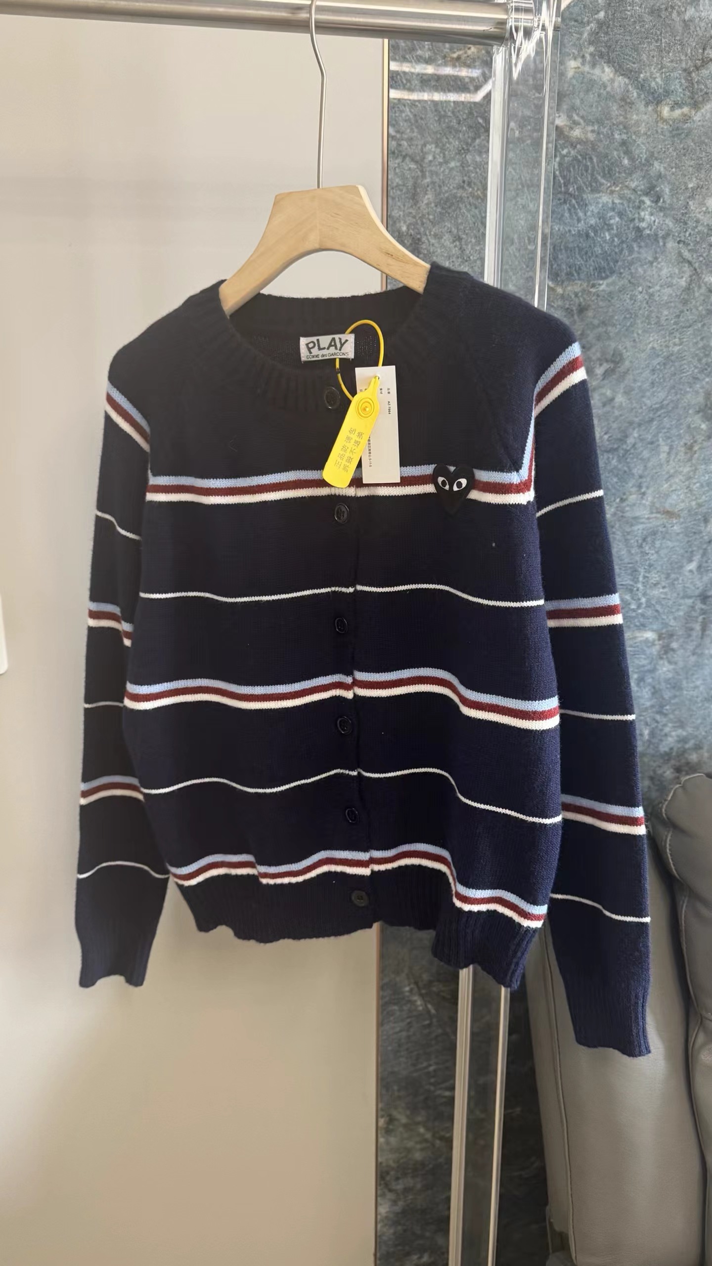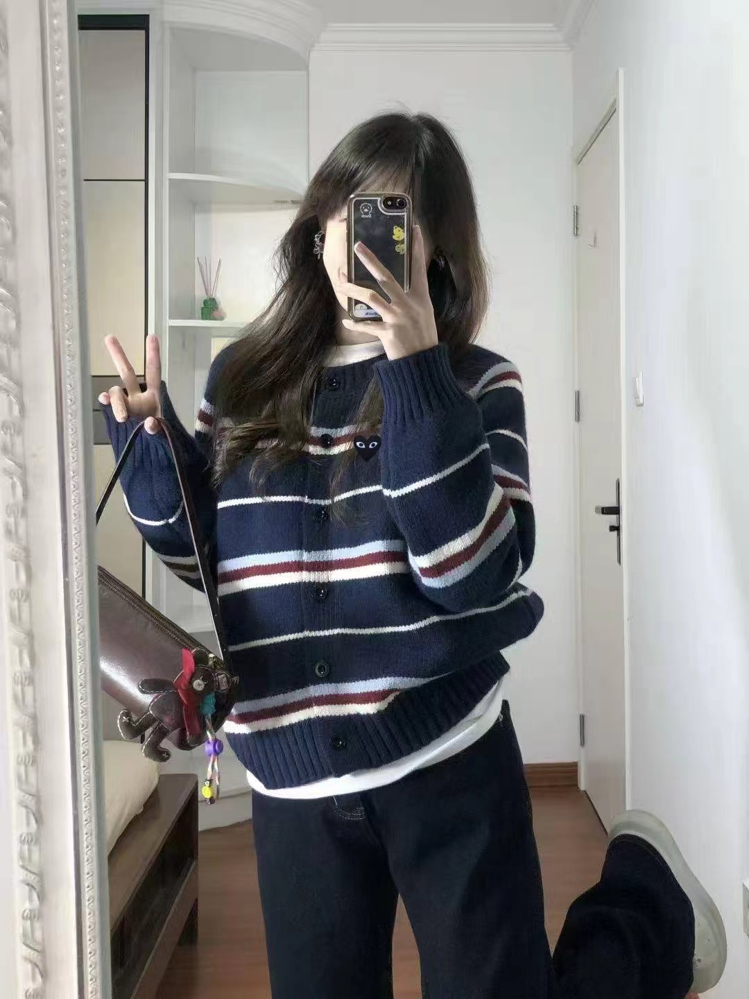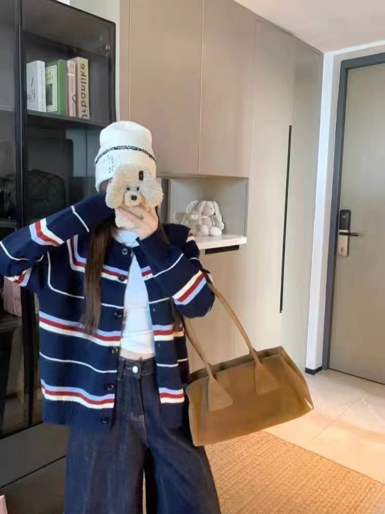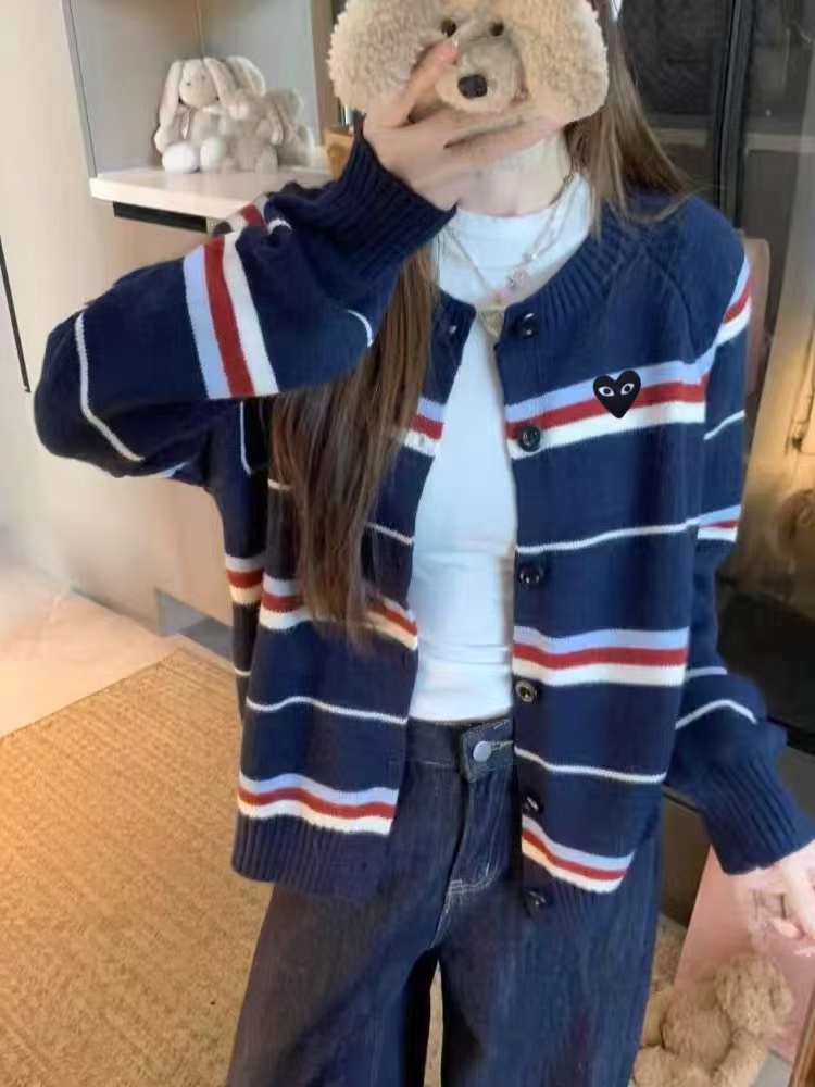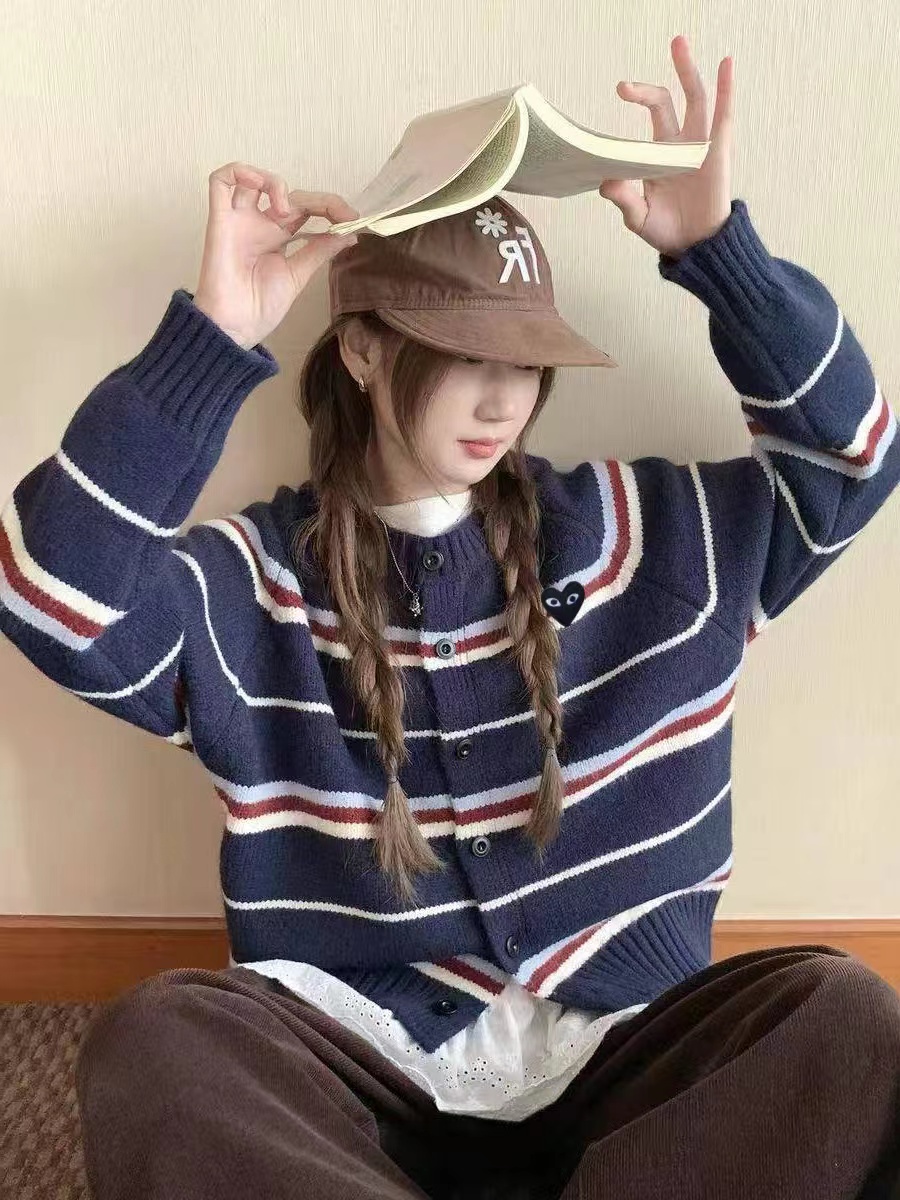 藏青底色拼色条纹圆领针织开衫藏青色底色,搭配红、白、浅蓝多色拼色横条纹。色彩组合丰富且和谐,ji具美式复古感和学院氛围,比单一条纹更有层次感。微宽松落肩版型,对身材包容度高,呈现随性舒适的松弛感,不会过于紧绷显得拘谨。精典圆领,简约利落,可搭配项链修饰颈部,也能露出内搭打造叠穿层次感。软糯厚实的针织材质,纹理清晰,手感亲肤保暖,适合春秋季节穿着。单排圆形纽扣,质感扎实,与深色衣身形成稳重对比,开合方便且实用。左胸位置标志性黑色爱心刺绣,爱心内带眼睛图案,是品牌机能感典的设计元素,为复古条纹增添了俏皮与辨识度。长袖设计,袖口宽松收口,活动自如,同时能保持穿搭的慵懒调性。
