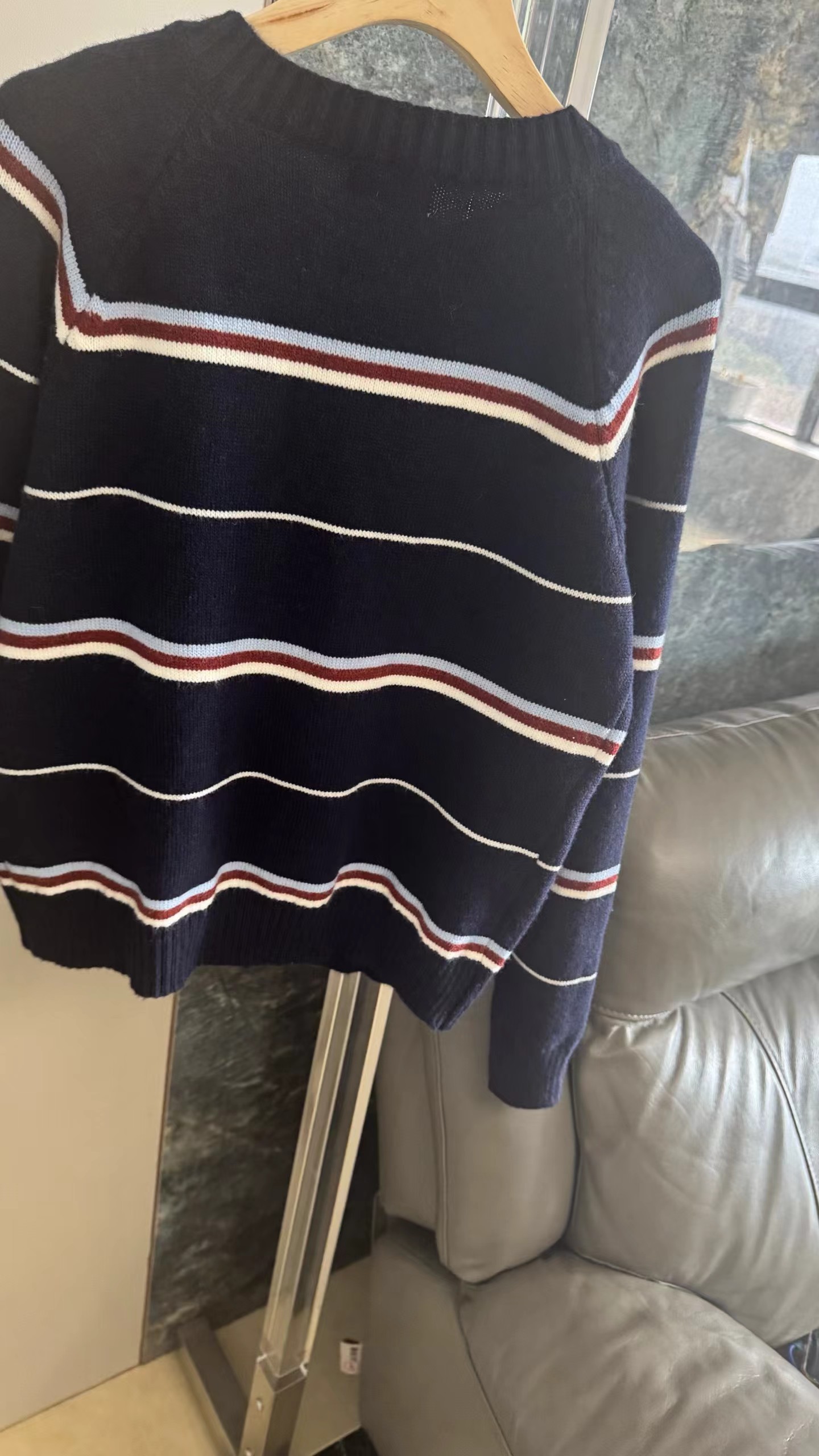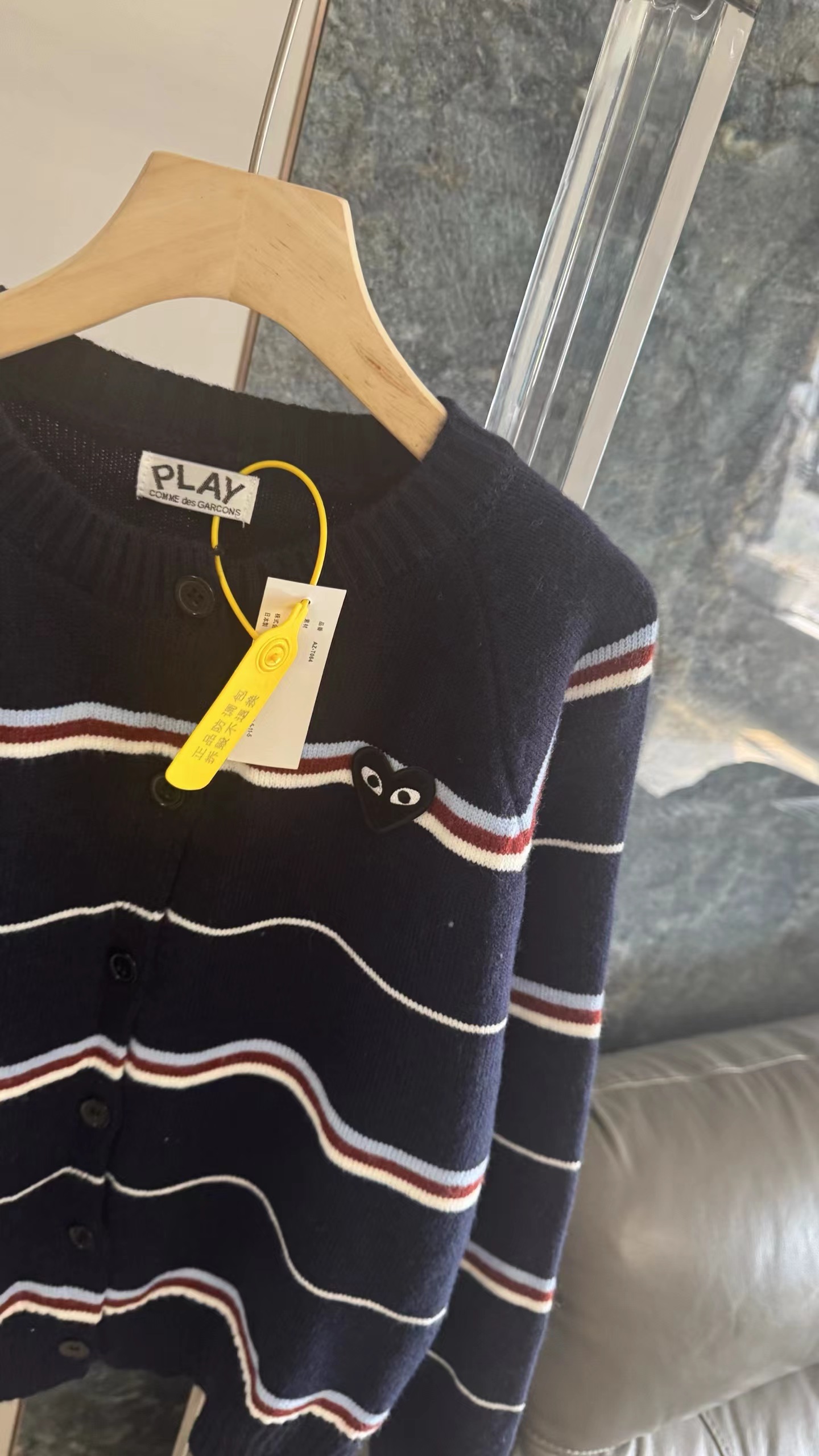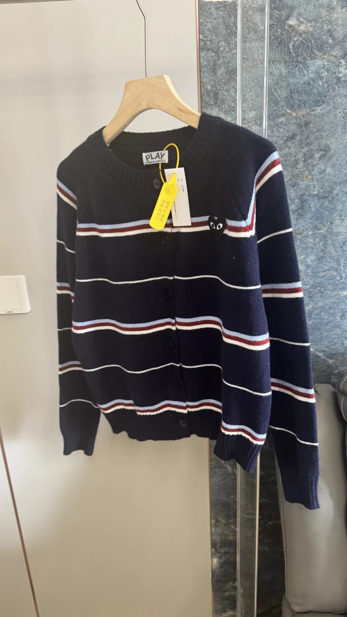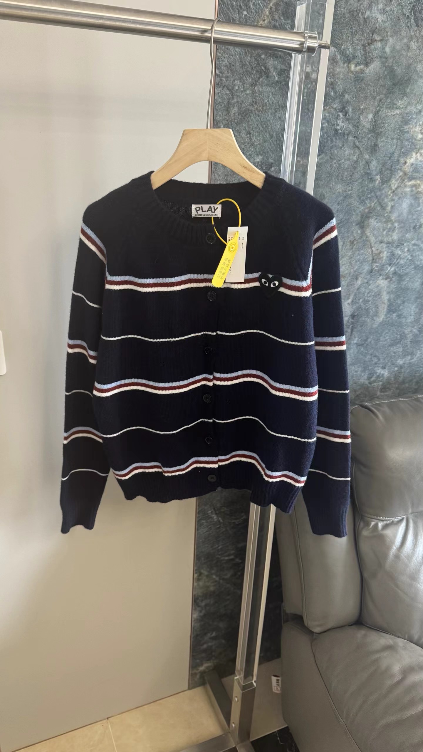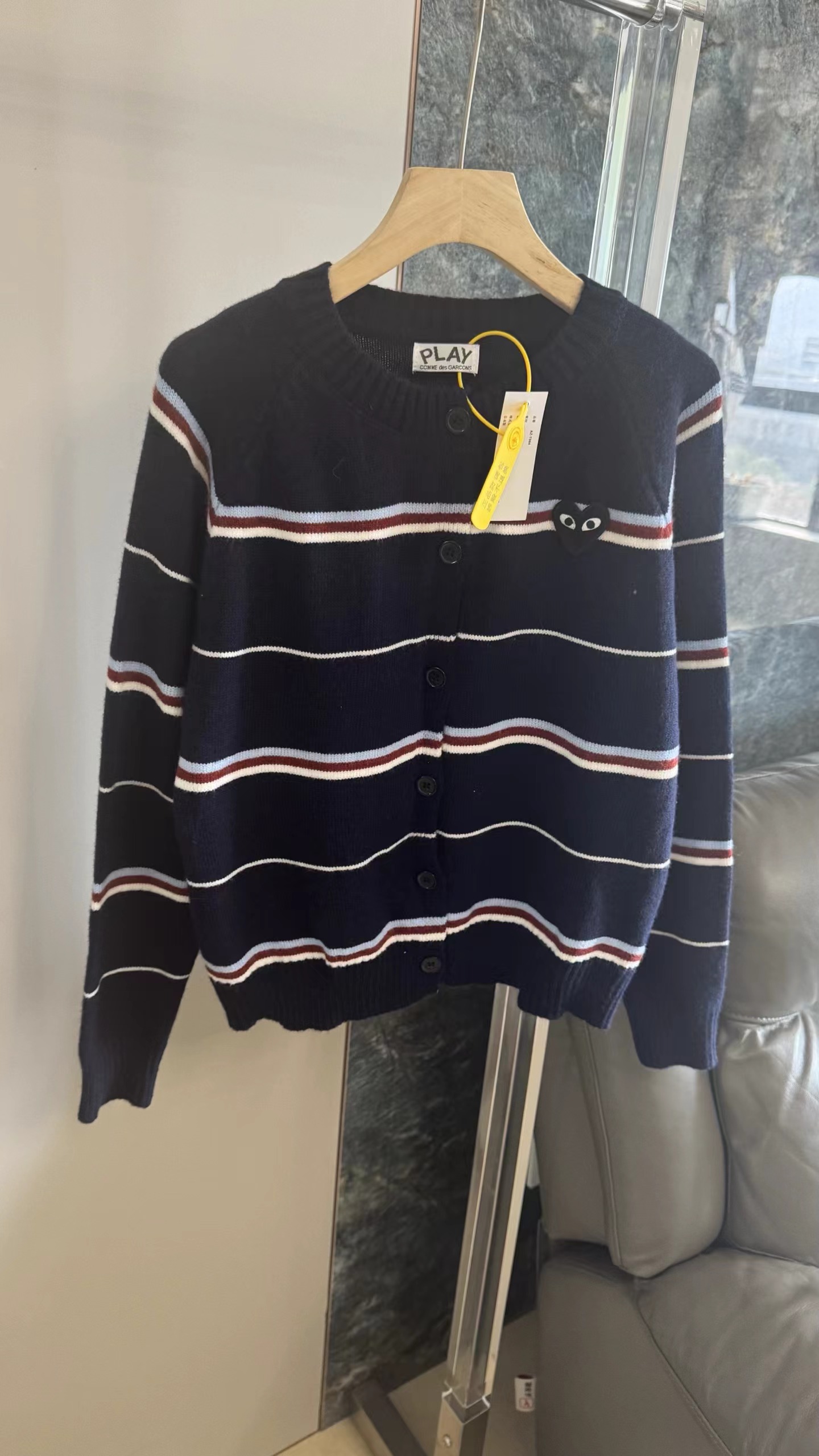 藏青底色拼色条纹圆领针织开衫藏青色底色,搭配红、白、浅蓝多色拼色横条纹。色彩组合丰富且和谐,ji具美式复古感和学院氛围,比单一条纹更有层次感。微宽松落肩版型,对身材包容度高,呈现随性舒适的松弛感,不会过于紧绷显得拘谨。精典圆领,简约利落,可搭配项链修饰颈部,也能露出内搭打造叠穿层次感。软糯厚实的针织材质,纹理清晰,手感亲肤保暖,适合春秋季节穿着。单排圆形纽扣,质感扎实,与深色衣身形成稳重对比,开合方便且实用。左胸位置标志性黑色爱心刺绣,爱心内带眼睛图案,是品牌机能感典的设计元素,为复古条纹增添了俏皮与辨识度。长袖设计,袖口宽松收口,活动自如,同时能保持穿搭的慵懒调性。