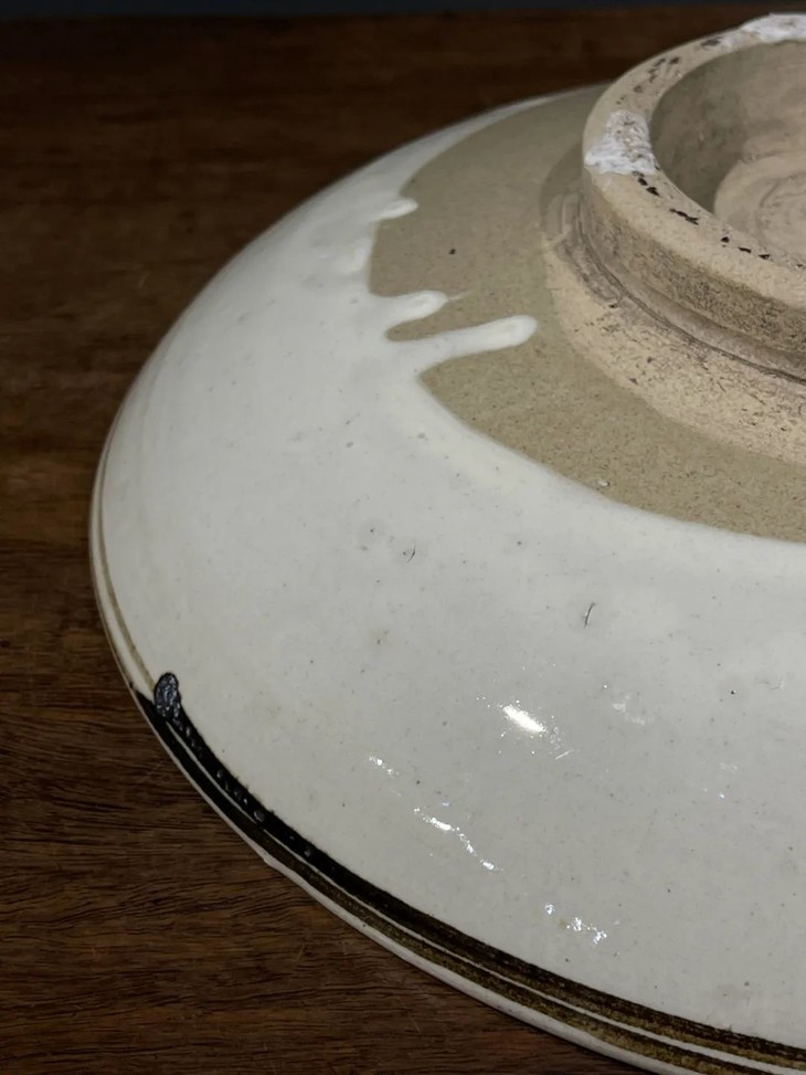 是一只烧制于河北重要陶瓷窑区磁州的白釉褐绘龙纹大盘,此件磁州窑白釉褐绘龙纹大盘,深大圆盘造型优雅秀丽,白色化妆土上,以铁锈釉绘一生动豪迈的云龙纹后罩透明釉,整体风格豪气,画风流畅自然,应是元/明风格的河北磁州窑区白釉褐绘龙纹盖盒。此磁州窑褐绘龙纹大盘,磁州窑特有的白化妆土以含铁质的深褐色颜料绘图,纹饰上罩透明釉后烧成,大深腹盘优雅大气,盘内铁绘豪迈云龙纹,绘风简约朴实,流畅自然,器底露淡褐灰胎,快刀修胚痕迹处处可见,圈足遗留五垫饼痕迹,依其胎、釉与造型之气质,河北磁州窑区之佳作。此磁州窑褐绘龙纹大盘尺寸硕大、气质豪迈 ,如图所示,除底部圈足与口沿具磕碰痕,以及表面磨损痕外,基本保存完好。尺寸:直径:13.2厘米;高度:4.3厘米;重量:315.5克