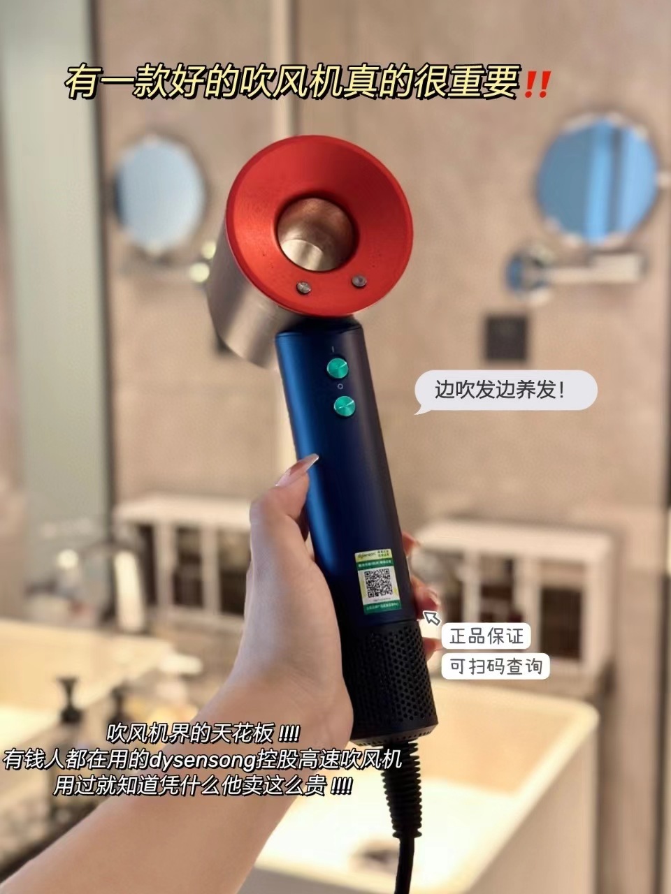 保正P~每盒上都有专属二维码!负离子吹风机,柔顺不分叉还有光泽感,边吹干边养发!内芯采用11万转天洋电机,欧洲CE的电机!DS同款电机,比普通吹风机减少62%飞翘!每次用它吹完头发之后感觉发质到达顶峰,不仅柔顺没有分叉而且很有光泽感!