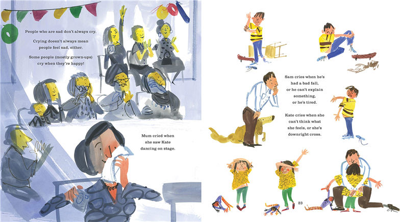 A Book of Feelings stars a brother and sister, Sam and Kate, and their dog, Fuzzy Bean. Sam and Kate know what makes them happy: cuddling Mum, reading a story with Dad, swimming, running and dancing … lots of things! But they don’t feel happy all the time, and in the course of the book we see them feeling grumpy, embarrassed, shy, nervous, frightened, sad and jealous. This book shows the children in many different situations at home and at school, and show how they change over time, how emotions can escalate and how people can help each other. Amanda McCardie’s supremely subtle and sensitive text is as alive to the nuances of children’s behaviour as Salvatore Rubbino’s amazing pictures.