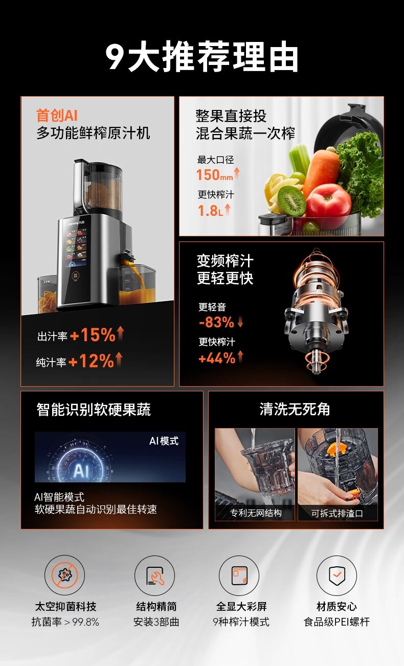 九阳原汁机家用渣汁分离多功能大口径榨汁机可拆易清洗果汁果蔬机