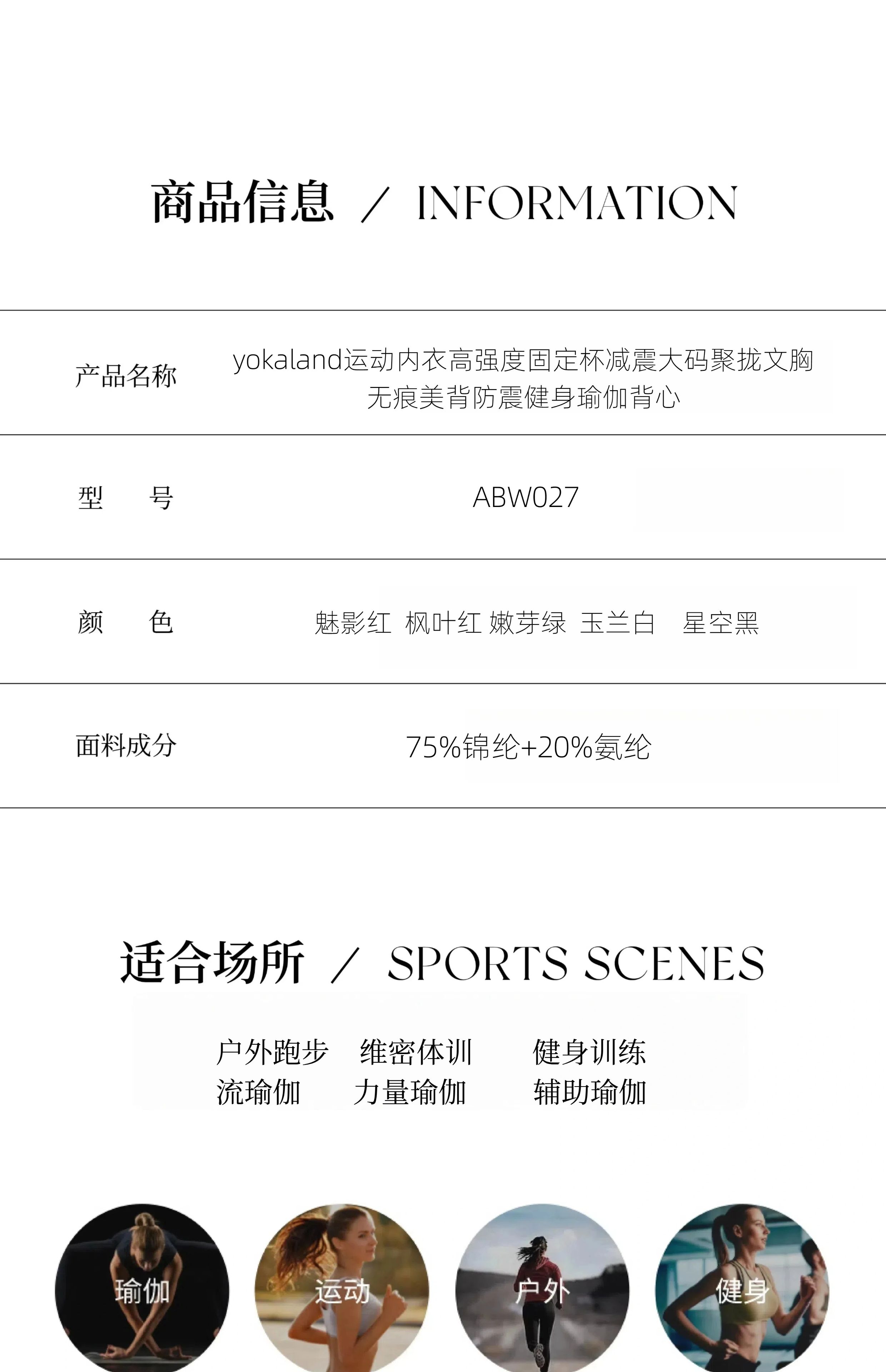 yokaland运动内衣ABW027高强度固定杯减震大码聚拢文胸无痕背心