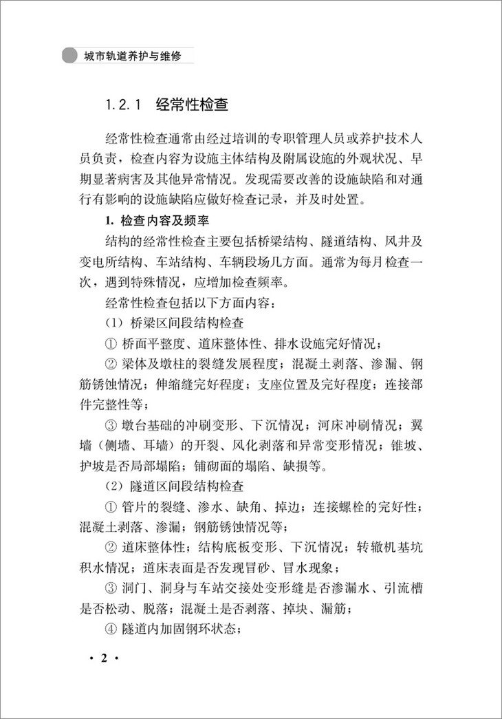 目前,我国从事城市轨道交通工程养护与维修的企业众多,从业人员数量巨大,但现有的作业规范尚不完整,指导性用书较为分散,缺少对作业要求与处置方法系统、完善的梳理,给养护工作带来了许多困难。杭州市路桥集团股份有限公司从事城市轨道交通工程的结构养护与维修多年,有着一定的生产实践经验。笔者以实践为基础,尝试从轨道交通工程的检查与维修、突发结构故障处置、安全措施、信息化管理等方面,系统整理并介绍具体的技术与管理内容,希望能够帮助读者解决若干实际问题。