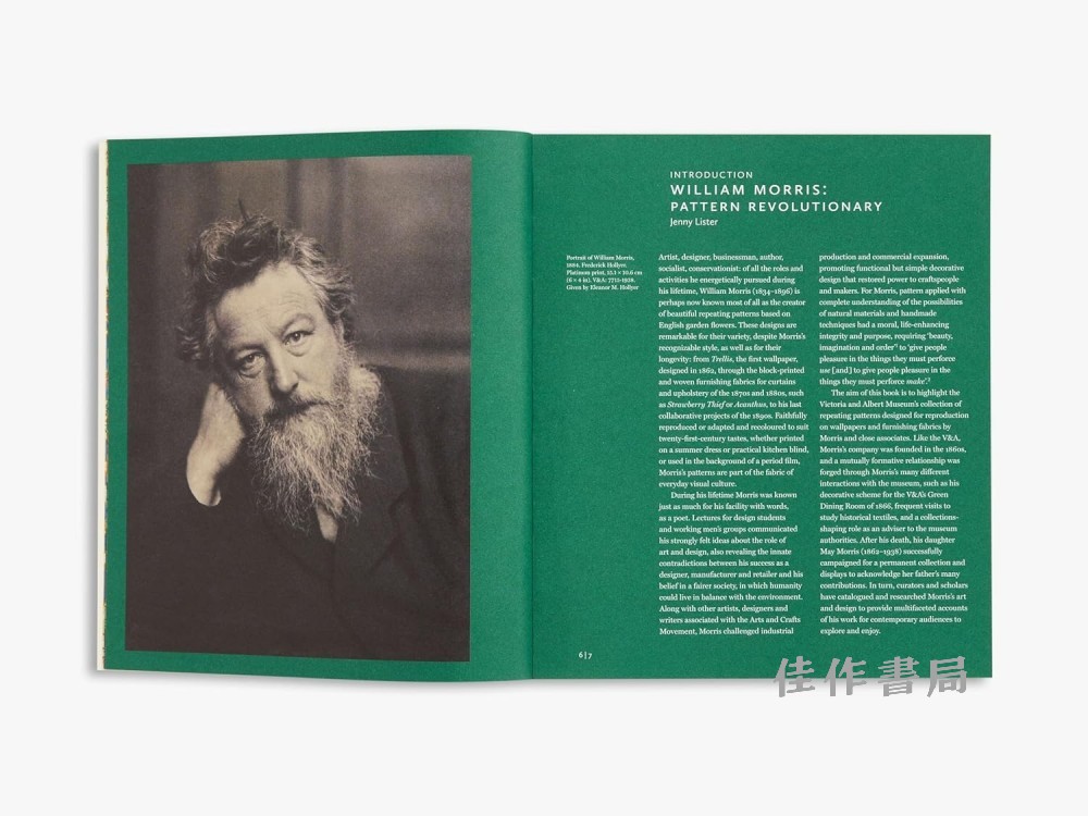 该书的设计颇具特色,采用了受威廉·莫里斯启发的绿色文字,适中的方形便携开本便于读者轻松翻阅,尽情欣赏莫里斯纺织品和墙纸设计的艺术魅力。