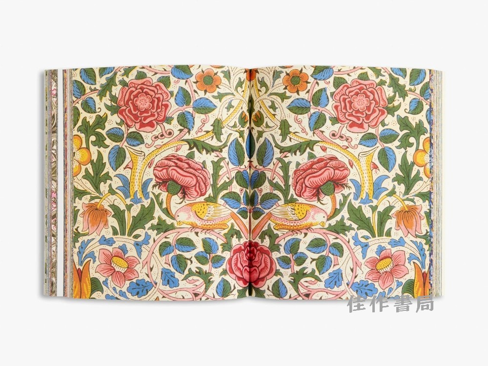 《威廉·莫里斯:图案与设计》一书开篇对莫里斯的生平和作品进行了介绍性概述。书中探讨了这些标志性设计在19世纪末是如何创作和印刷的,随后展示了这些图案以及许多其他配色方案。每幅图案的创作年代都标注在对应页面上,竖排的说明文字为图案留出了尽可能多的完整空间。这本插图丰富的书籍不仅展示了诸如著名的“格子架”“圣詹姆斯”和“草莓小偷”等标志性设计,还收录了一些不太为人知但同样迷人的图案,这些图案由莫里斯以及莫里斯公司的设计师设计。
