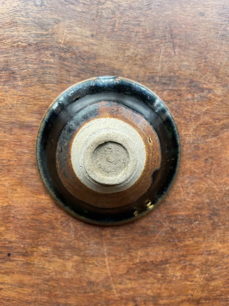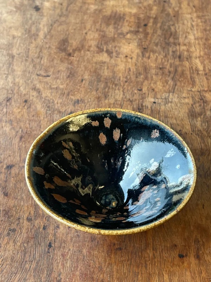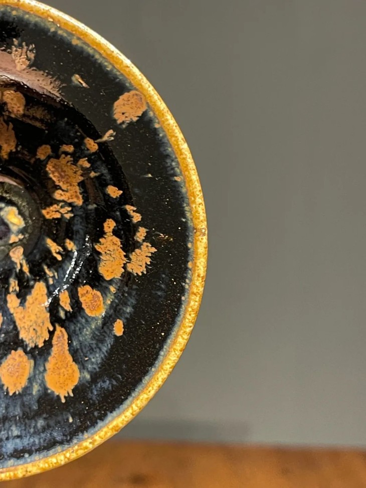 这是一件造型优雅秀丽的仿宋代文玩风格褐斑黑釉斗笠碗,是一只烧制于河北磁州窑或是河南当阳裕窑的酒杯或是茶盏,简约大气的撇口斗笠形碗,覆盖玻化程度高的黑釉上洒大褐斑,是河北磁州窑或是河南当阳裕窑的精品。