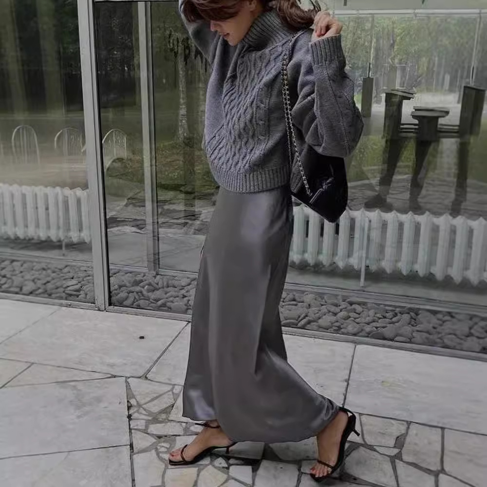大象灰日本进口嵿级三醋酸半身裙女!2025春缎面丝滑半裙A字气质中长裙!