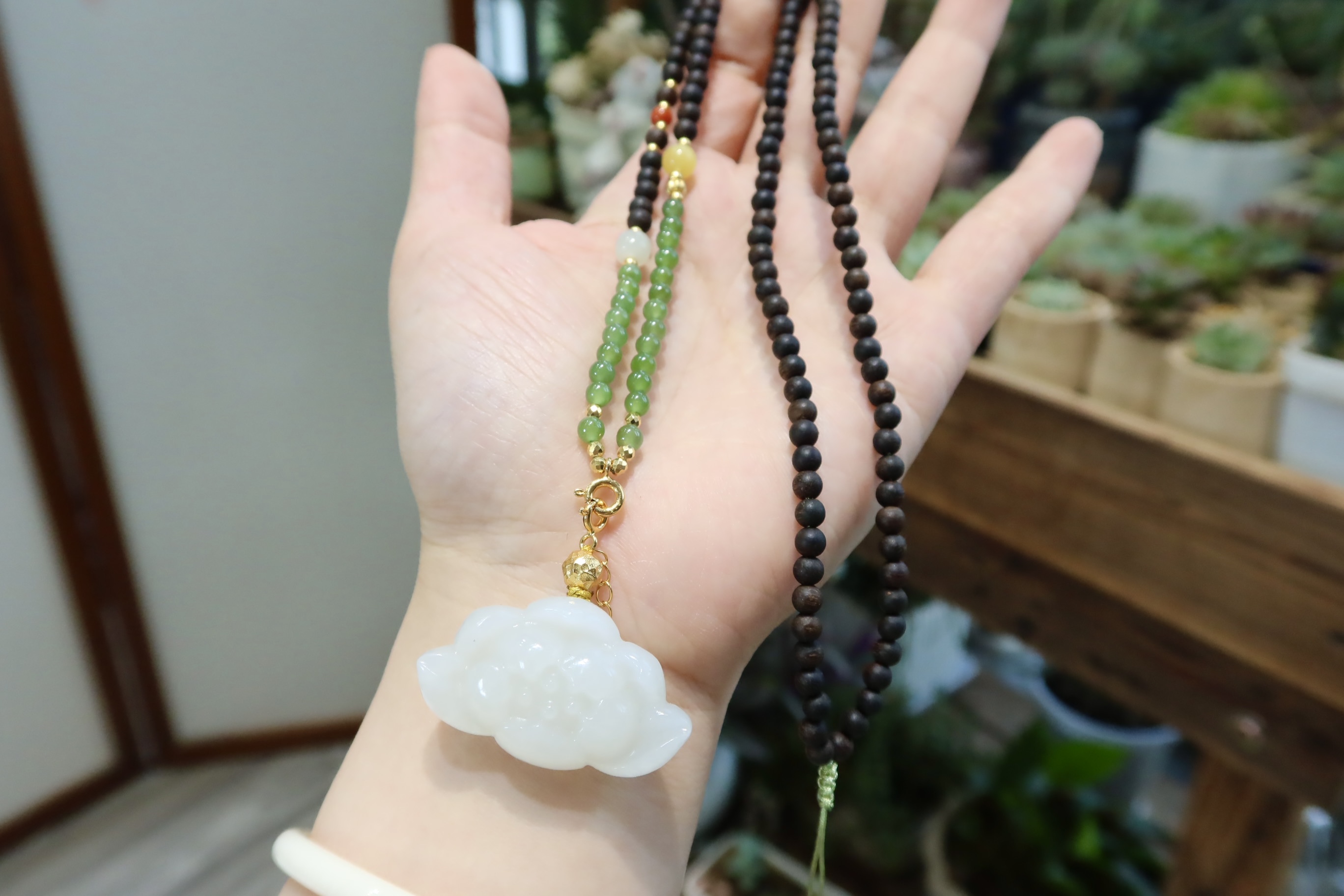 天然黑奇楠老料沉香项链,有浓郁的甘甜香气,搭配:和田玉莲花牌,尺寸:38.3*23*11.5mm,碧玉,南红,和田玉,蜜蜡,蝴蝶链条,银镀金配件~