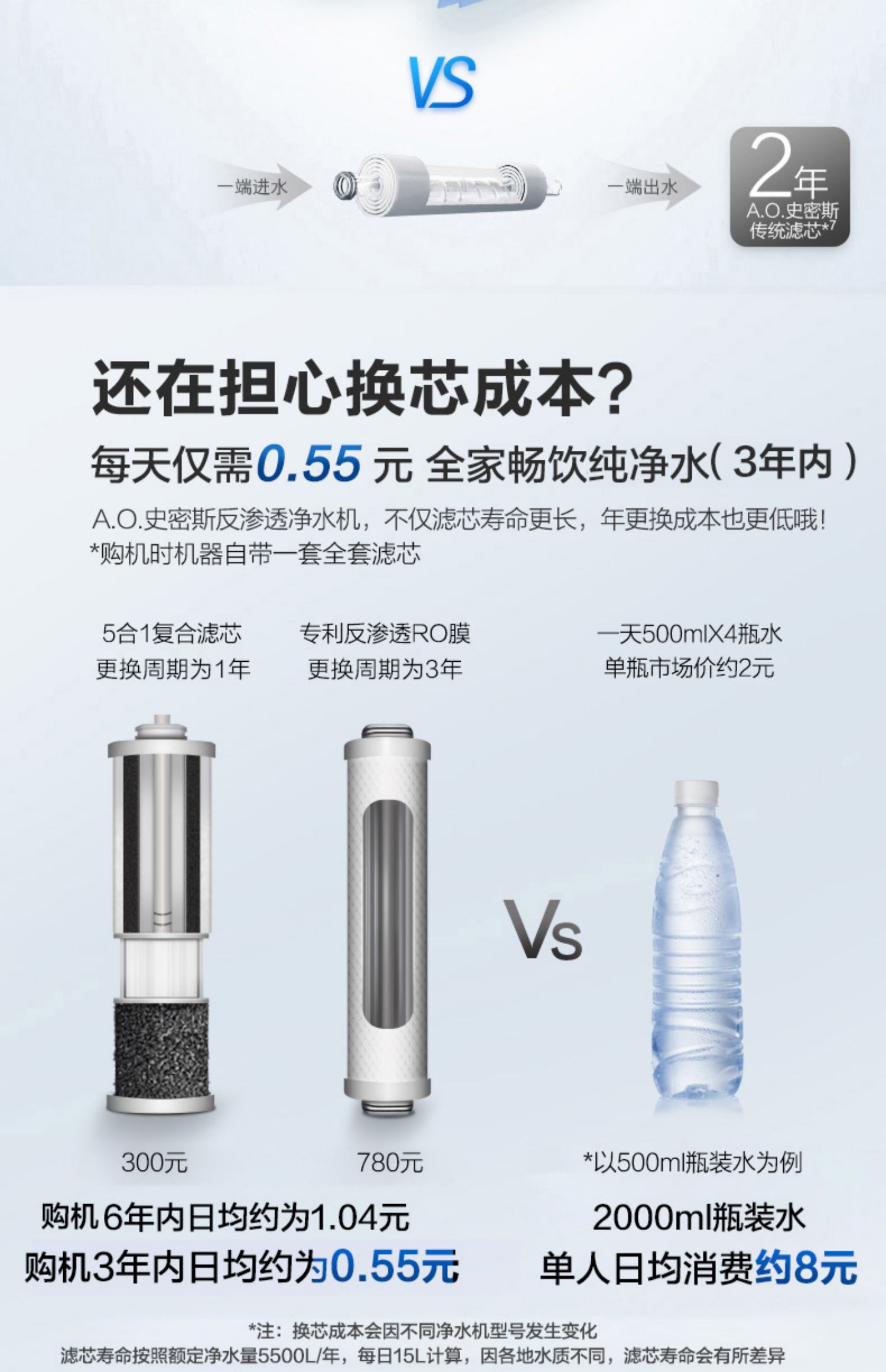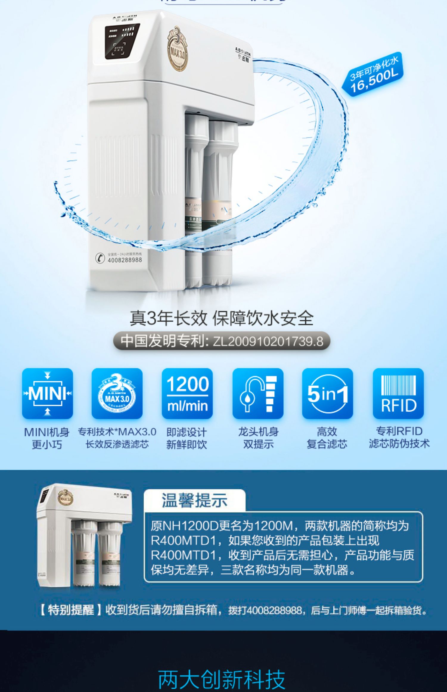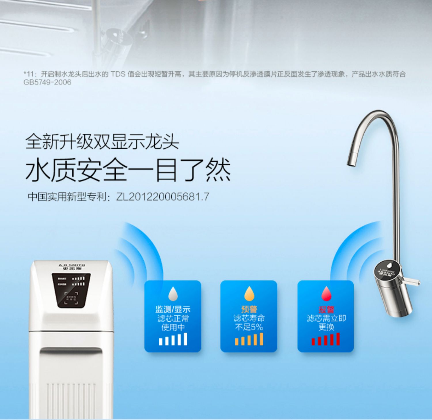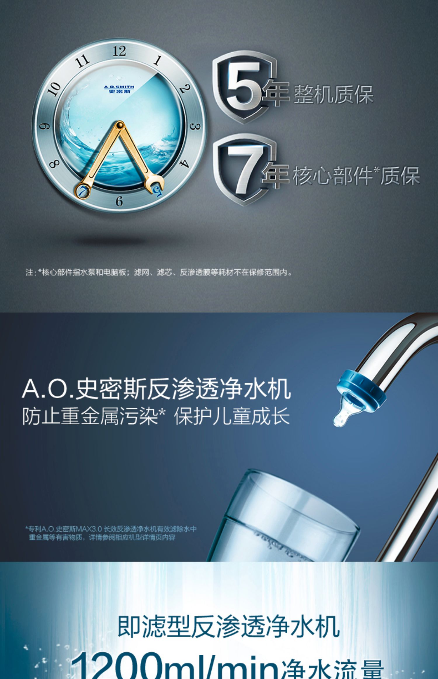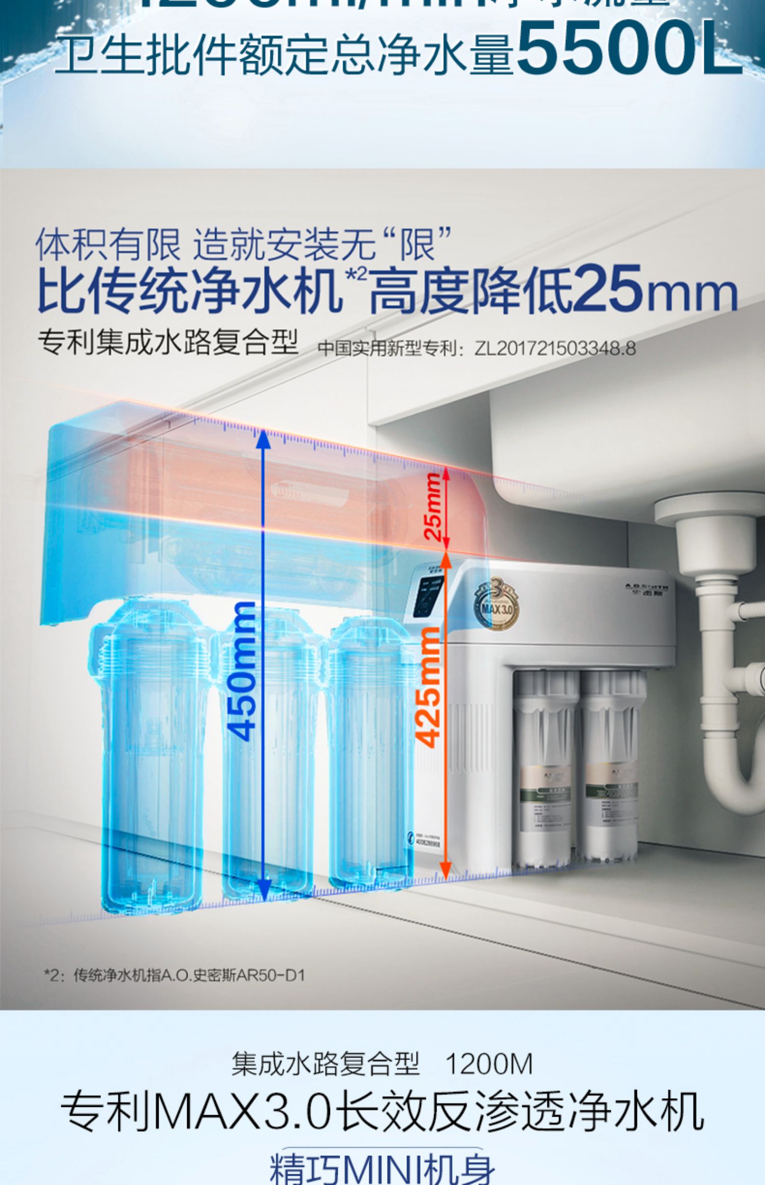 AO史密斯1200M家用自来水过滤厨房净水器反渗透直饮净水机滤芯