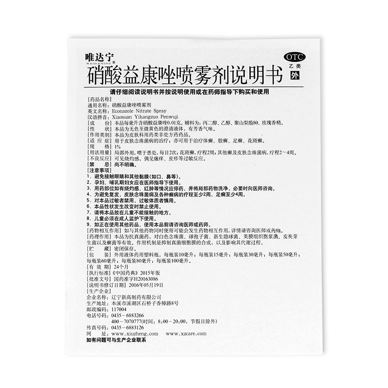唯达宁硝酸益康唑喷雾剂 1%*60ml*1瓶/盒 皮肤念珠菌病 体癣股癣