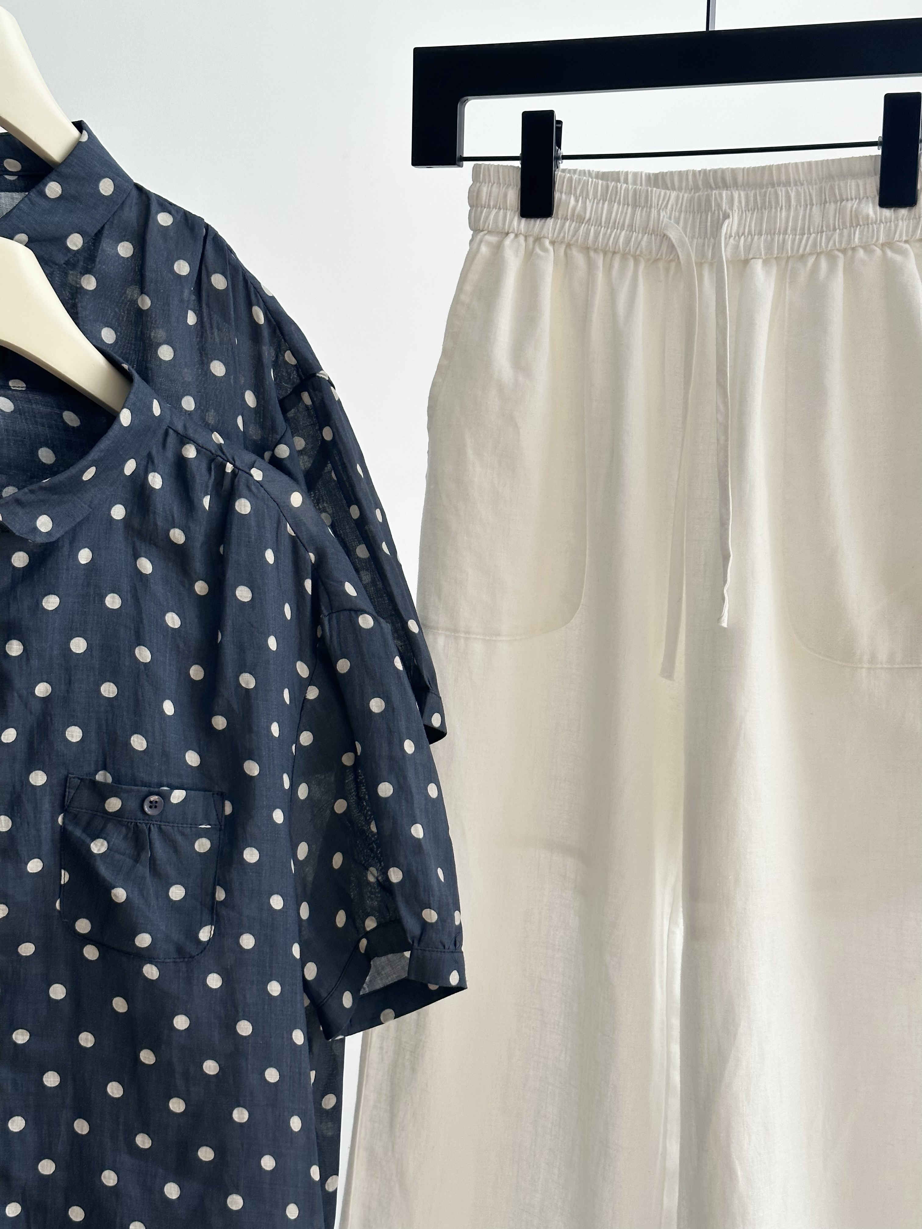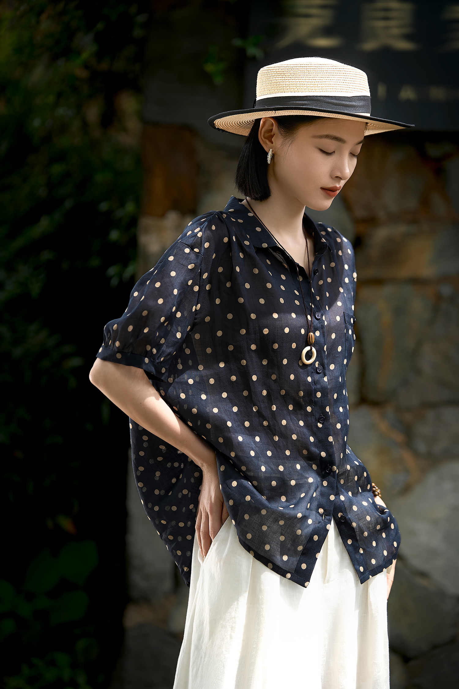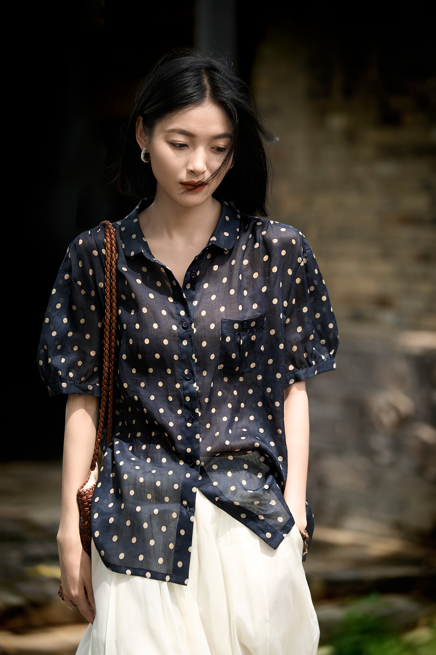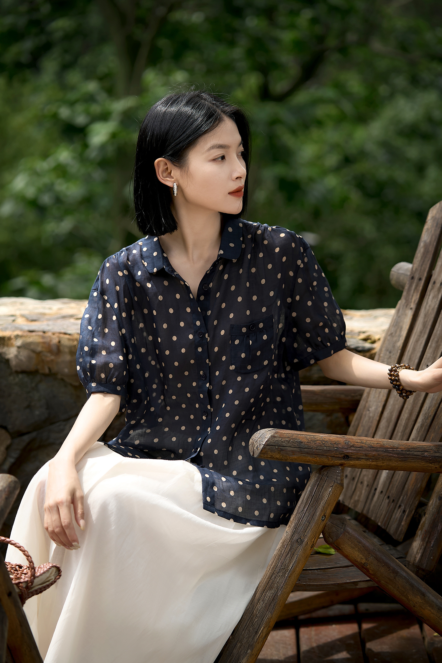 藏青底色搭配浅米色波点,简约中透着复古韵味,无论是通勤上班,还是周末出游