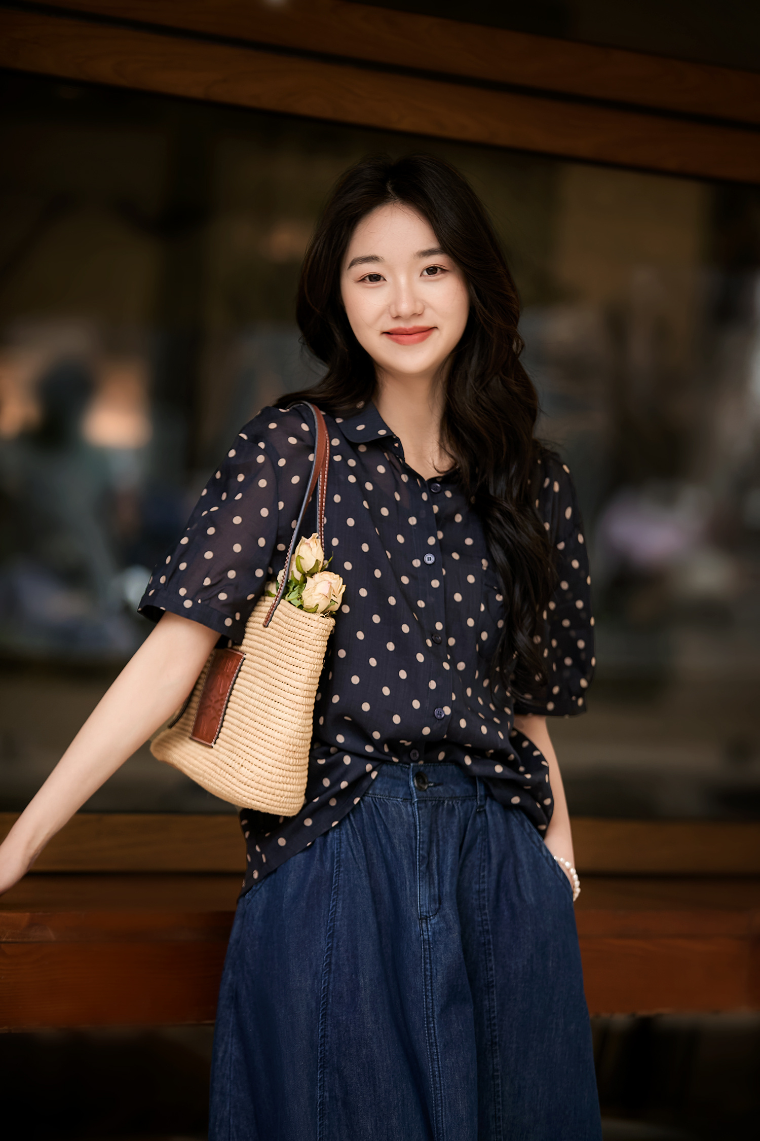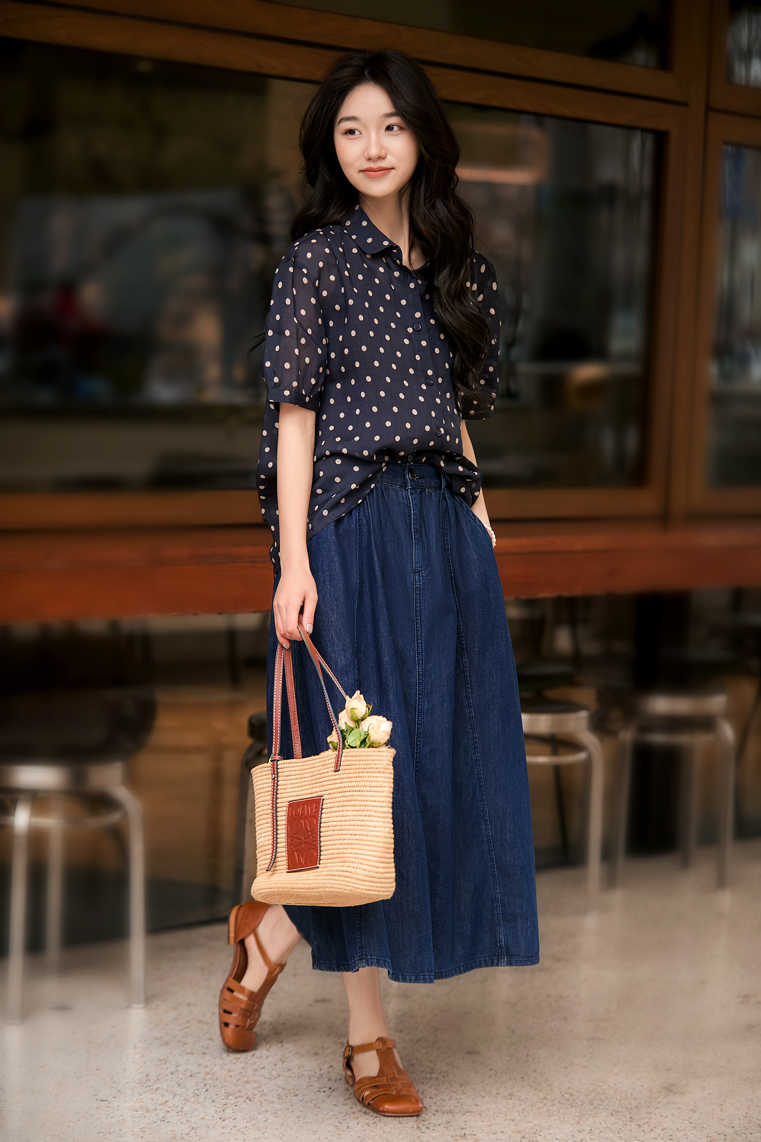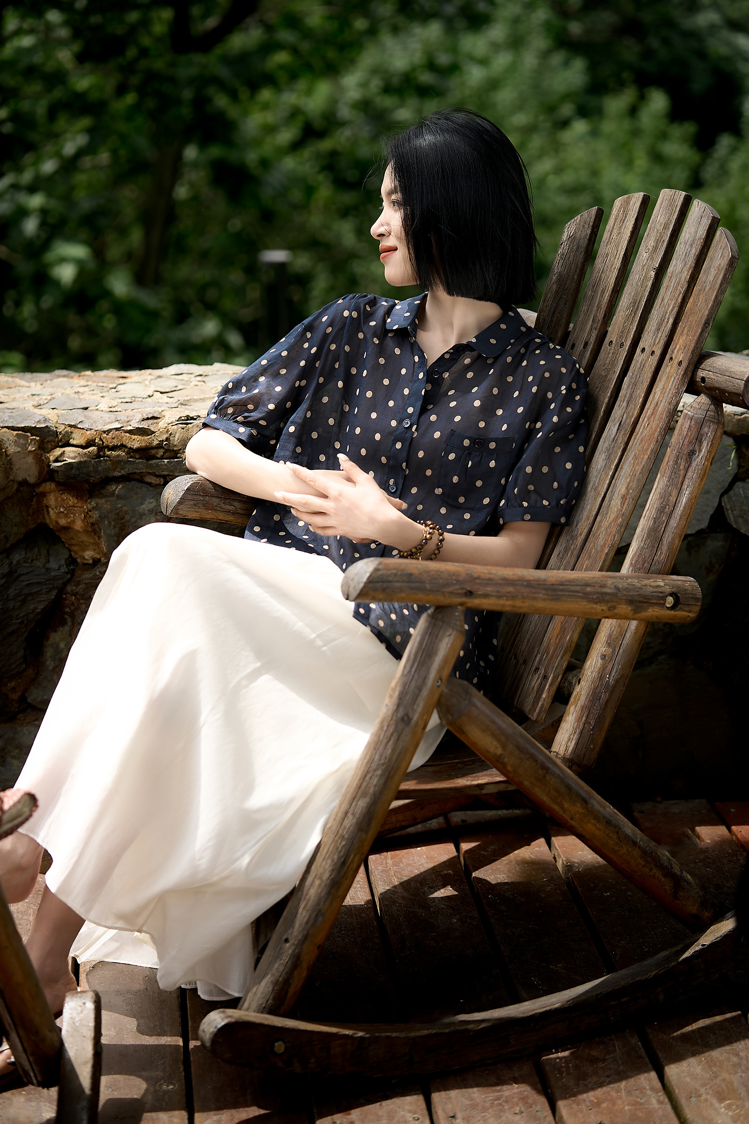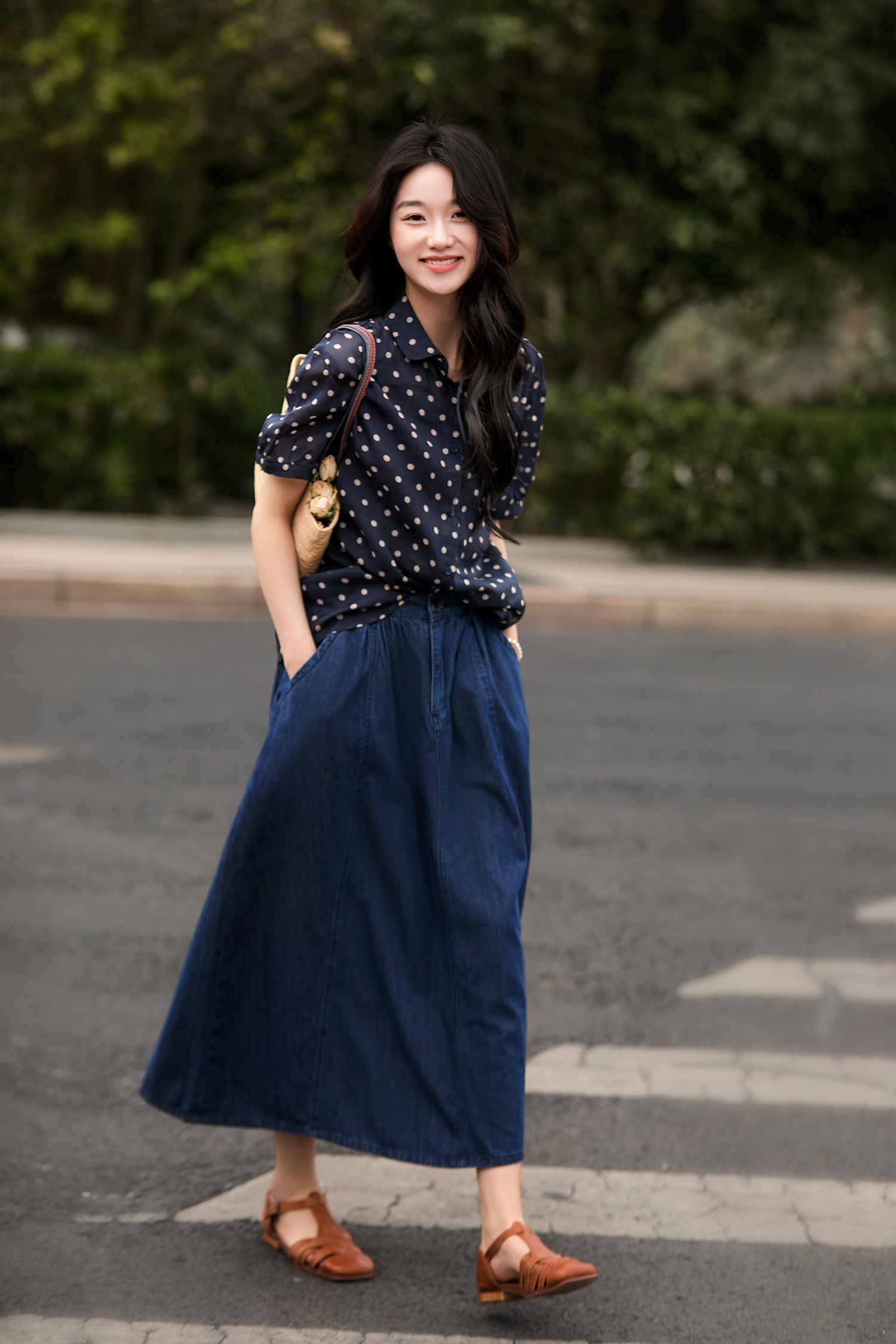 藏青底色搭配浅米色波点,简约中透着复古韵味,无论是通勤上班,还是周末出游