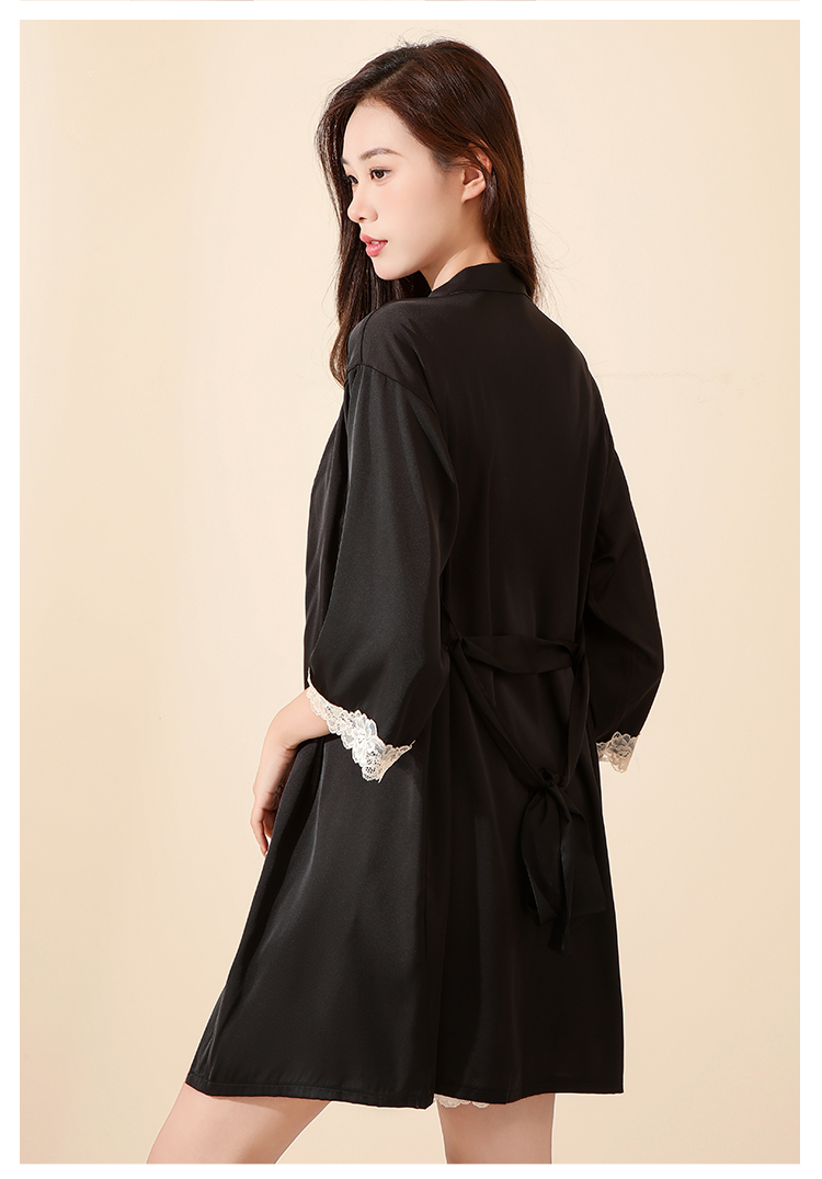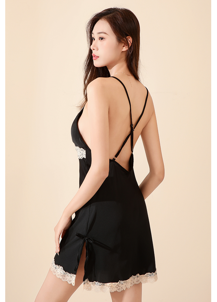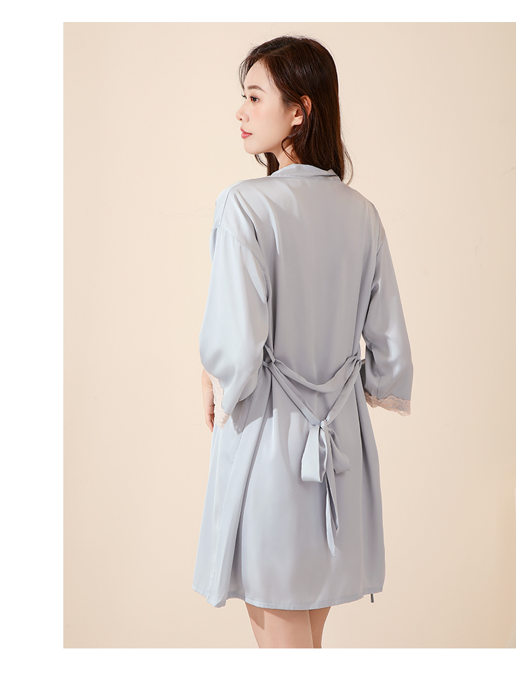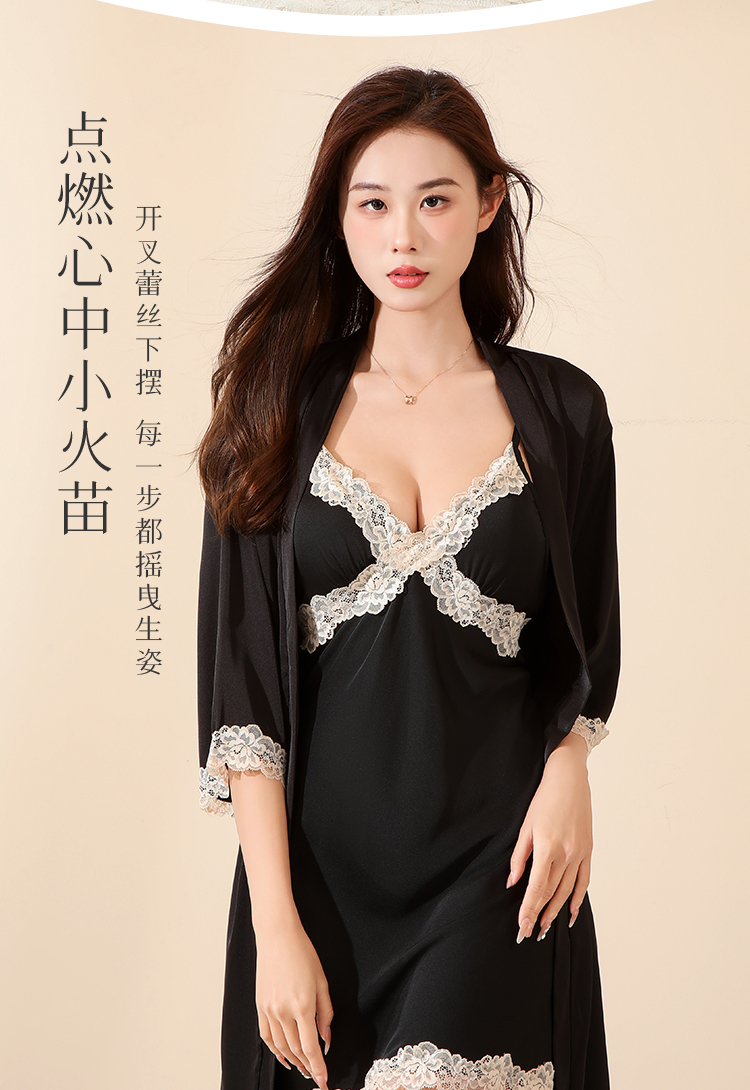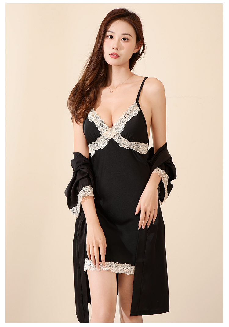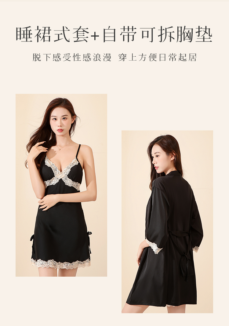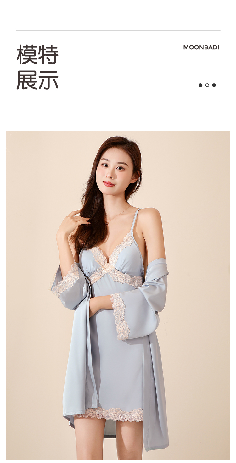 法式蕾丝冰丝缎面吊带睡裙套装性感美背睡衣带睡袍家居服2283冰之蓝睡裙