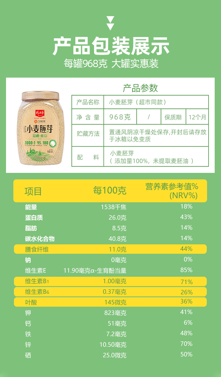 精力沛低GI小麦胚芽含硒原味纯胚芽麦片谷物杂粮即食早餐968g