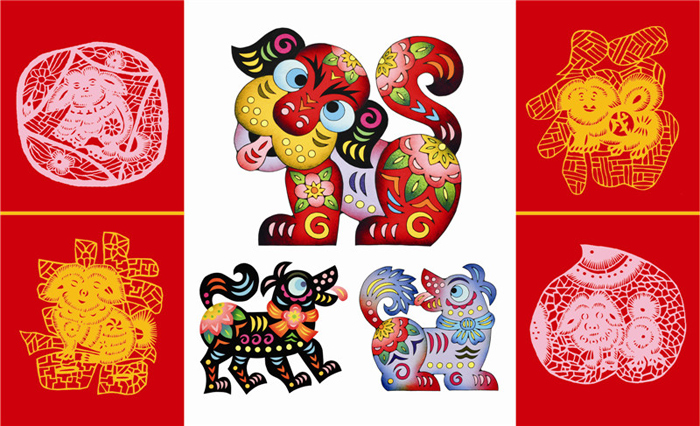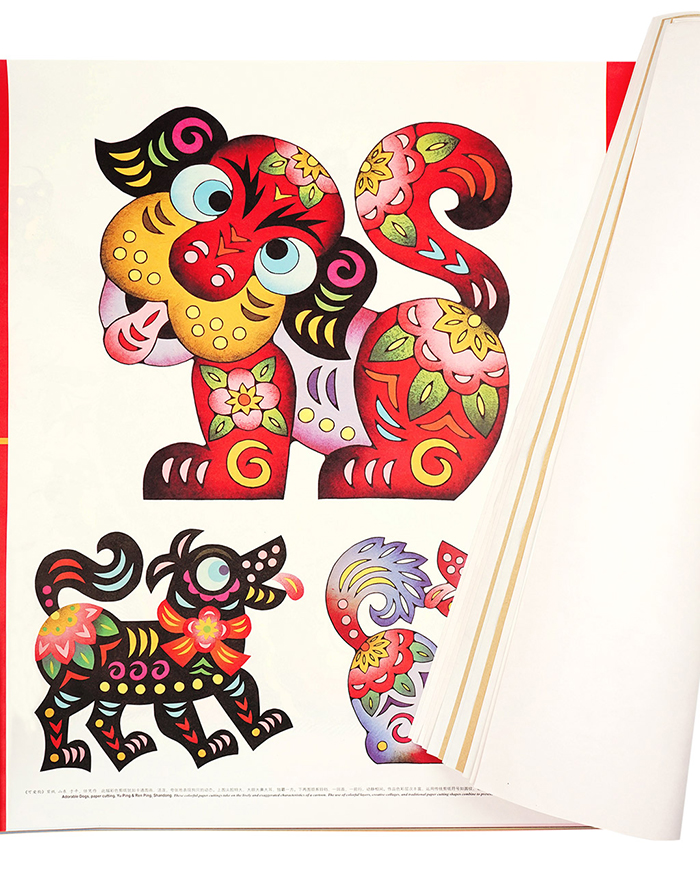 《可爱狗》犹如卡通图画,活泼夸张地表现狗只的动态,色彩层次丰富,运用传统剪纸符号再加上创意手法,呈现新颖的现代感。《福寿财囍狗》属于山东高密的传统剪纸,风格细致,地区性特点明显。