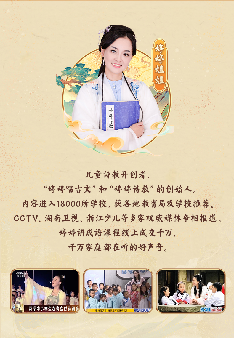 - 婷婷姐姐,孩子们最爱的家庭教师,已将百余首古诗词谱曲成歌,并广为流传。当下炙手可热的“婷婷唱古文”和“婷婷诗教”的专栏创作者,现代诗教开创者,倡导儿童教育从诗教开始。