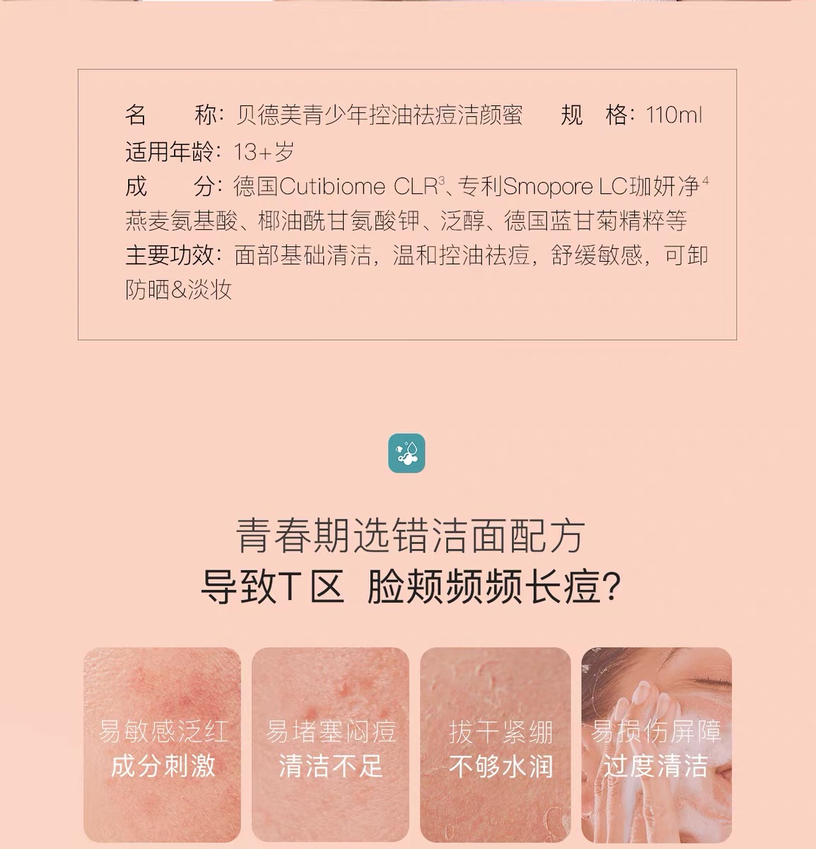 【春上新】9楼母婴生活馆 贝德美青少年洁面乳控油祛痘儿童洗面奶110mL 吊牌价:49.9元 活动价:39.9元