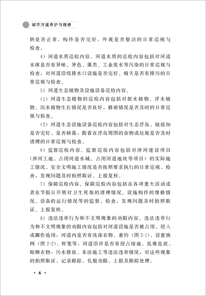 为了延长城市河道的使用年限,确保城市河道的环境治理、生态修复等功能,确保其服务水平与安全,本着“建养并重、以养为主、预防为主、防治结合”的原则,应采取有效的养护措施。本书主要内容包括河道养护概述、河道巡检与监测、河道保洁、河道生态养护、河道常态化清淤、河道设施养护与维修、河道养护应急管理、河道养护资料管理等。本书按照最新国家和行业标准规范编写,具体较强的实用性、针对性和可操作性。