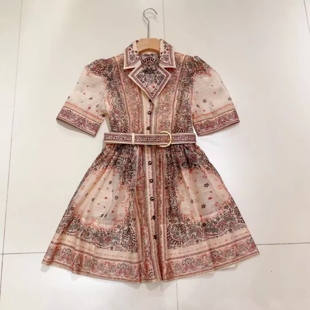 HJ2S99_水红色/如梦令色_连衣裙_夏季_衬衫领收腰腰带复古腰果花印花显瘦气质 A 字短裙_高级女装_BERNIEELEN 伯妮斯茵