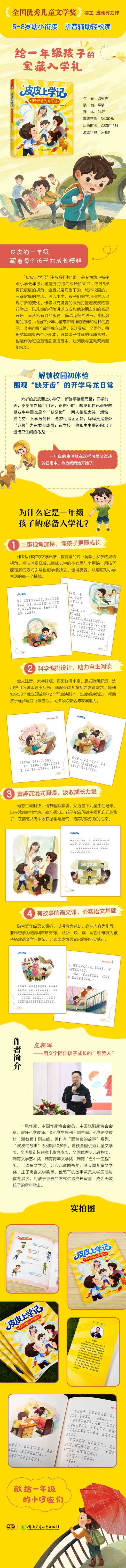 ;皮皮上学记注音系列是专为幼小衔接及小学低年级儿童量身打造的成长桥梁书,通过6岁男孩皮皮的视角,全景式展现当下的、城市校园的、三孩家庭的生活。进入小学,孩子们的学习和生活出现了新的变化。作者以充满爱的眼光打量着皮皮的言行举止,以儿童的视角讲述皮皮和他的朋友们的喜怒哀乐,其从容有致的叙述,简洁流畅的语言,幽默风趣的风格,给当下少年儿童带来精神的陪伴和成长的启示。书中的每个故事独立成篇,又连贯成一个整体,每册结尾都有两个小剧本,为孩子的童话剧表演提供范本,适合58岁孩子阅读。