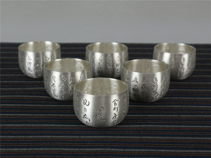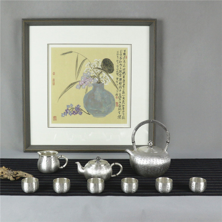 此系列由提梁壶、小持壶、公道杯与6只茶杯组成,器身以心经文字为饰,银色灿烂,禅意于品茗器具之间流淌,茶香在心经诵读之间弥漫。