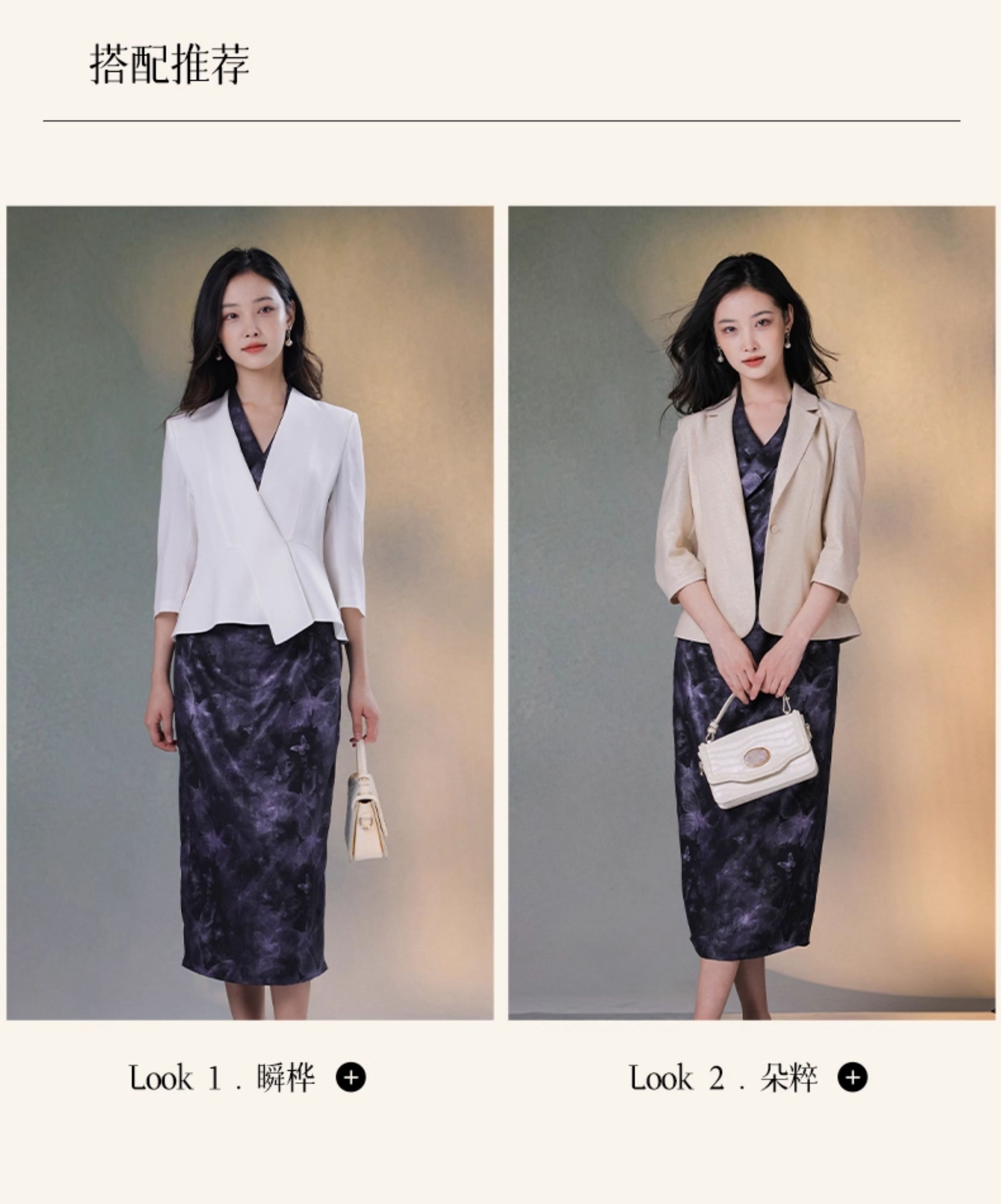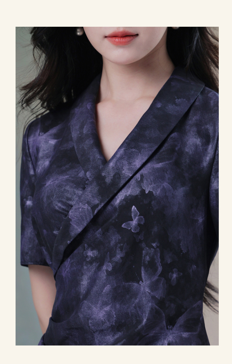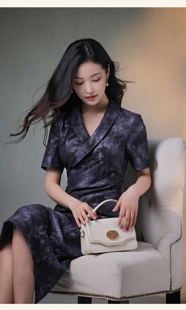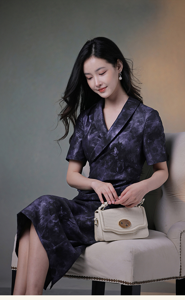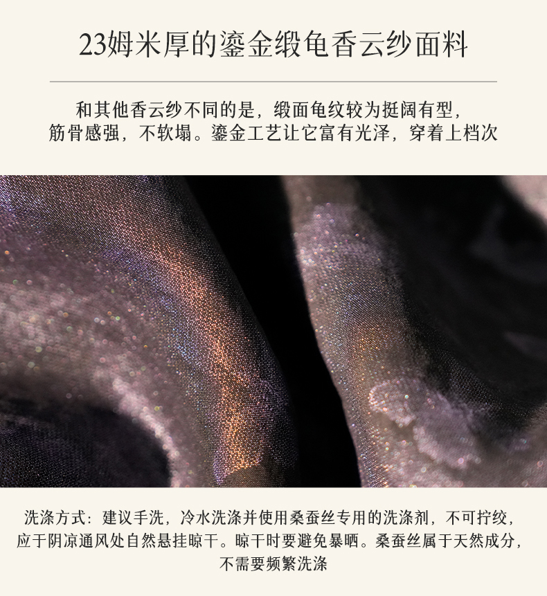 逸红颜谧影2025早秋新款鎏金缎龟香云纱通勤西装翻领叠褶连衣裙女