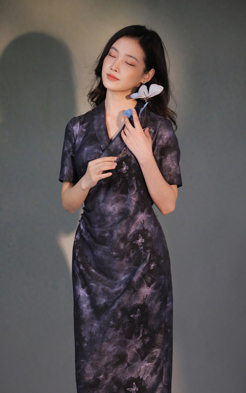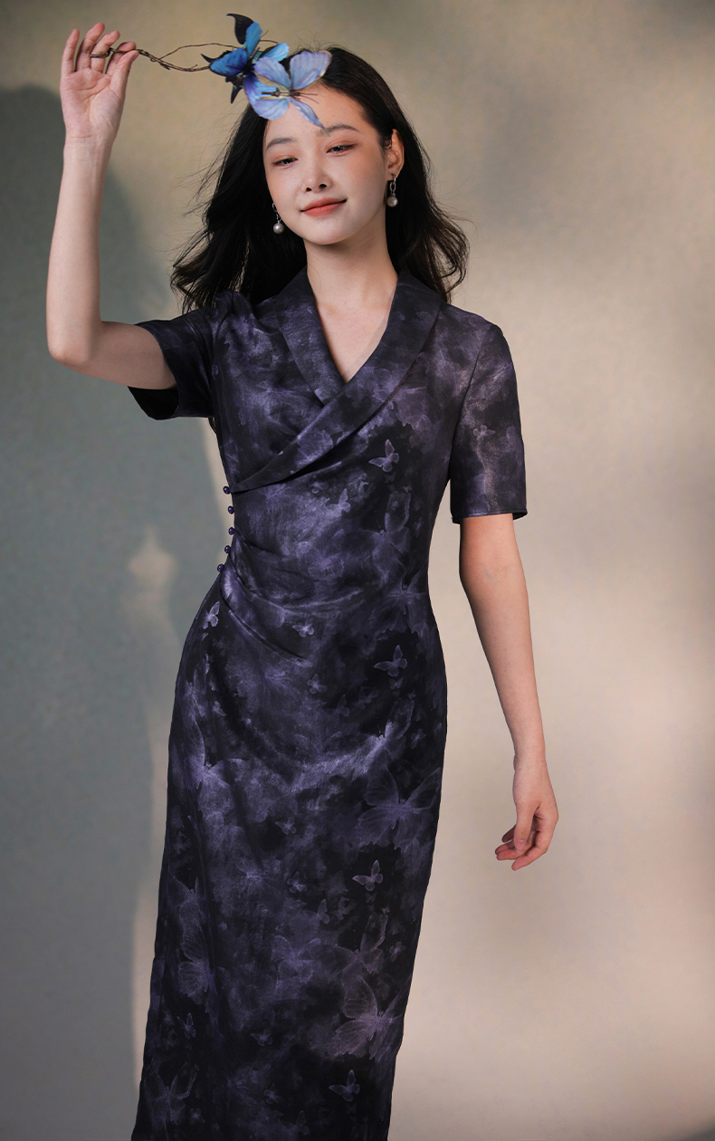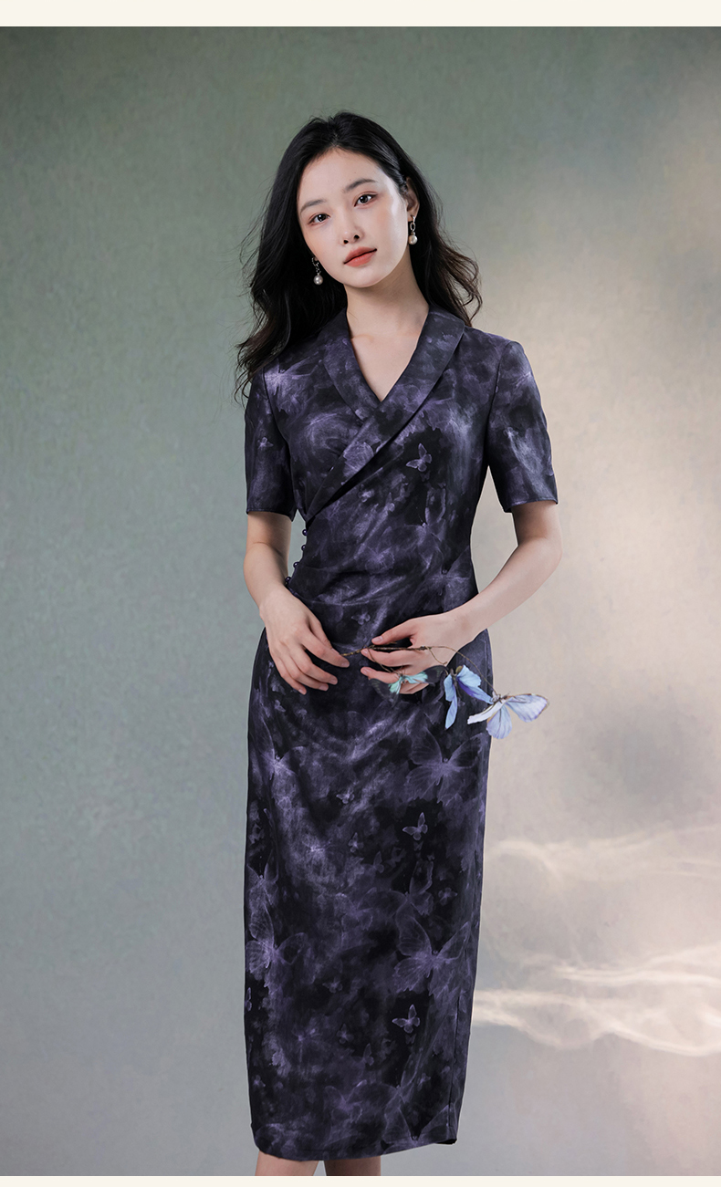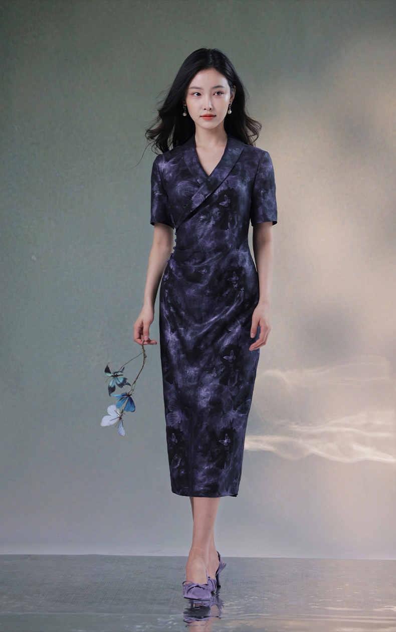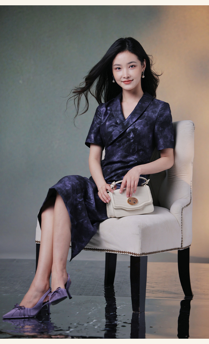 逸红颜谧影2025早秋新款鎏金缎龟香云纱通勤西装翻领叠褶连衣裙女
