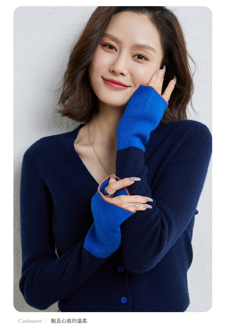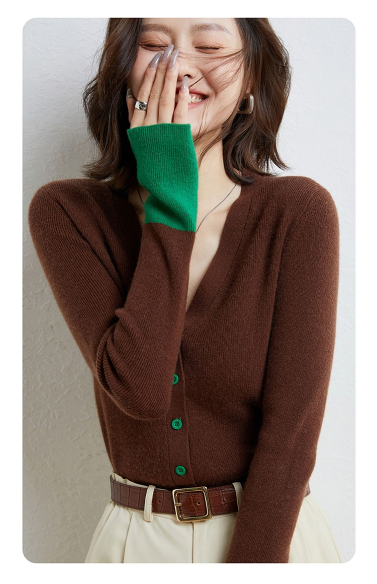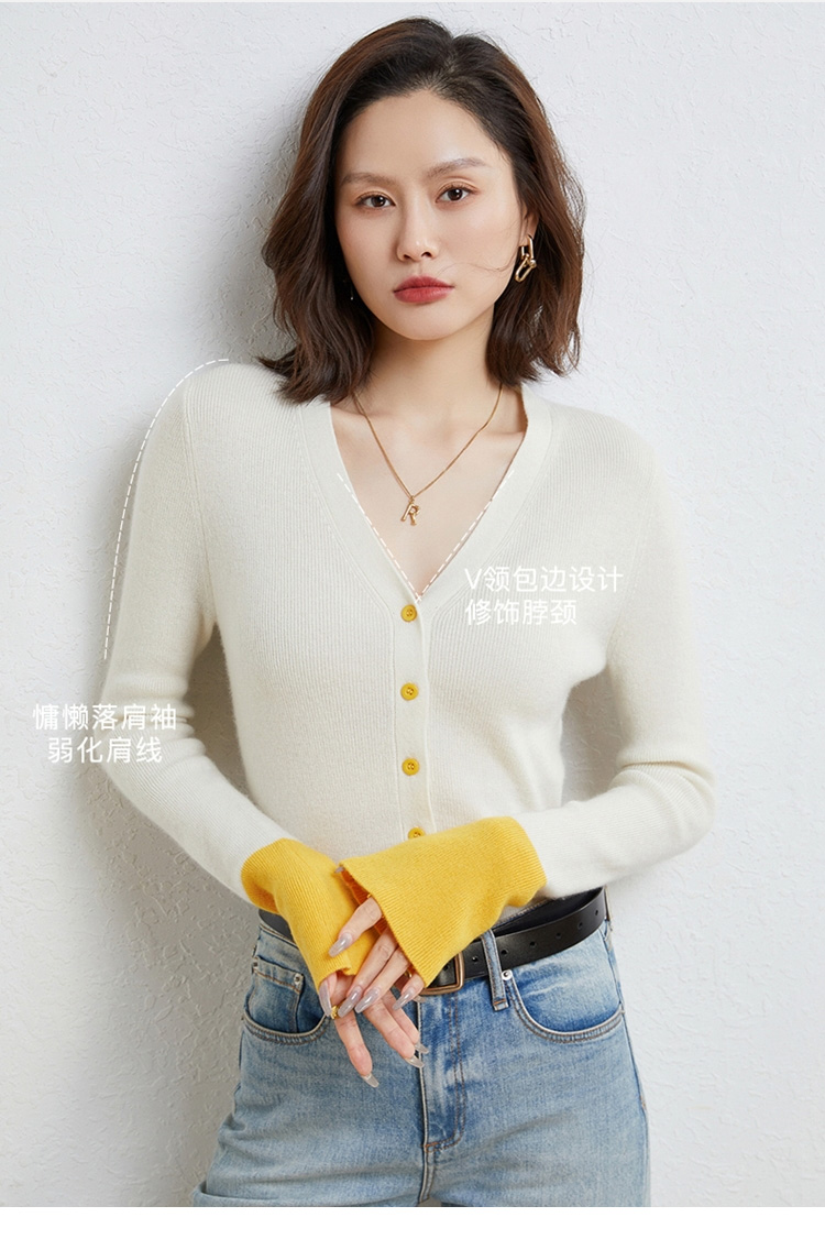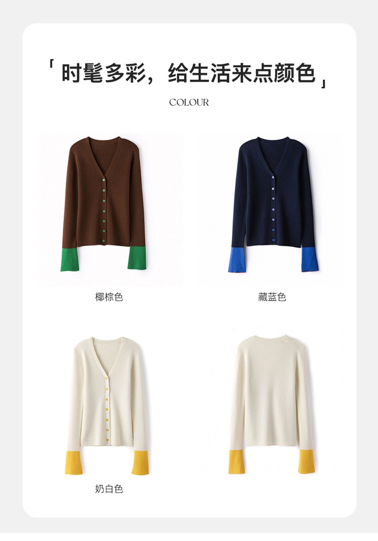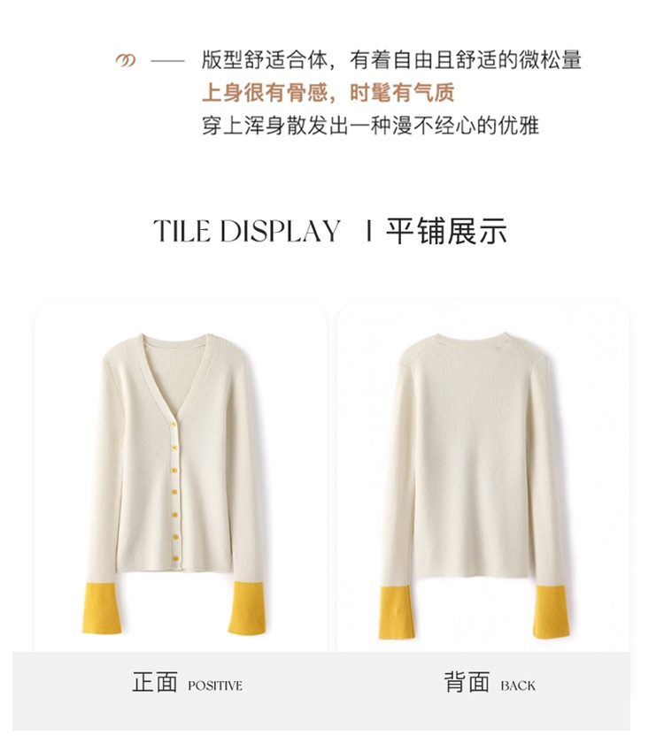 【秋冬时尚搭配】雾感喇叭袖拼色羊绒开衫 V领百搭条纹针织开衫 修身显瘦轻盈合体 柔软细腻温柔高雅
