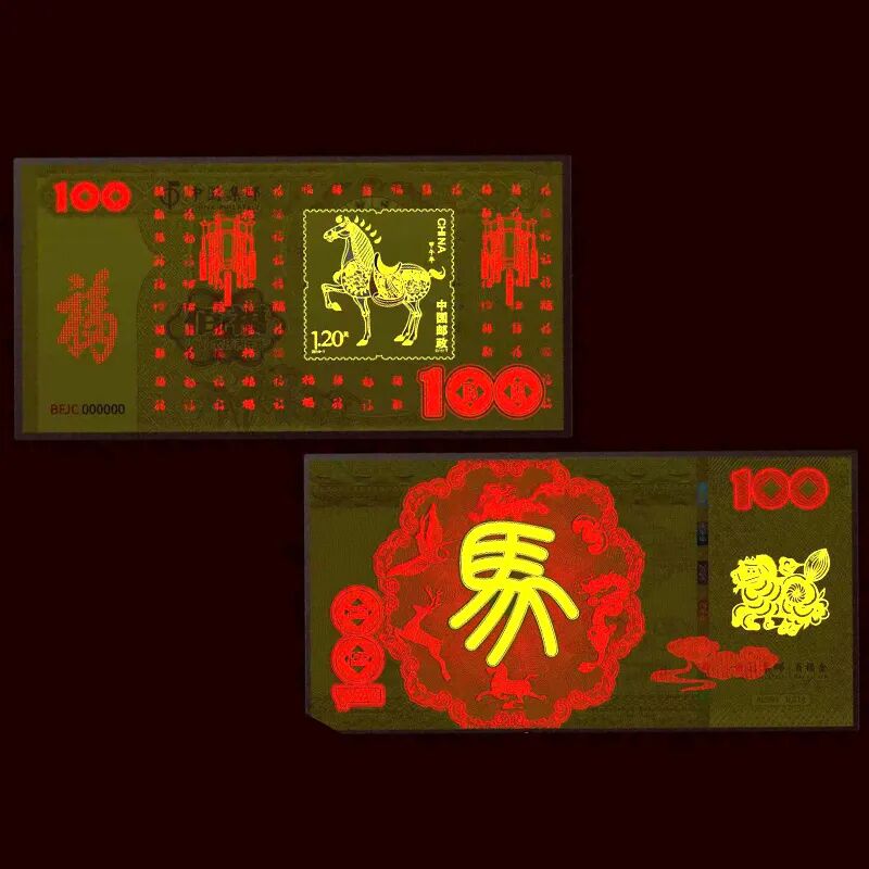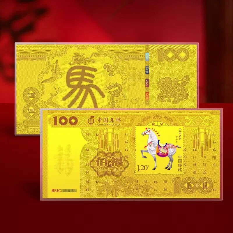 为什么金钞的热度这么高?因为这套生肖金钞由999足金铸造!现在首饰金价都涨到1400元/g了!黄金本身就有升值和保值的功能。更惊艳的它应用了人民币特有的荧光油墨,在紫光灯下百福图案璀璨生辉。2026马年百福金钞统一发行价198元,我们今天活动价128元兑换!很多藏友都会趁着活动特价一次预订5套或10套,年底送人送礼或包红包都用得上!有实力的朋友建议直接入手10套靓号,趁着今天特惠价,不然临近年底又要涨价了,而且还不一定有货!十二生肖百福金钞,由中国集邮官方发行,极具权威性!选取吉祥喜庆的生肖邮票为主要设计元素,以中国传统福文化为脉络,钞形贵金属为载体,将百福文化与中国生肖邮票完美结合。今年金价屡创新高,送上这样有“含金量”的礼物,真是太有心了!正面为马年邮票图案,马身装饰牡丹纹样,马鞍绘有红色蝙蝠,寓意马上得福。周围辅以灯笼、竹子等元素,背景选用百福图、吉祥花纹为衬托,表达百福具臻,吉祥如意的美好寓意。背面是神兽图案衬托古体书法“马”字,右侧配以中国传统剪纸生肖马,并辅以“100”和“福”的字样,寄托人们祈盼福瑞降临的美好心愿。钞面整体融入AU.999纯金铸造,五彩缤纷的光变安全线,防伪功能强悍。生肖金钞还采用了出色的荧光油墨工艺。晚上在紫光灯或验钞机的照射下,美轮美奂,熠熠生辉!除了马年金钞,更具价值的十二生肖金钞大全套今天同步预约!大全套珍藏册将十二张生肖百福金钞一次集齐,省时又省力!大全套的全国发行量只有5000套,稀缺就量少为王!十二生肖文化源远流长,这套百福金钞不仅以生肖文化为主,同时还结合了传统百福文化,寓意美好。烫金的“中国集邮”彰显权威,大红色调又很符合新年喜庆的氛围,送礼相当拿得出手。2026马年百福金钞统一发行价198元,我们今天活动价128元兑换!满4套包邮!
