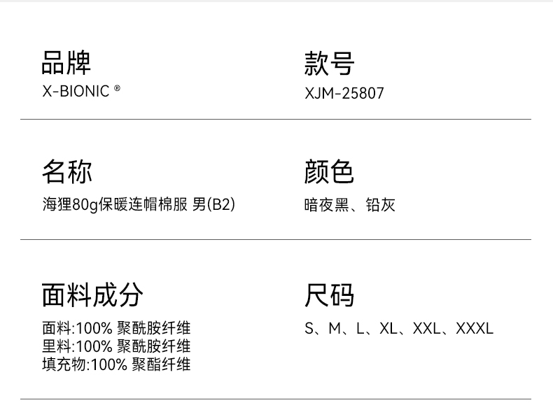 X-BIONIC 海狸80g金标P棉保暖连帽棉服 男 (B2) 秋冬徒步男士棉衣25807