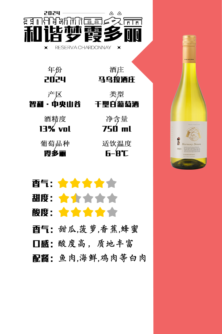 【智利精选】马乌拉酒庄和谐梦珍藏霞多丽白葡萄酒 750ml 2024