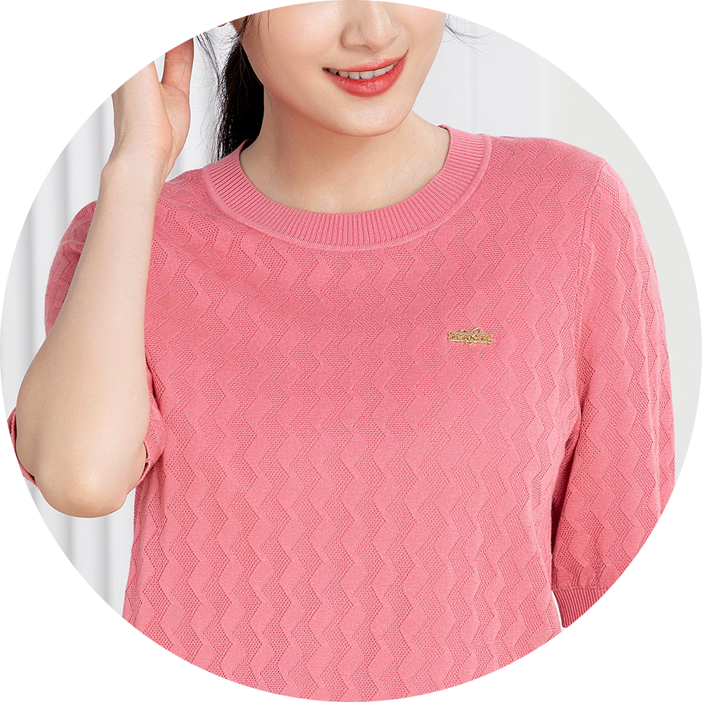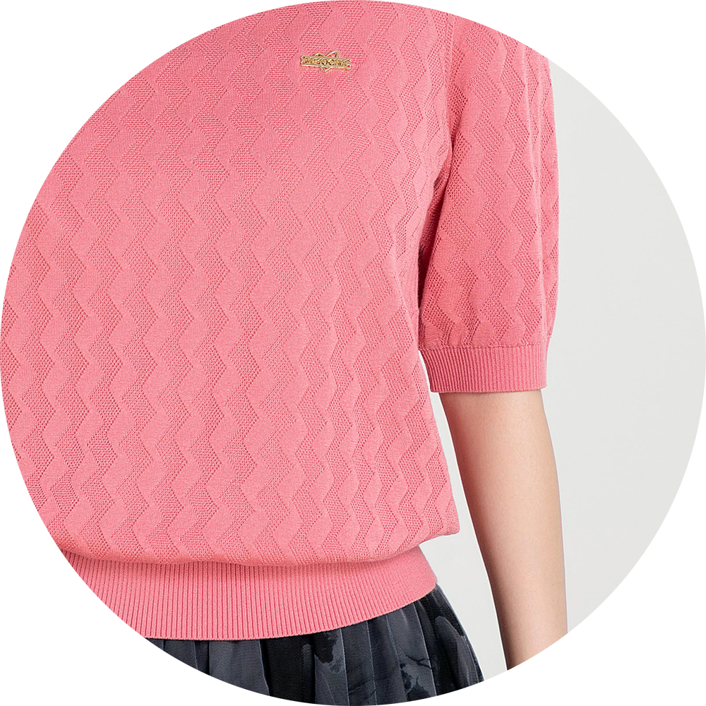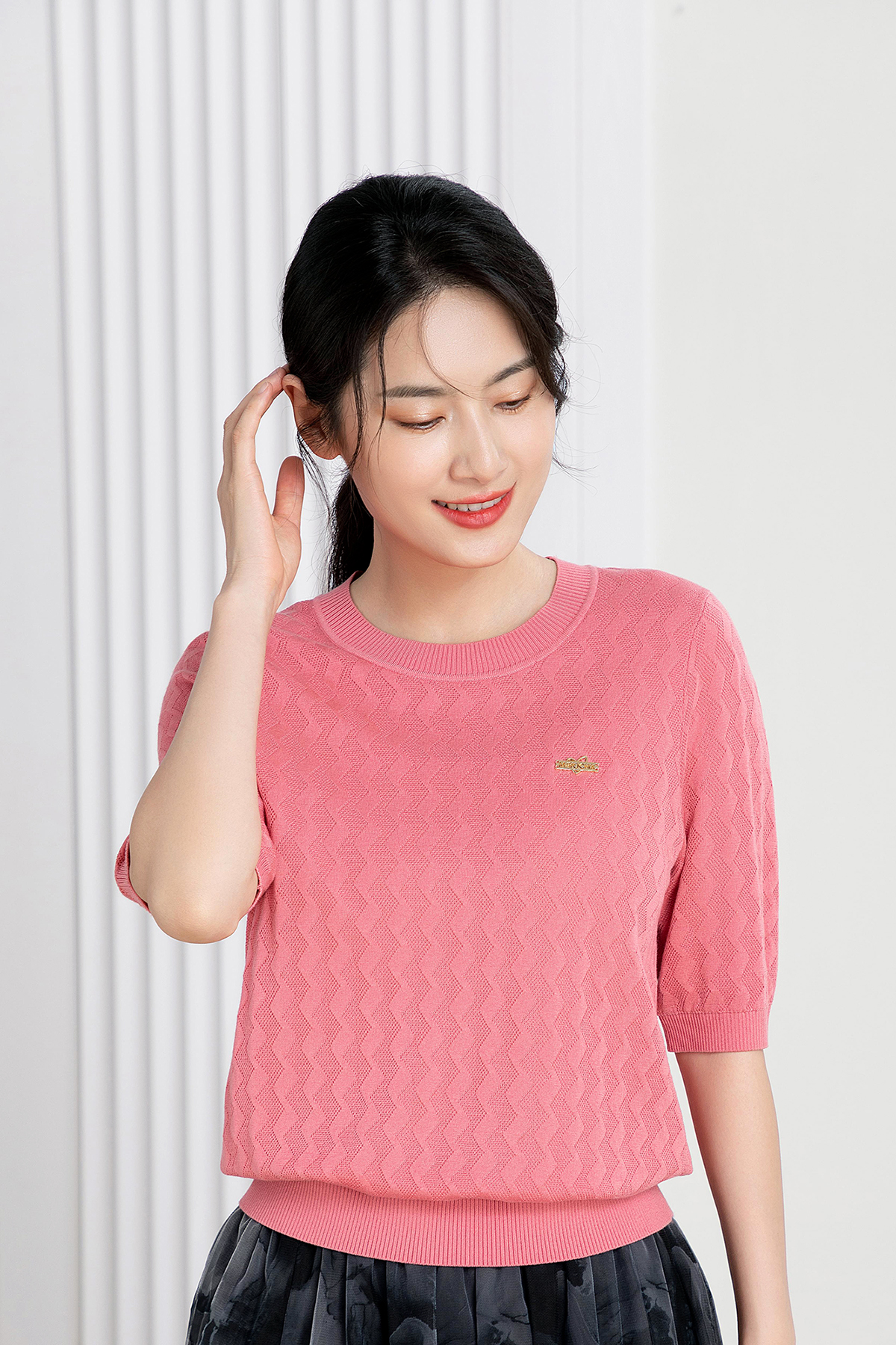 伯妮斯茵 | 温柔甜美风 粉色波浪纹圆领短袖针织衫 春夏气质百搭上衣 HJ3E01