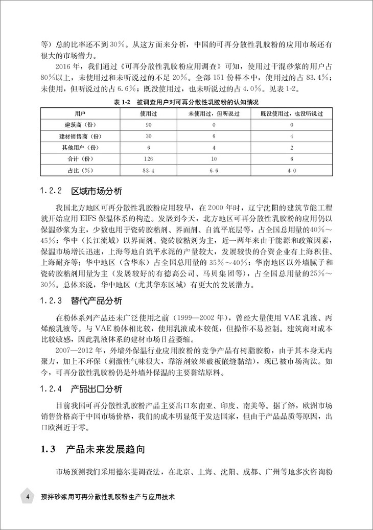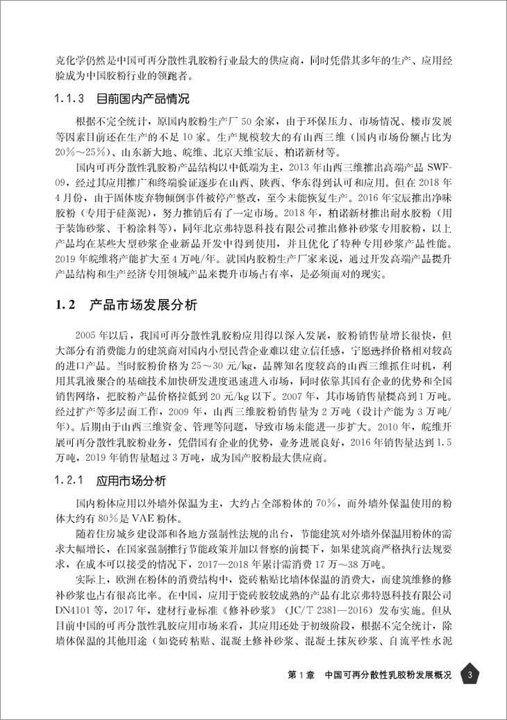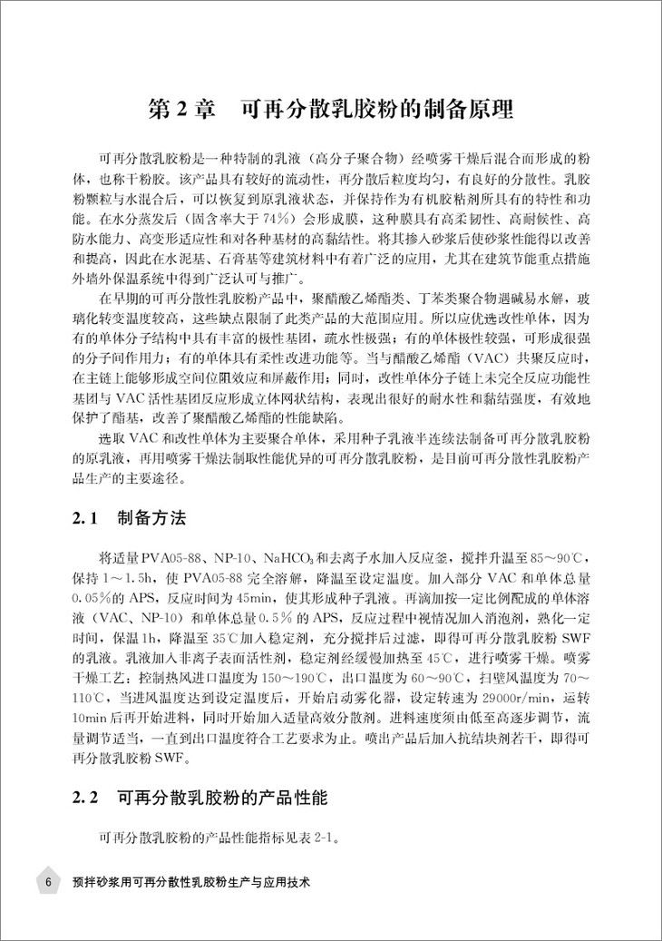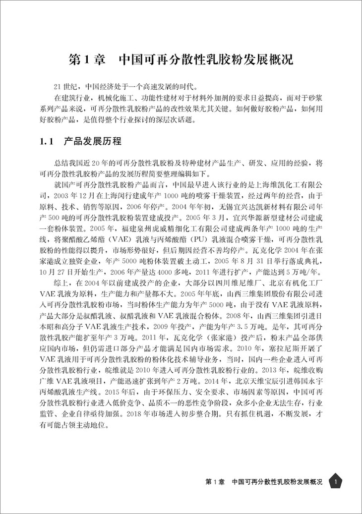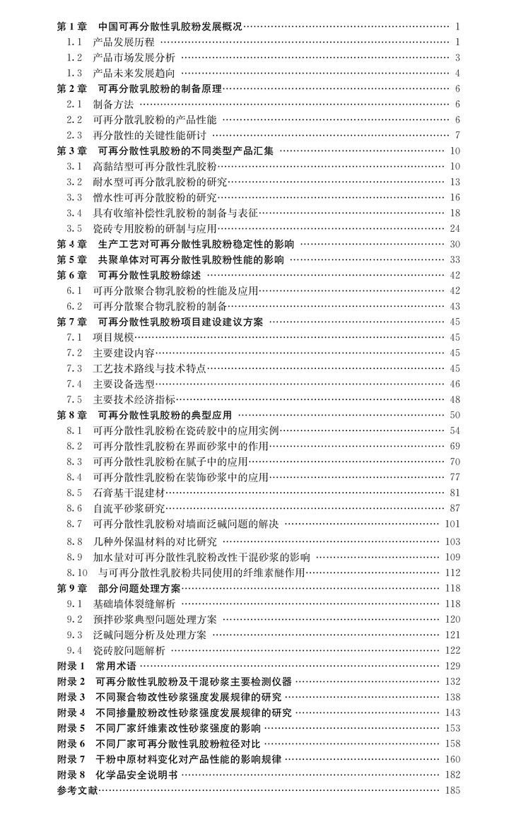 为此,作为预拌砂浆外加剂最为重要的品种之一,可再分散性乳胶粉行业如何更好更快地提升产品品质、降低产能消耗,创新研发出绿色环保、能更好满足建材业需要的产品,将是可再分散性乳胶粉行业所有从业者和科研人员必须面对的现实问题。本书从可再分散性乳胶粉的生产入手,回顾行业发展近20年的历程,汇集建材行业各个领域的应用技术和问题处理,用实际行动践行国家“创新、协调、绿色、开放、共享”理念。这些行业工作者的智慧结晶和宝贵经验将给您的工作带来启发,相信也能为您提供扩展思路的灵感。我们期待各位同仁能在此基础上,继续创新、不断进步,为中国的建材外加剂升级进步而努力!