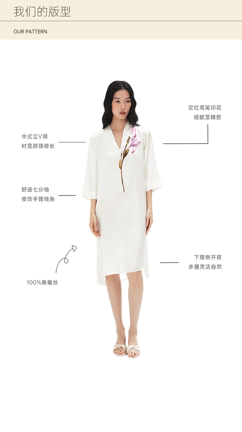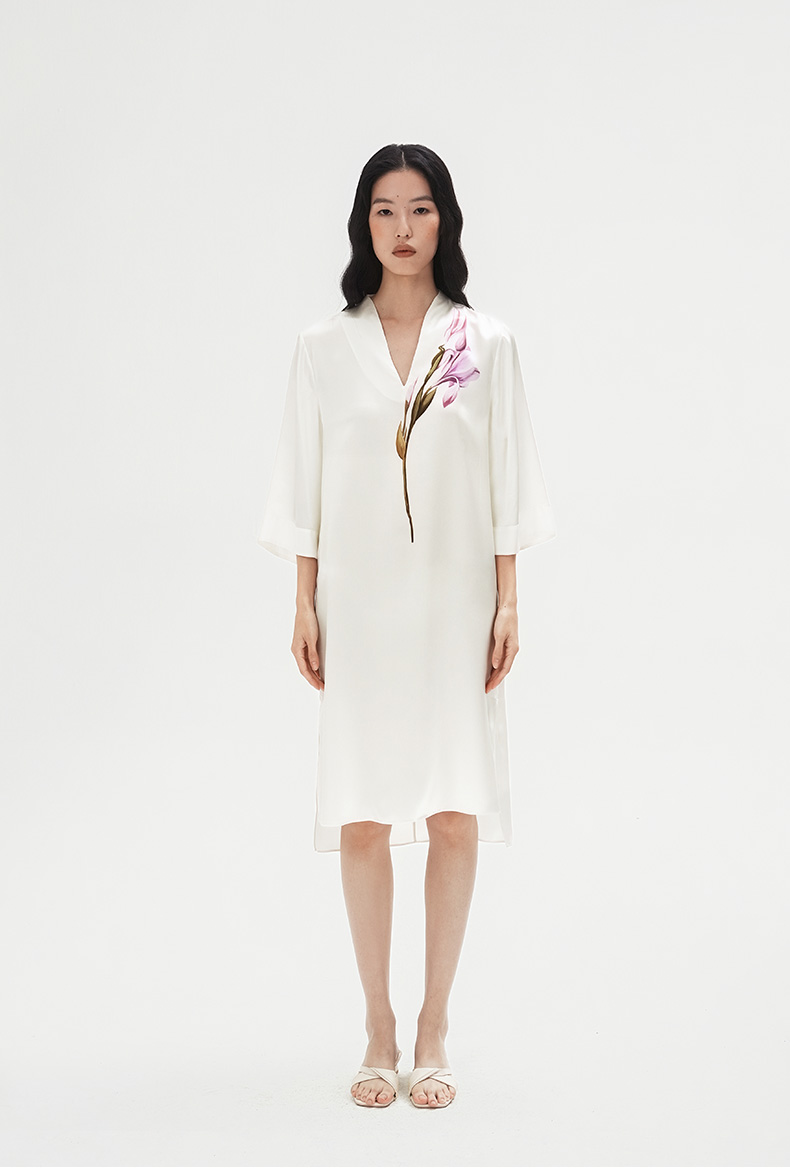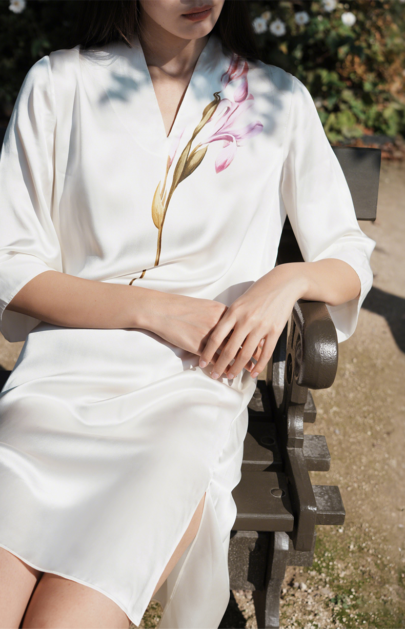 东方鸢尾』桑罗中式V领连衣裙桑蚕丝女士中袖睡裙可外穿