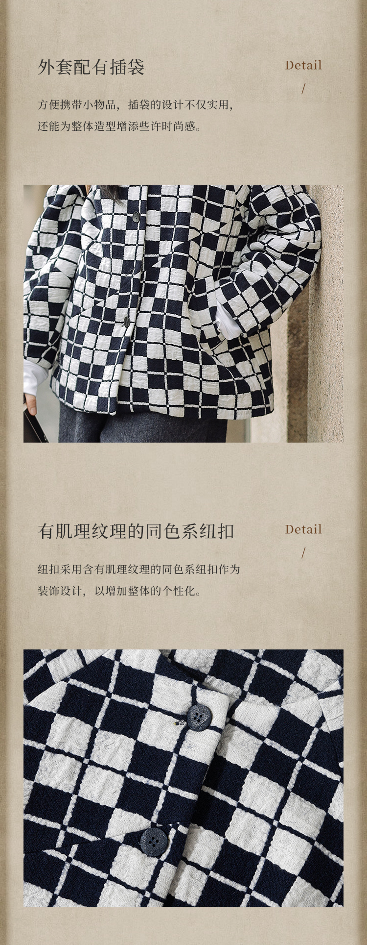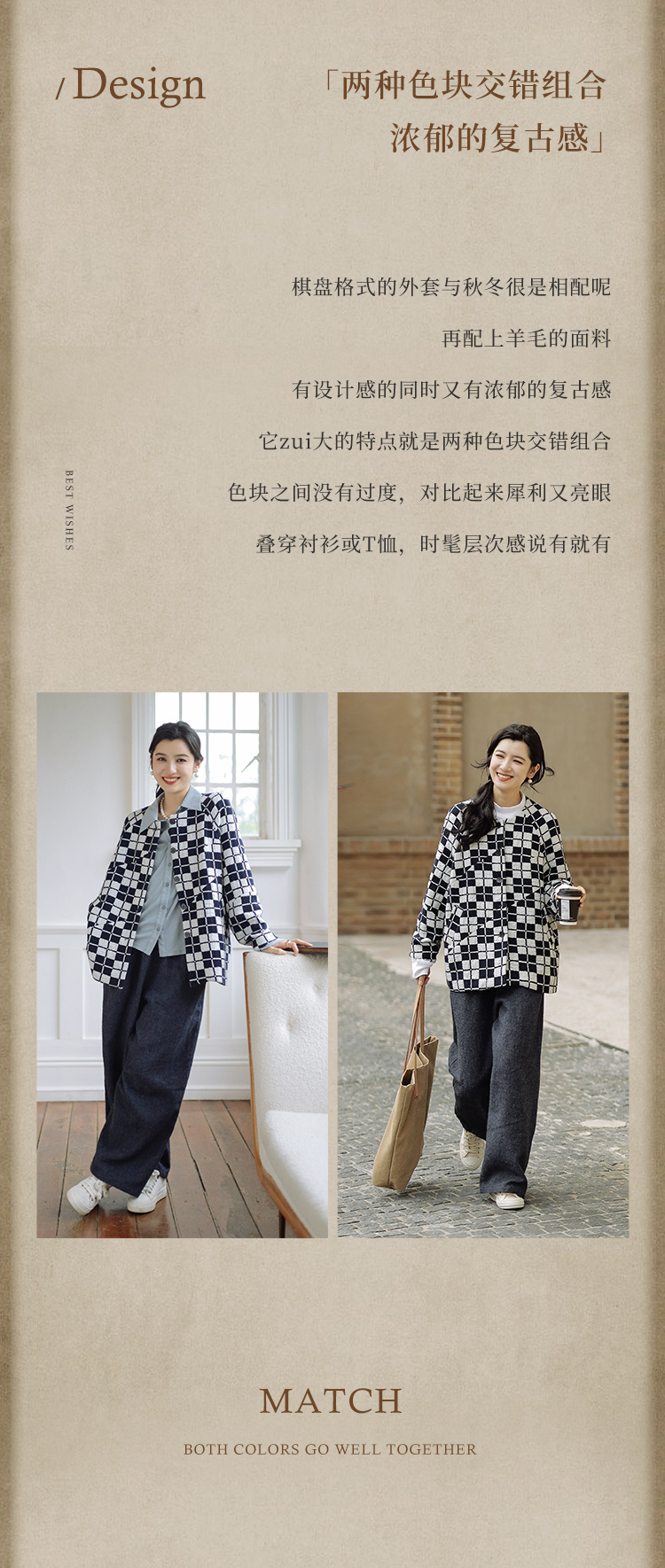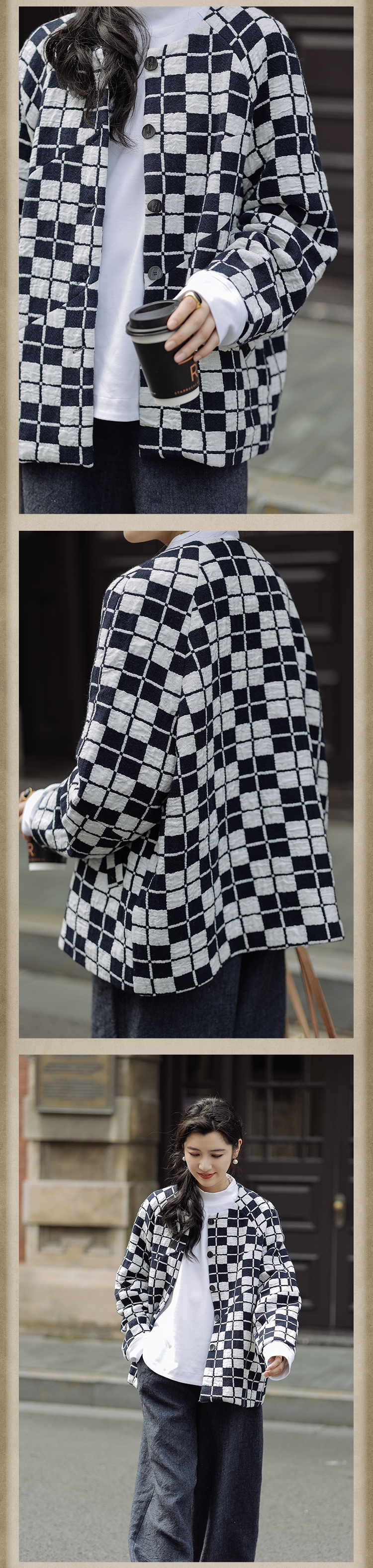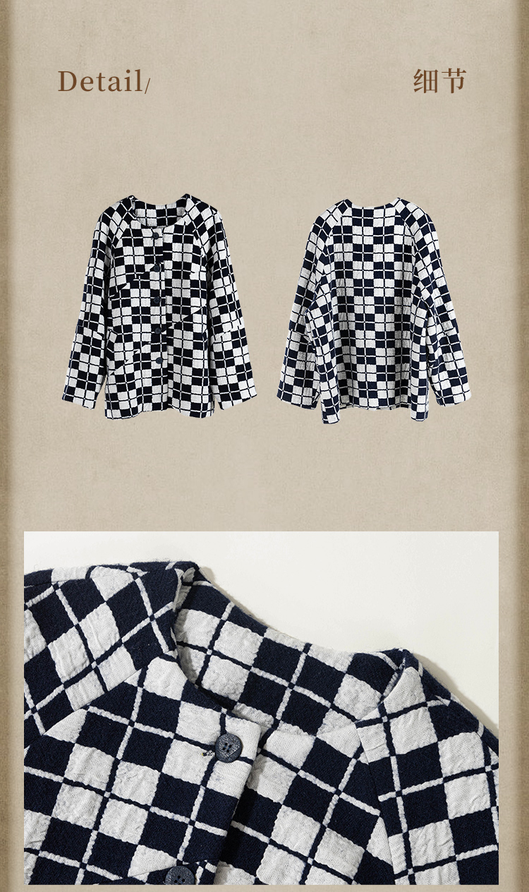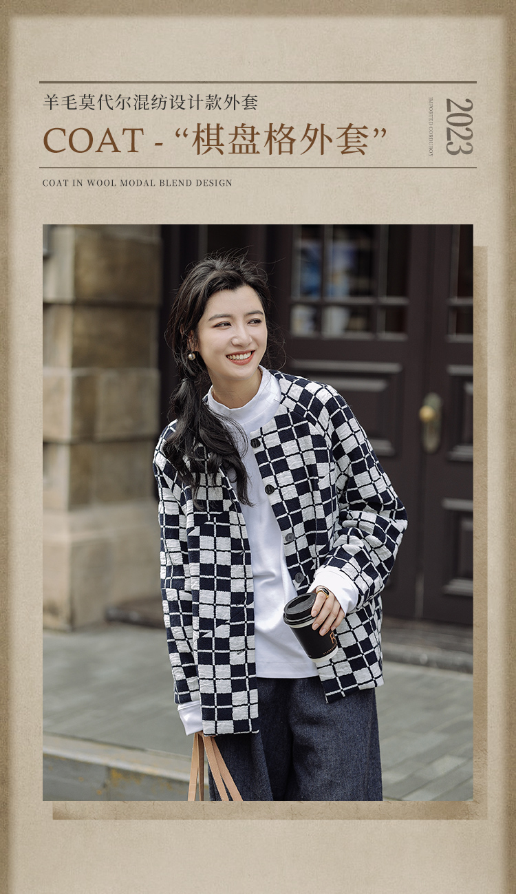 绽放735朵/复古棋盘格羊毛莫代尔棉立体感插肩袖设计毛呢外套