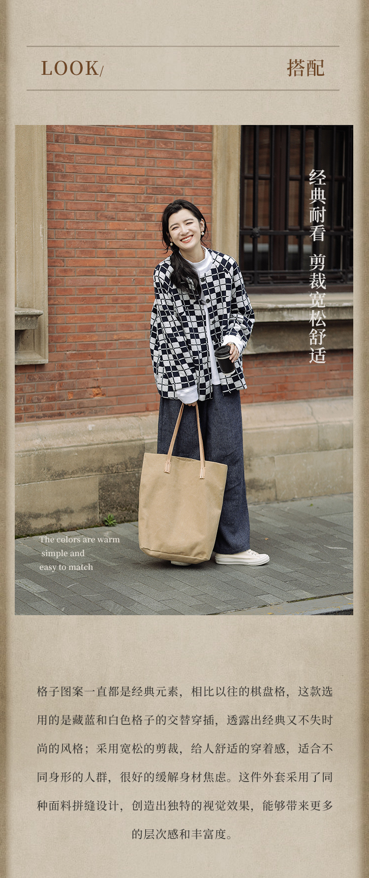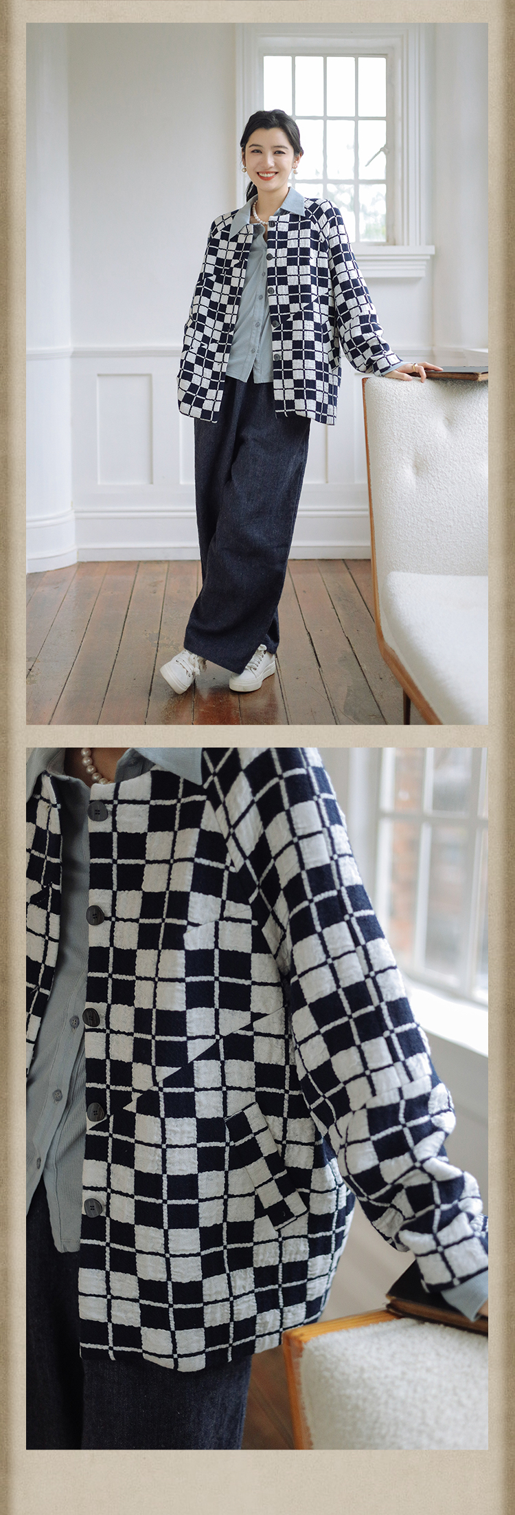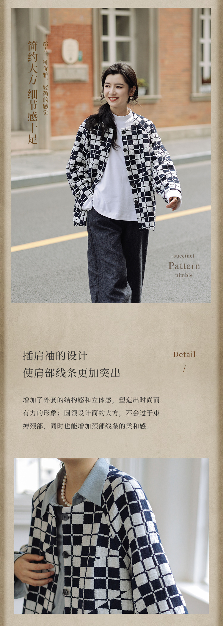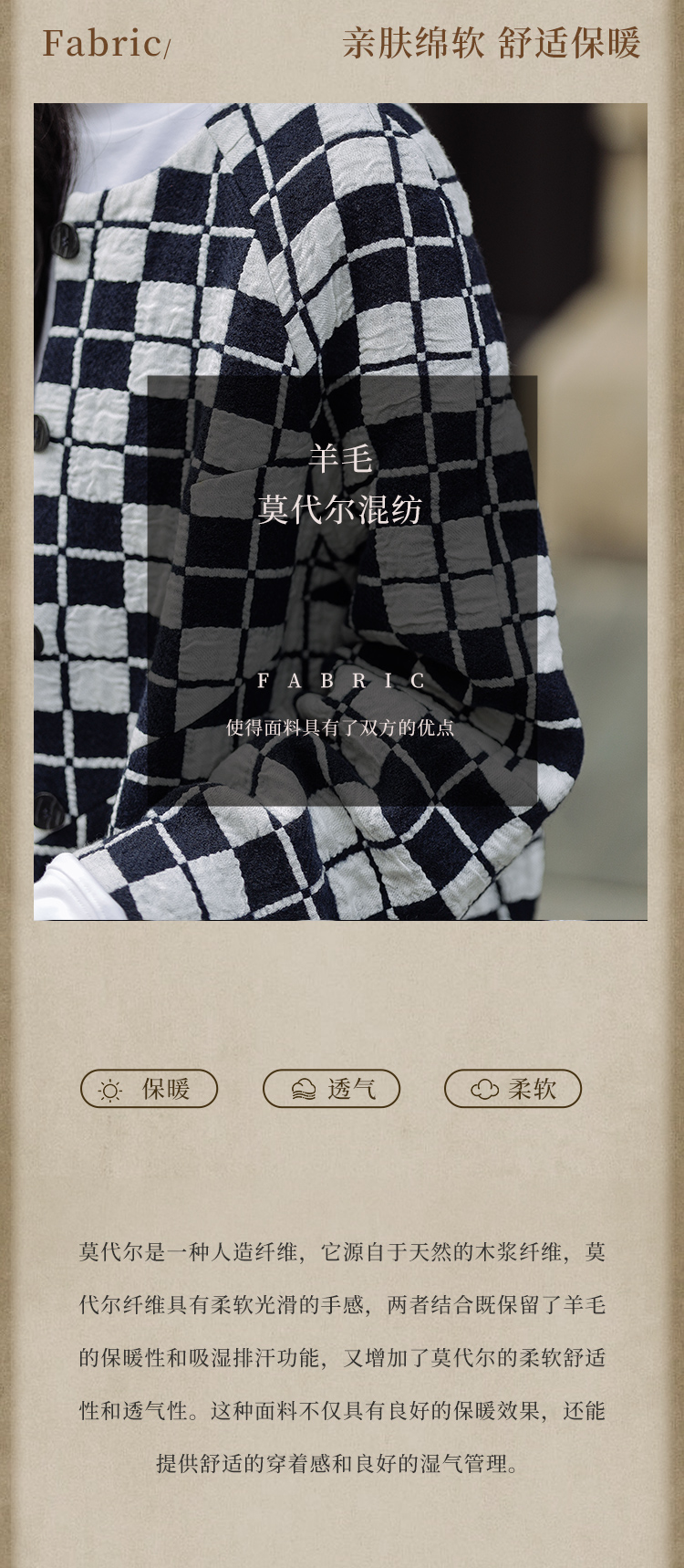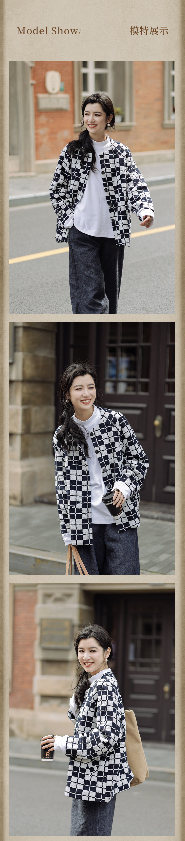 绽放735朵/复古棋盘格羊毛莫代尔棉立体感插肩袖设计毛呢外套