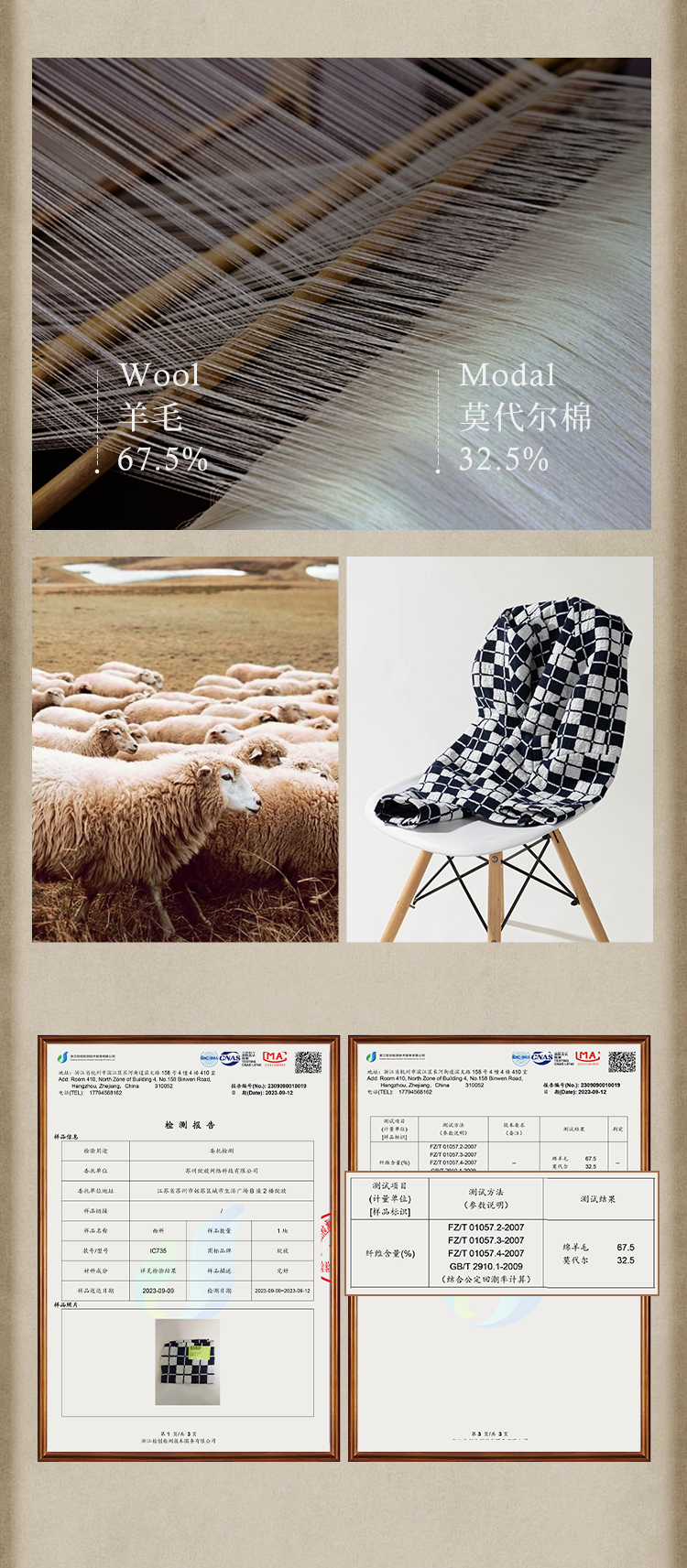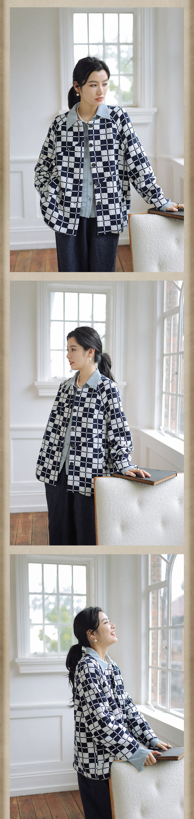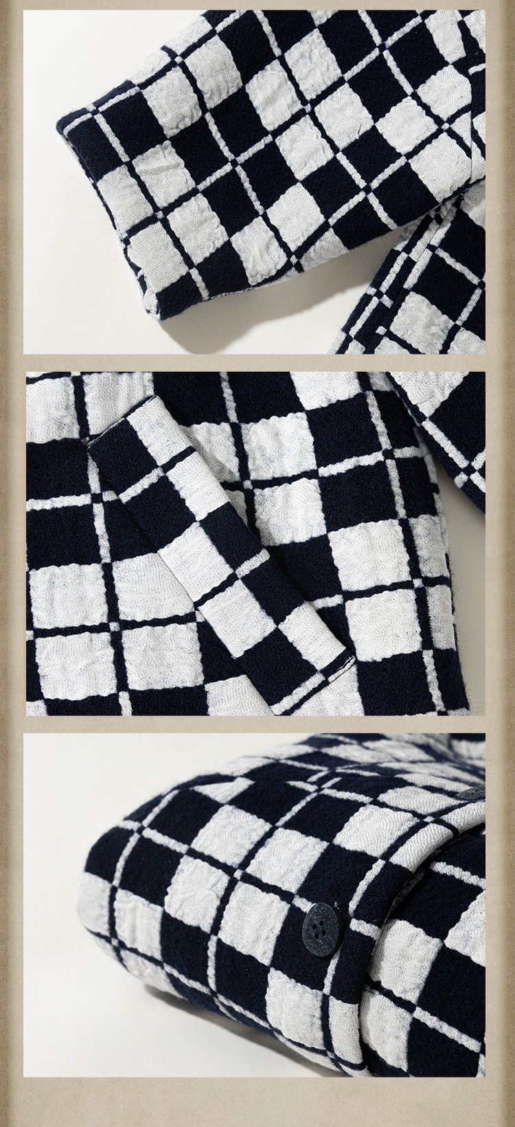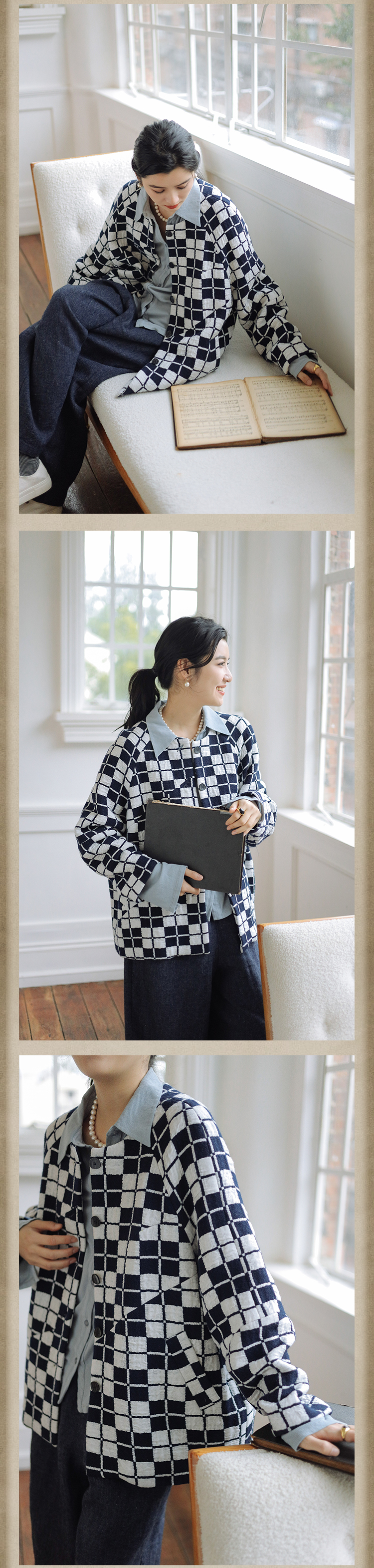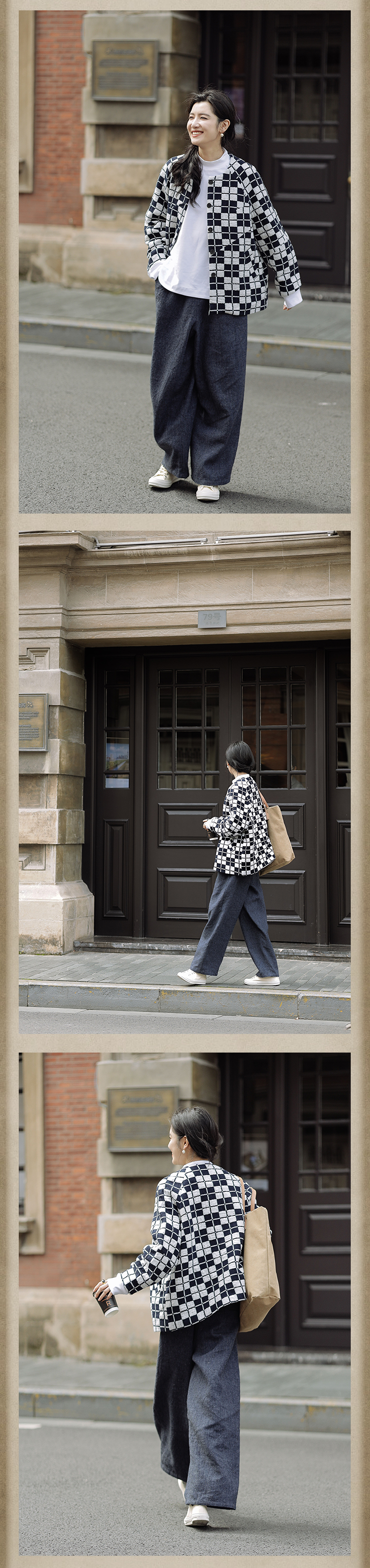绽放735朵/复古棋盘格羊毛莫代尔棉立体感插肩袖设计毛呢外套